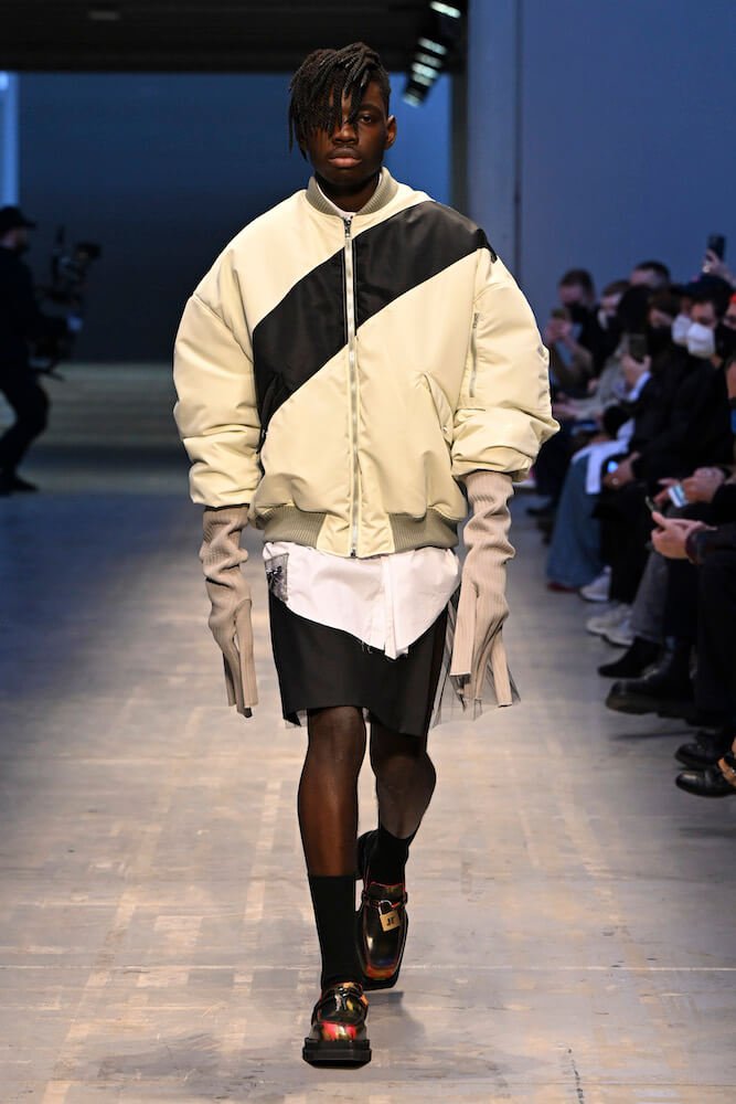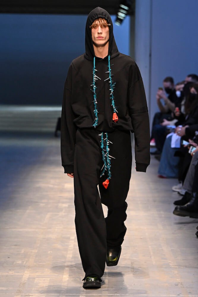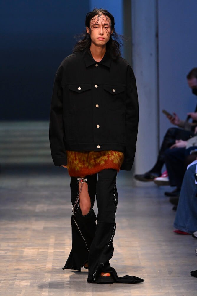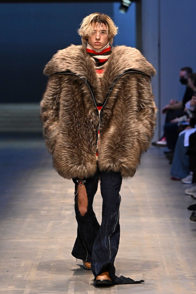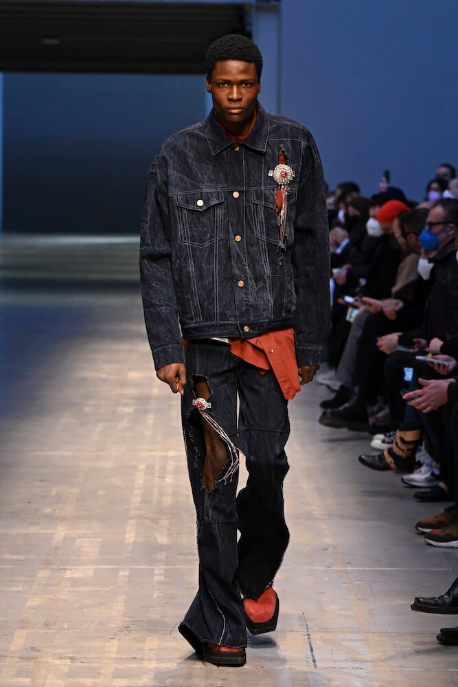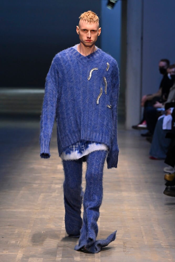 “Rage is a catalyst for creativity,” said the designers in their show notes, with ribbed, woollen gloves with fingers like Slender Man’s being the most anarchist ingredient of all. Add in broaches worthy of a magpie’s snatch, distressed denim and two, free NFTs to the equation,– guests could scan a barcode upon entry to claim theirs – and you have a young London label full of promise.