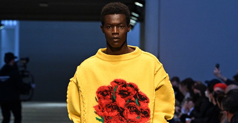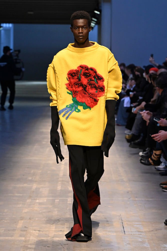 And it showed. This season was the brand’s strongest collection yet, with swollen mohair knits, blazer-school skirt combos and quilted outerwear proving to be super desirable. On the agenda were long lines, boxy shapes and elongated silhouettes – be it oversized jumpers stamped with bouquets of roses, or trousers that were tight on the thigh before falling into distressed flared hems that pooled over gothic loafers.
