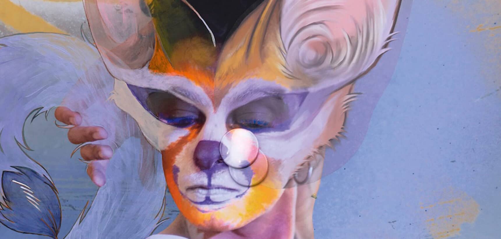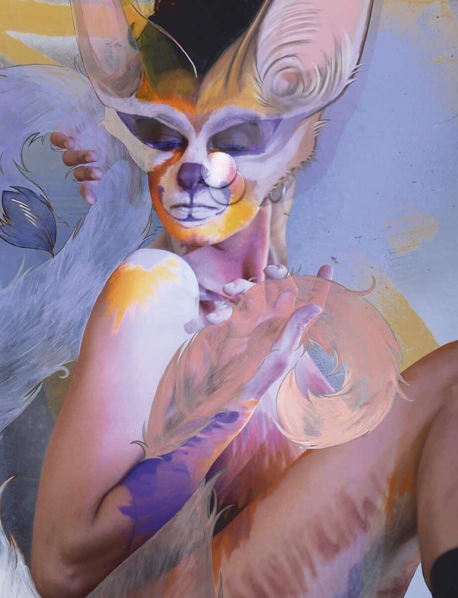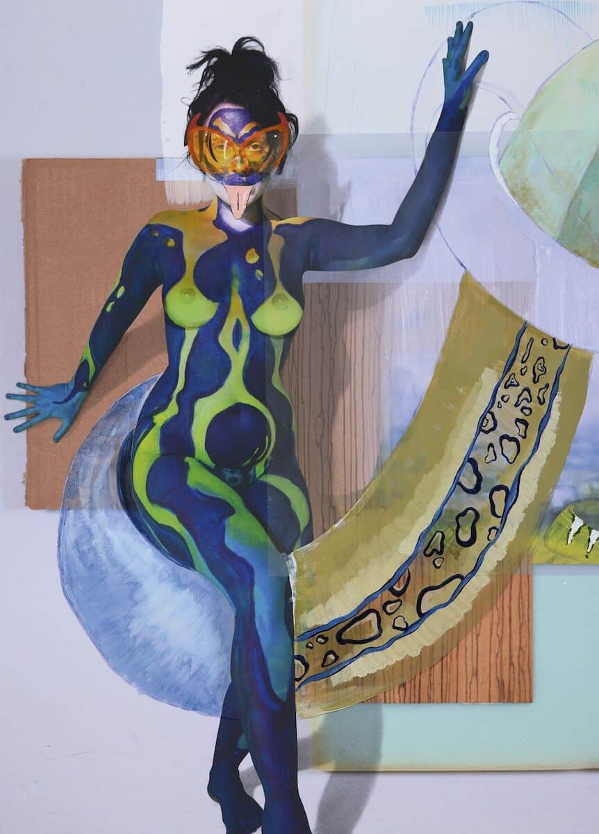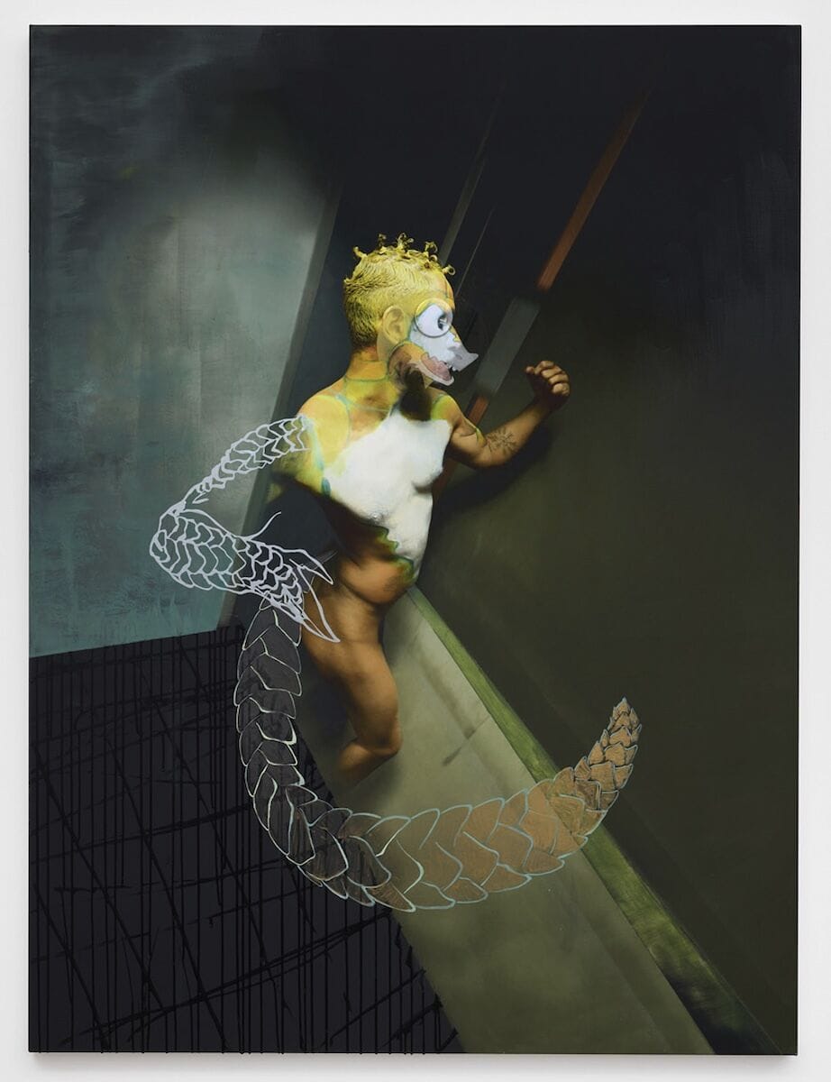 Huxtable’s flame-ombréd braids and cat-eyed slap betray a fiery and playful personality. She’s quick-witted, moving from critical theory to saucy anecdotes, prioritising pleasure and leisure above all else. Nonetheless, her practice is the real deal. Last October, she reminded London of just this, taking over the East End gallery Project Native Informant with Heads & Tails in the Struggle for Iconicity, an exhibition made up of what she calls ‘fursonas’ – in essence, zoomorphised portraits of friends. Iggy Anarchy shows a clawed, amphibious human morphing into their surroundings, clad only in Speedos. Then there is Pangs, a well-hung avian himbo with dino-spiked hair and a canine mouth. And Arthro Anarchy, the caterpillar-tailed, insectoid human caught mid-scuttle on a domestic triptych.