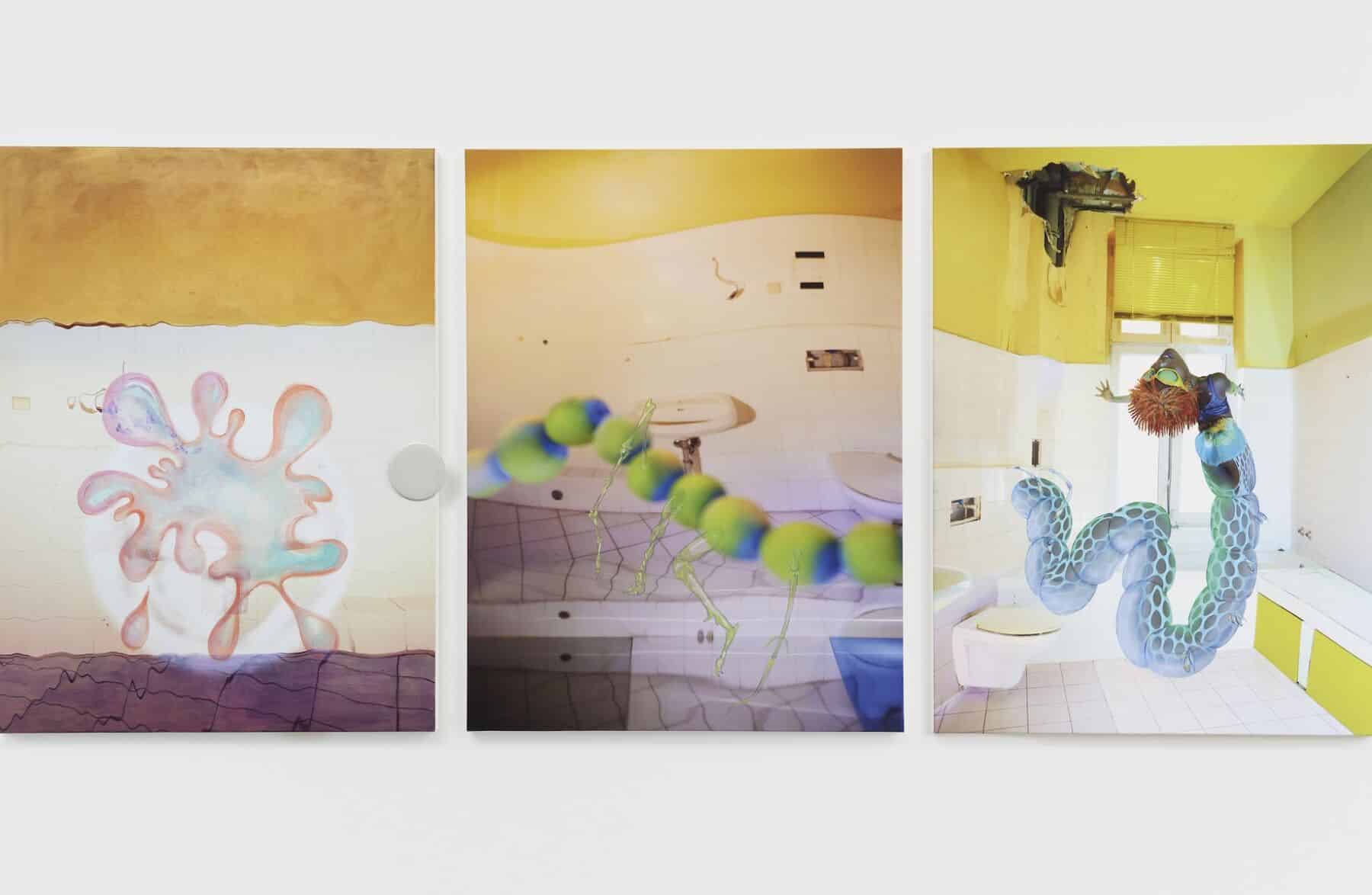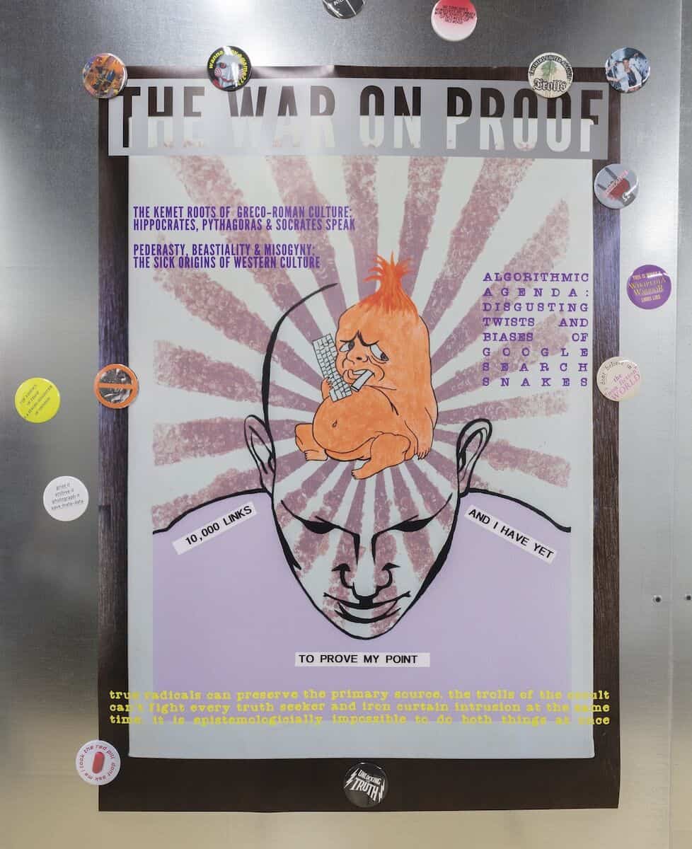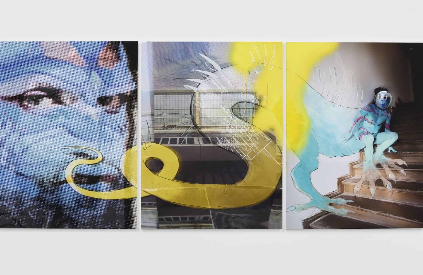 Juliana Huxtable, ‘I Know Your Little Fast Tail Aint Outside Again’, 2024; acrylic, button and vinyl stickers on printed canvas, 152 x 114.6 x 4 cm, photography by Stephen James, courtesy of the artist and Project Native Informant, London; Juliana Huxtable, ‘The War on Proof’, 2017, photography courtesy of the artist and Reena Spaulings Fine Art, NY