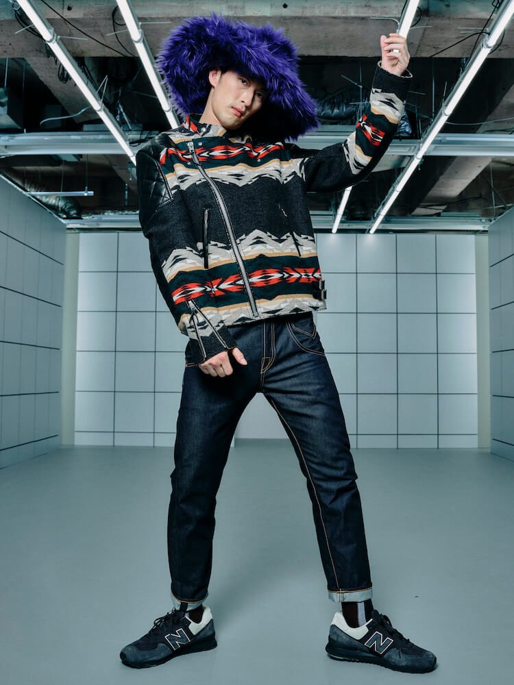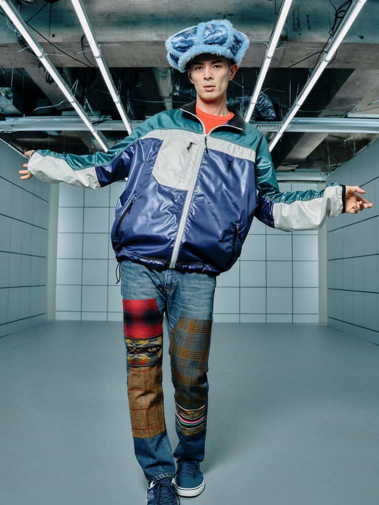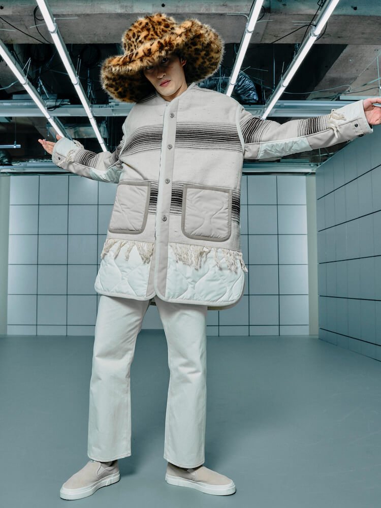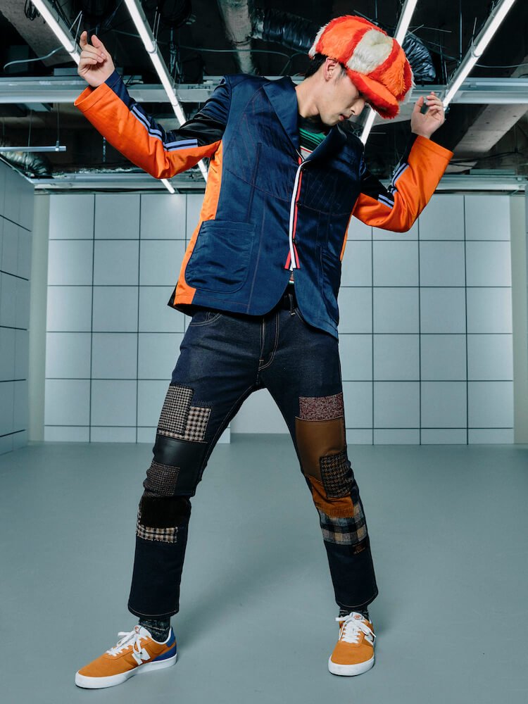 Popping-and-locking their way around the room, models wore Jay Kay-inspired togs: top-heavy parkas worn with skinny patchwork jeans, rolled up to reveal a new low-top sneaker collab with New Balance. The designer also worked with both Levi’s and Carhartt, creating ace trenchcoats spliced with both brands’ workwear denim.
