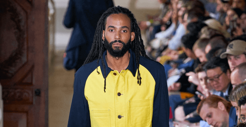 Was the inspiration behind these new “garment-fusions”, how fashion people now dress? And the gesture of a coach jacket pulled over the top half of a suit inspired the above, now, single, fused garment? It was gestural and knowing: if Junya is guilty of anything, it is understanding what fashion-conscious men want to wear (and how they wear it). This meant wide camel chinos and even wider dark denim jeans. Workwear jackets – all manner – but the white one with the St John’s restaurants logo printed on the chest was best. Another logo – the “Amsterdam Tulip Museum” – came stitched to the breast pocket of a coat. There were logos on the shoppers too – one had colourful scribbles over it.