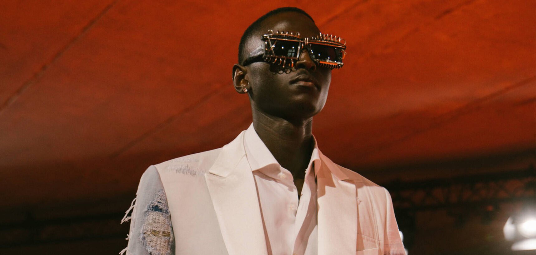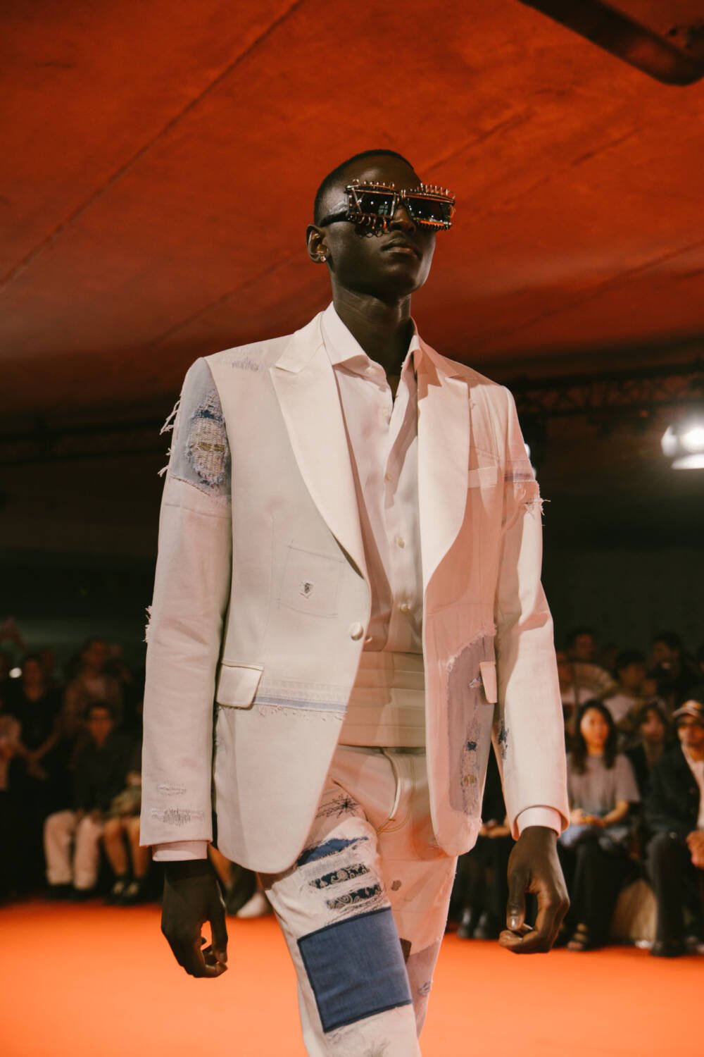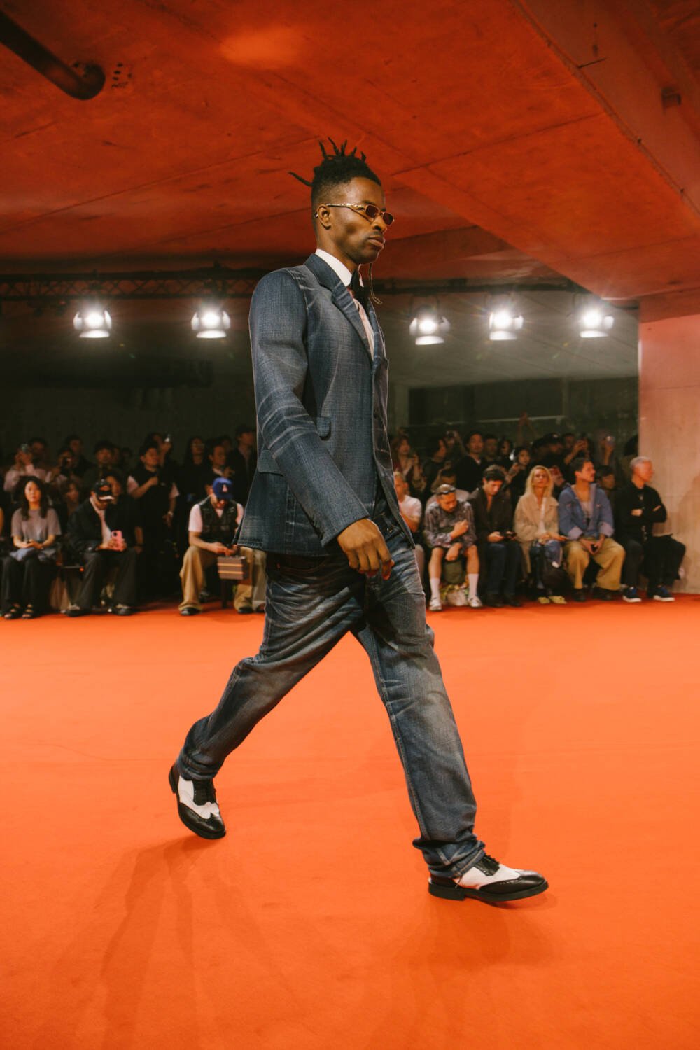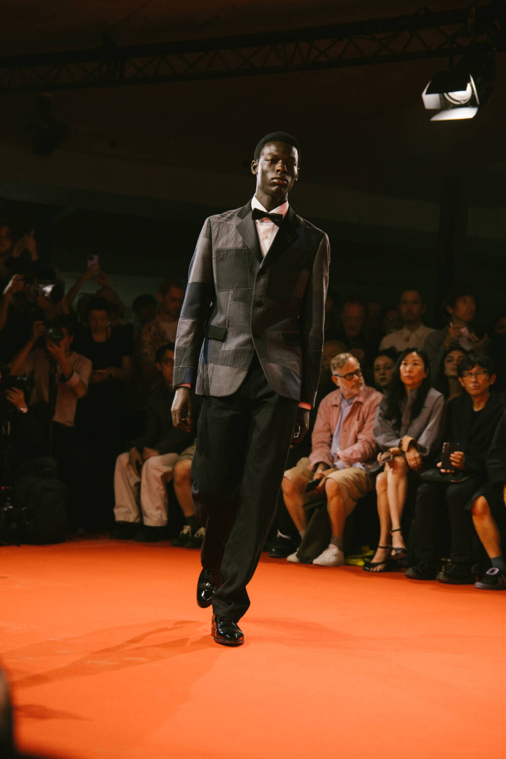 Always the avid collaborator, Watanabe tapped Levi’s, CPFM, New Balance, Kuboraum, Tricker’s and Innerraum for a number of the pieces. While CPFM’s designworks were printed onto a silk scarf that was patched into jeans or used to elevate tops, Innerraum created a tech leather backpack and New Balance unveiled a new co-designed trainer. Tricker’s grommet-pierced patent leather brogues and Kuboraum’s paparazzi-proof sunglasses took special occasion dressing to new dimensions. It was a great exploration of the traditional and the innovative, laced with Watanabe’s distinctly subversive style.