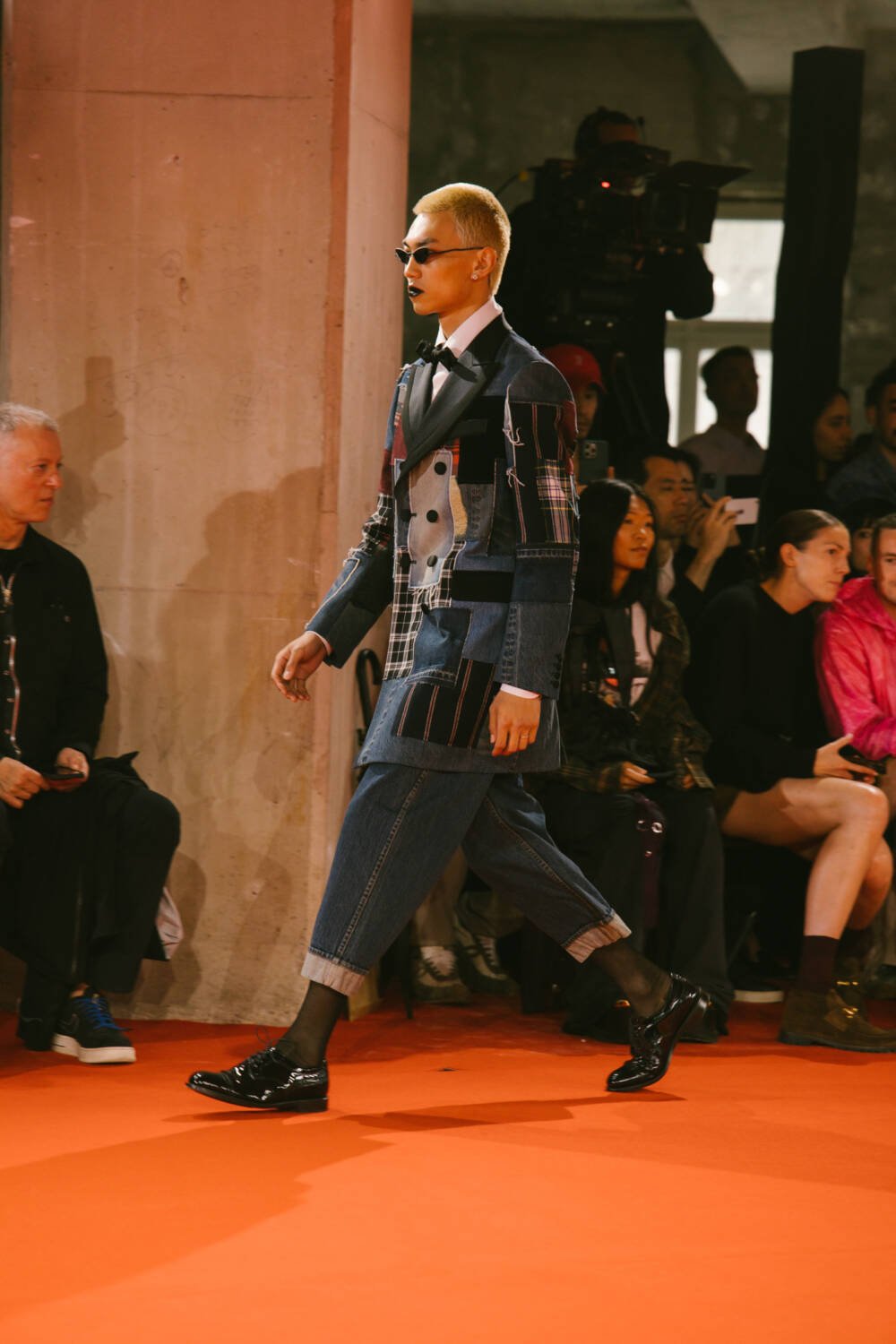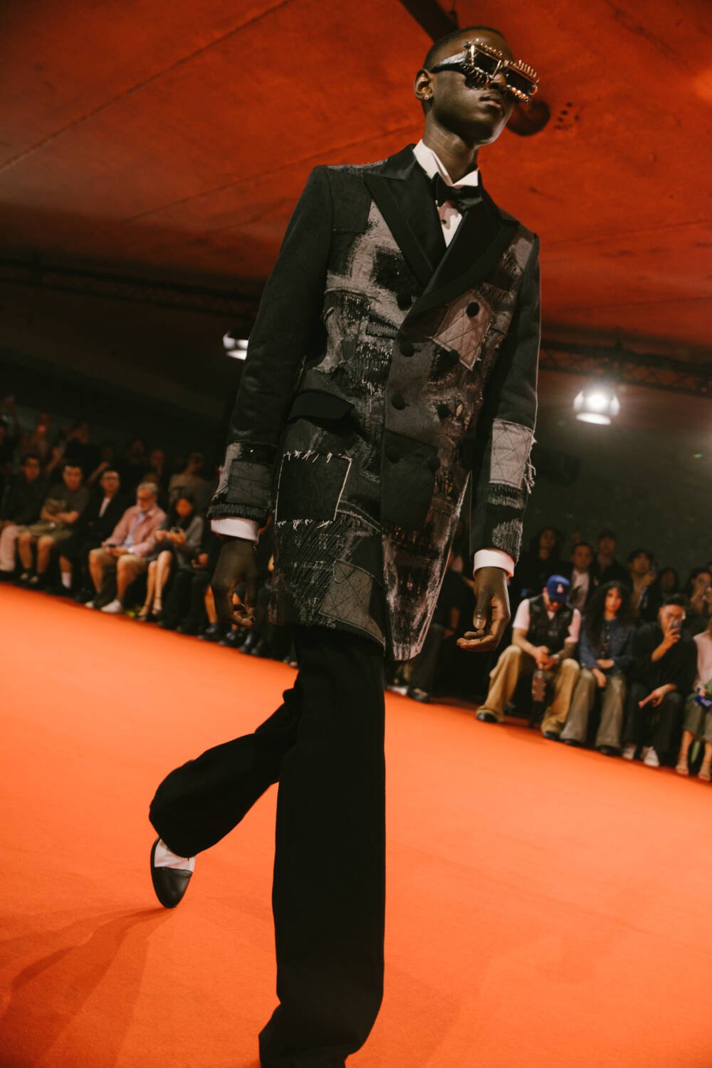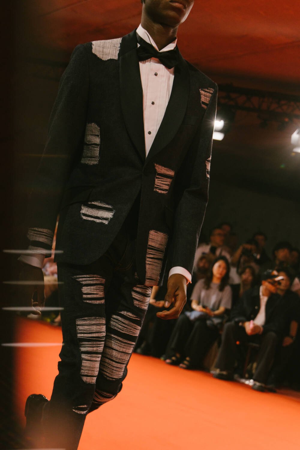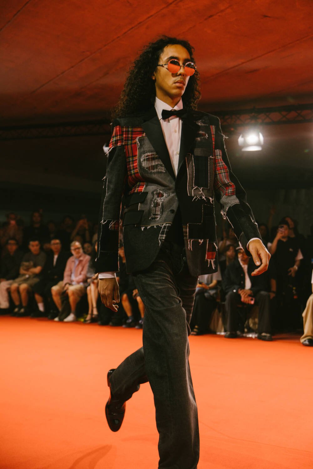With models’ sauntering down a vivid red carpet, the show opened with a patchwork denim peacoat paired with a dapper bow tie for a street-inspired evening wear look. This was followed by a procession of suits in similarly chopped-up denim styles – Watanabe’s rendition of the Canadian tuxedo. Some were baggy and flowed out from the arms like capes whilst others were fitted to the models’ figures for a cleaner, more classical look. Later, there were ACDC, Scorpions and Black Sabbath graphic T-shirts, bringing a rocker touch to a collection doused in grunge design codes.