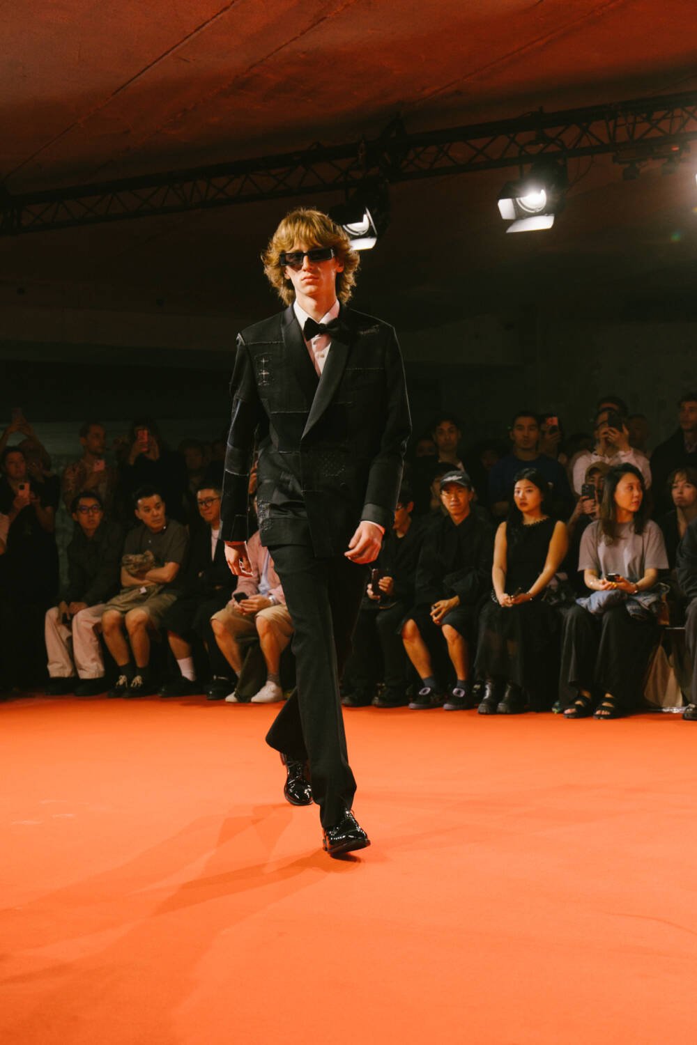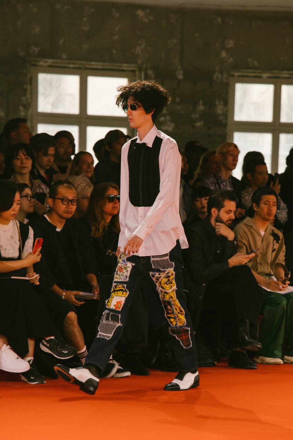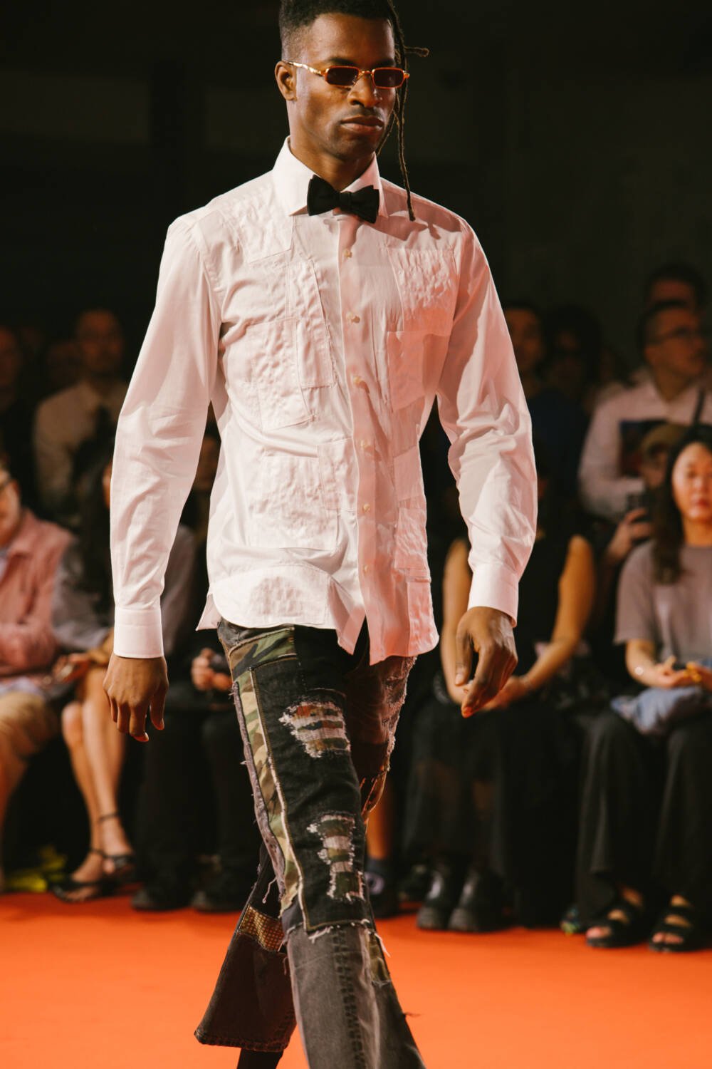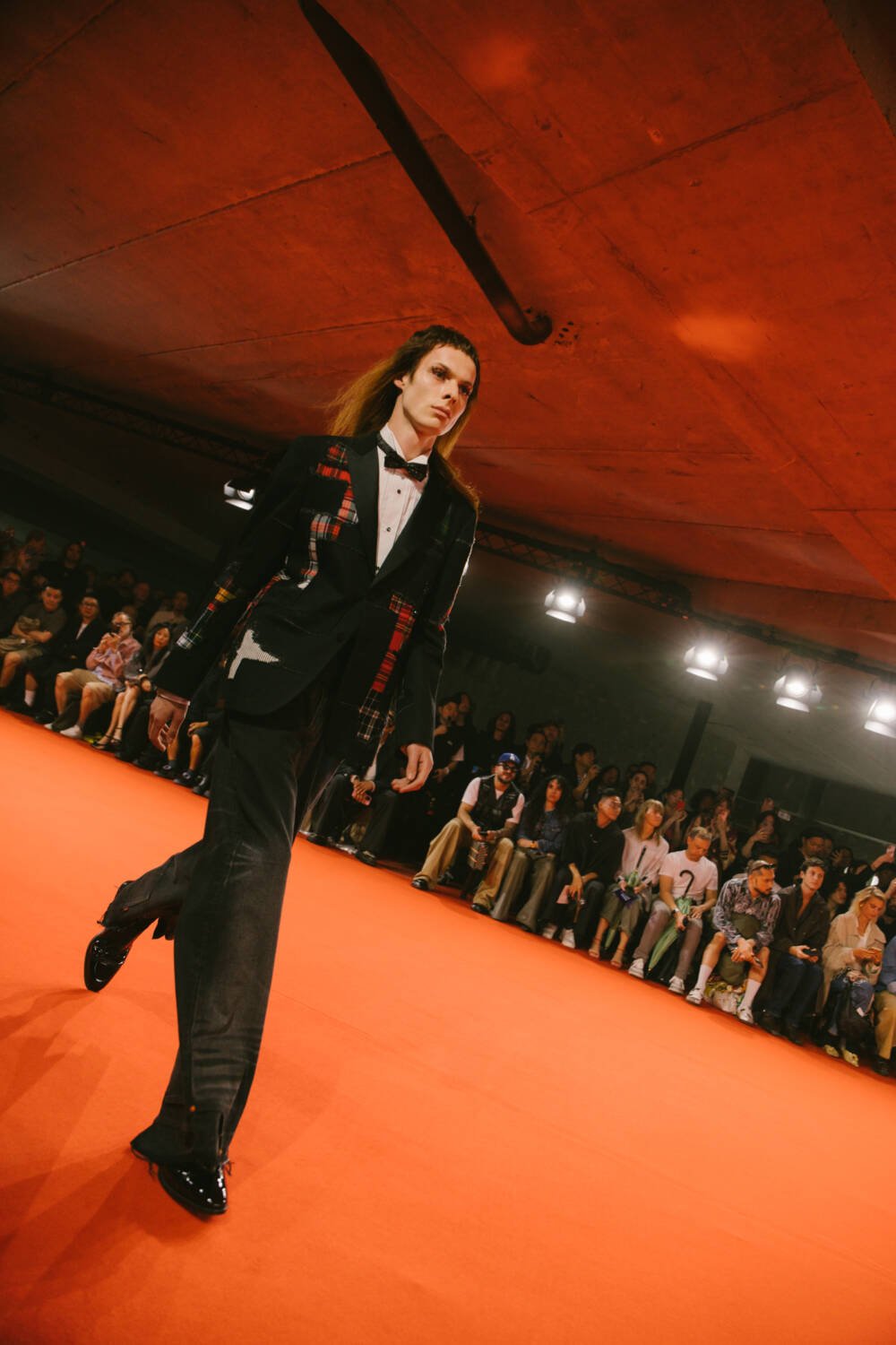 With models’ sauntering down a vivid red carpet, the show opened with a patchwork denim peacoat paired with a dapper bow tie for a street-inspired evening wear look. This was followed by a procession of suits in similarly chopped-up denim styles – Watanabe’s rendition of the Canadian tuxedo. Some were baggy and flowed out from the arms like capes whilst others were fitted to the models’ figures for a cleaner, more classical look. Later, there were ACDC, Scorpions and Black Sabbath graphic T-shirts, bringing a rocker touch to a collection doused in grunge design codes.