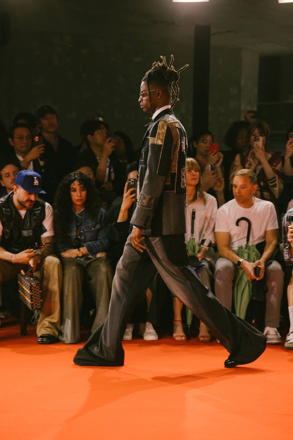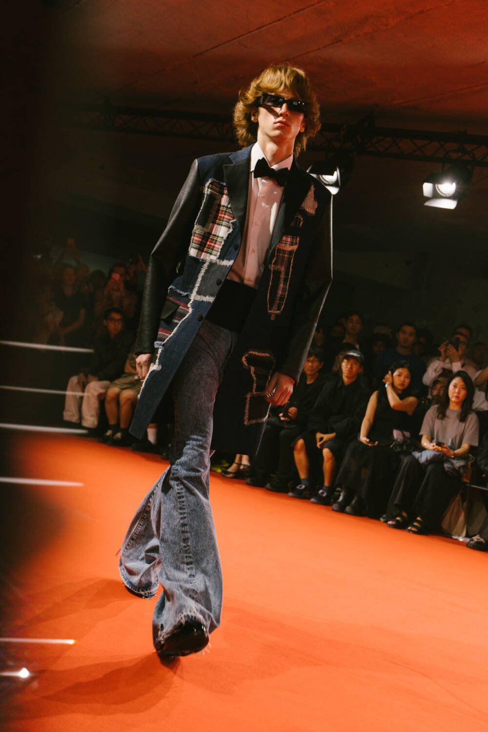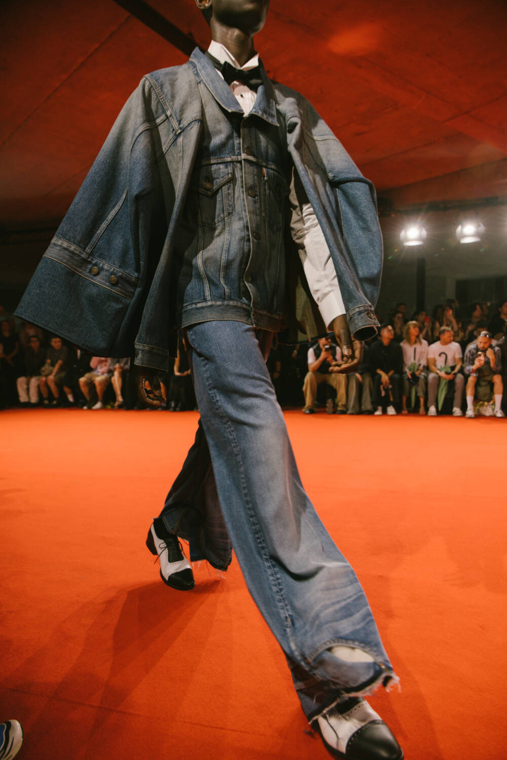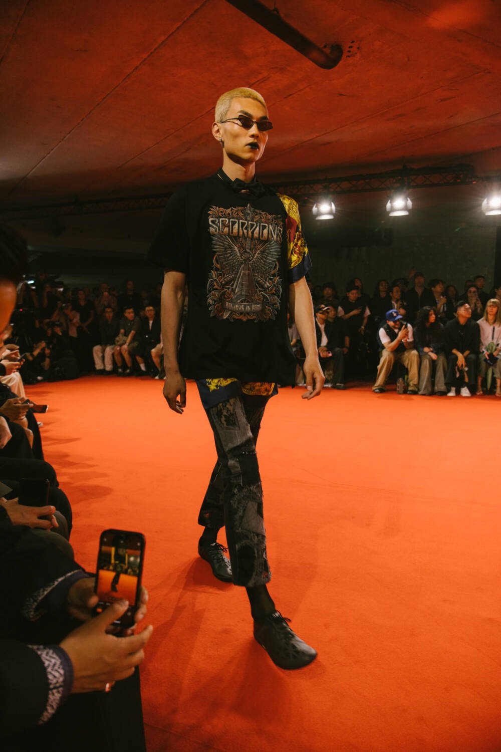With models’ sauntering down a vivid red carpet, the show opened with a patchwork denim peacoat paired with a dapper bow tie for a street-inspired evening wear look. This was followed by a procession of suits in similarly chopped-up denim styles – Watanabe’s rendition of the Canadian tuxedo. Some were baggy and flowed out from the arms like capes whilst others were fitted to the models’ figures for a cleaner, more classical look. Later, there were ACDC, Scorpions and Black Sabbath graphic T-shirts, bringing a rocker touch to a collection doused in grunge design codes.