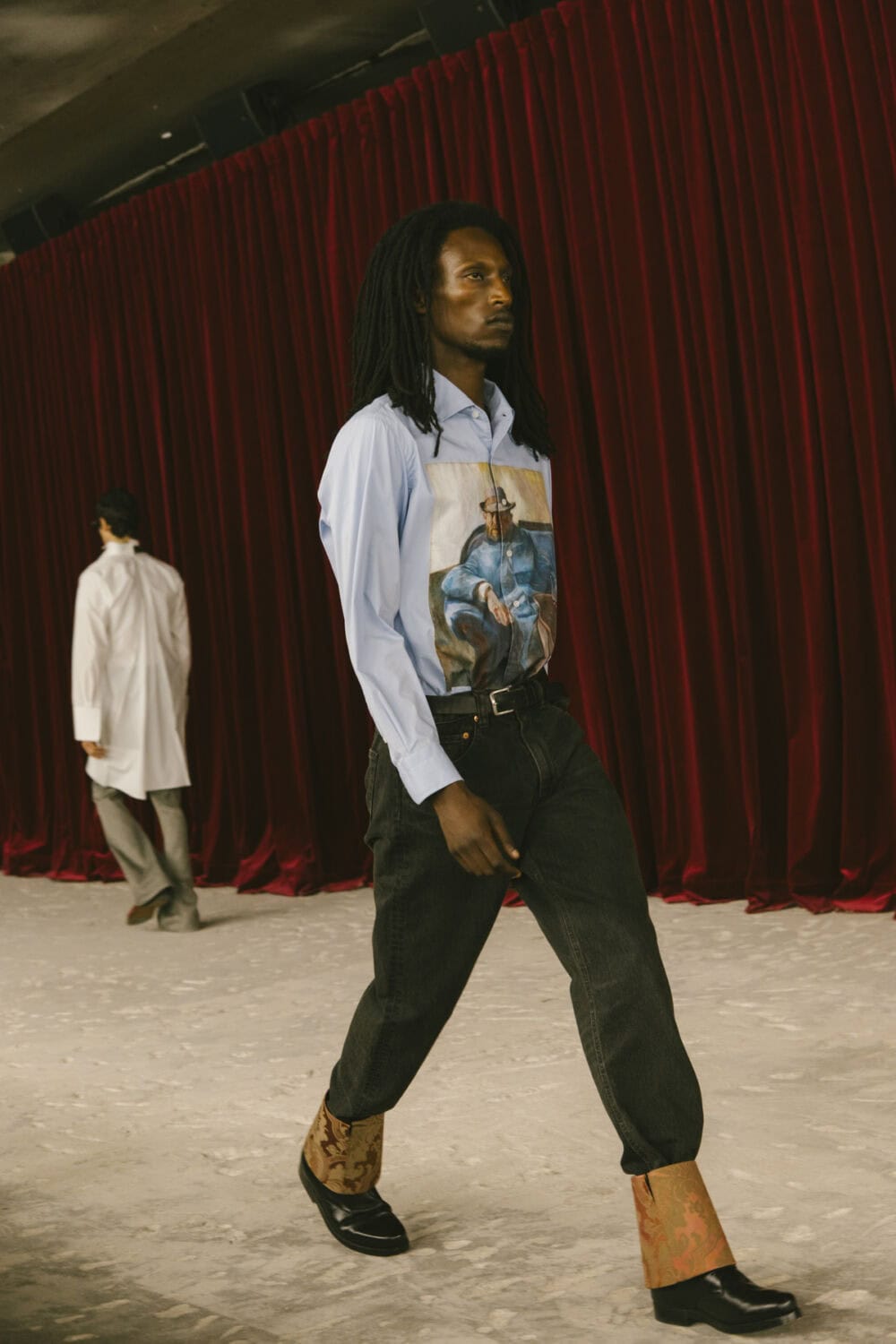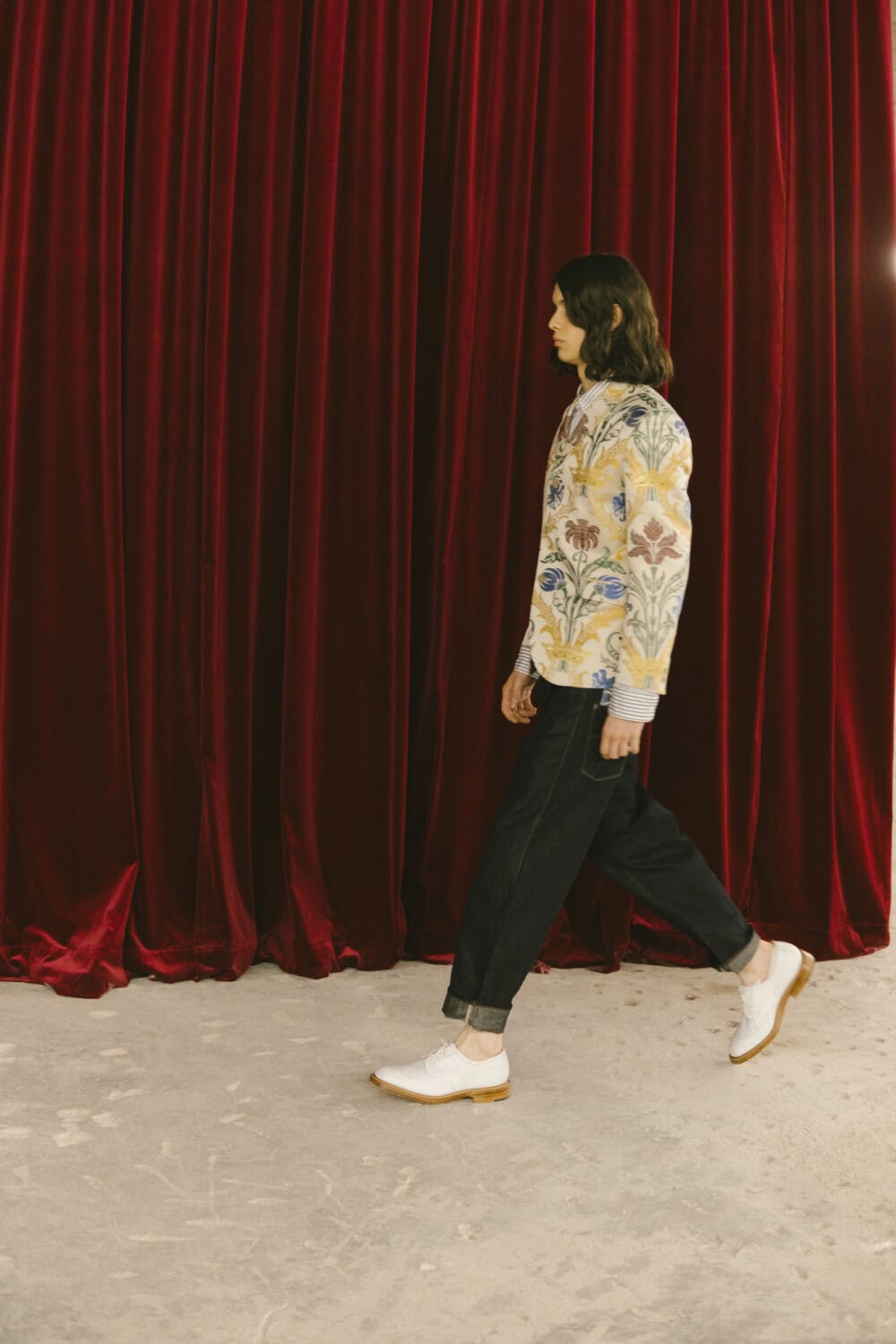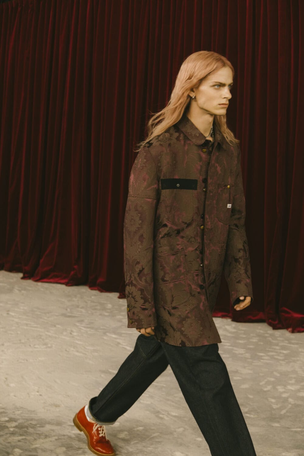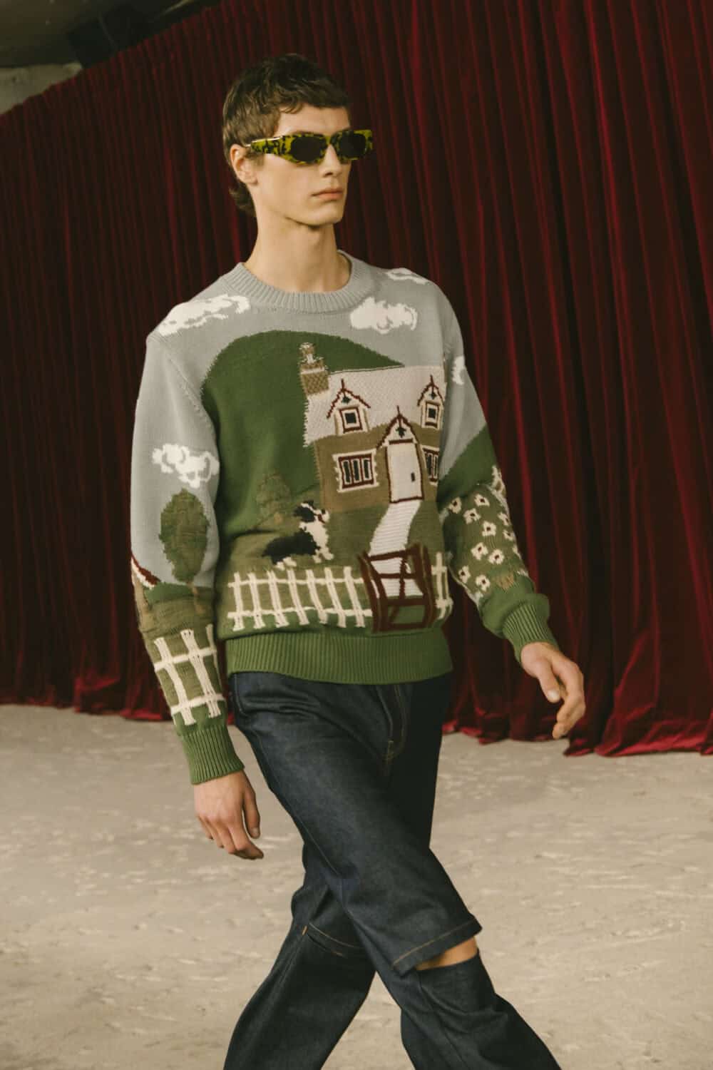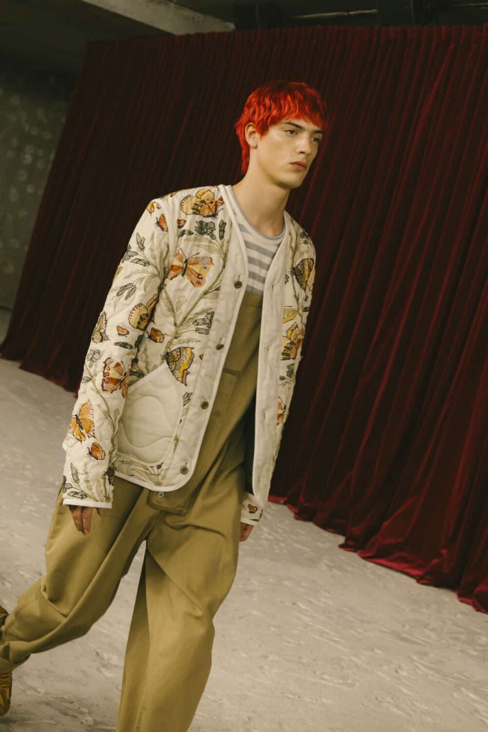 Watanabe pulled from his usual playbook – patchworking, layering and a love of heritage fabrics – but this season felt looser, more relaxed. Knitwear came pastoral and a bit precious, stitched with rolling hills and grazing sheep like postcards from a farm boy’s daydream. Trousers came baggy, breezy or skinny with a ‘70s-style kick flair. Denim made a strong showing too, in Frankensteined or irregularly-cut jeans, the kind you’d wear to smoke outside a philosophy lecture. Artistic prints – from Munch’s painting depicting anarchist philosopher Hans Jaeger to Elizabeth Peyton’s portraiture – popped up across outerwear and tees, a witty riff on taste itself.