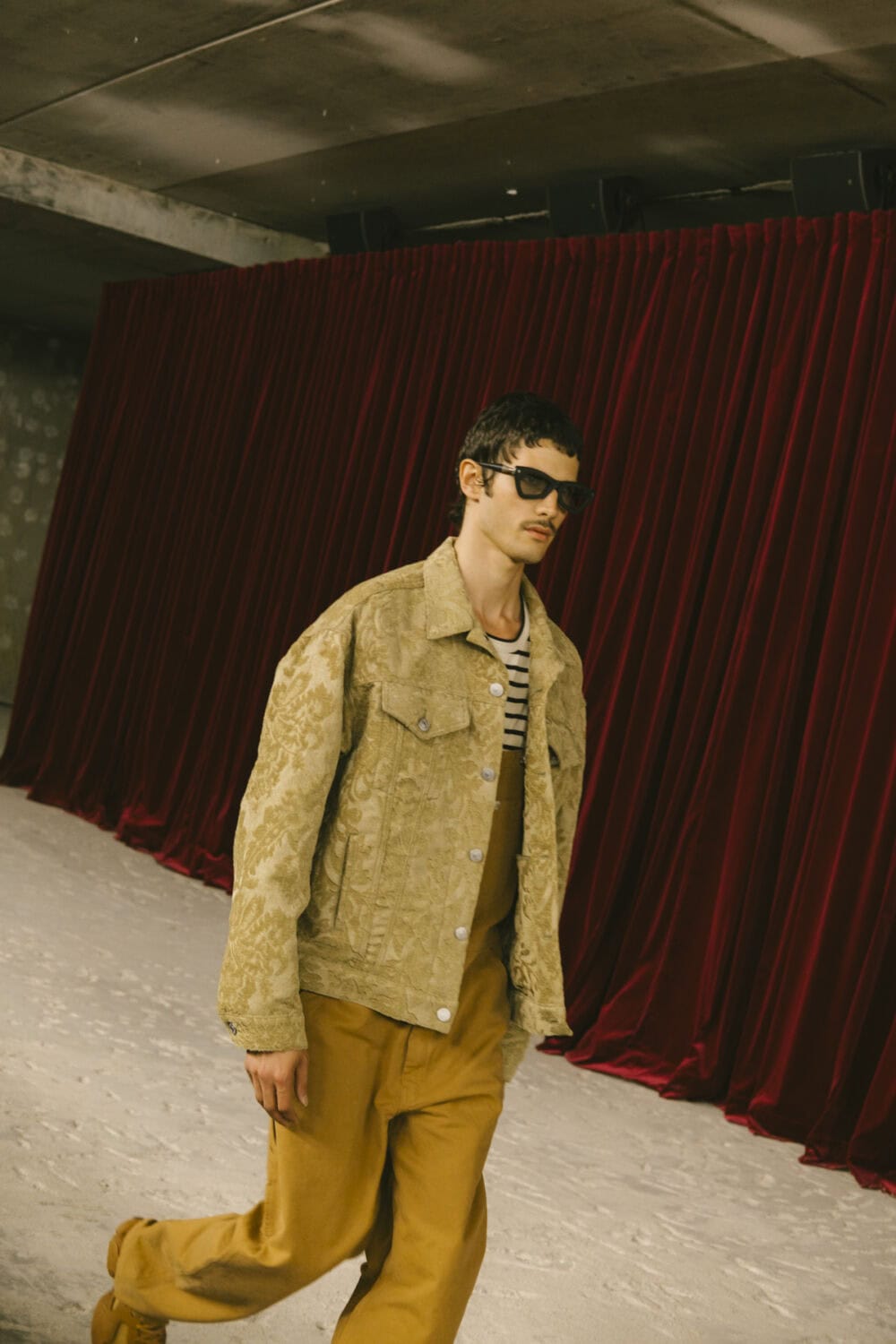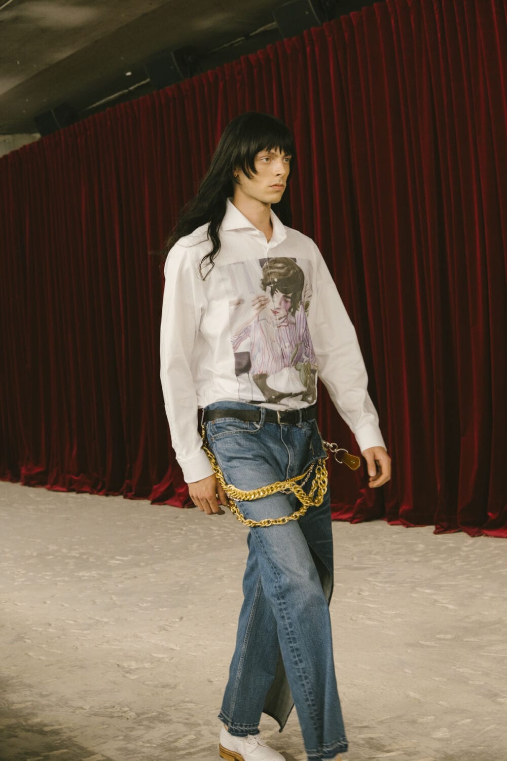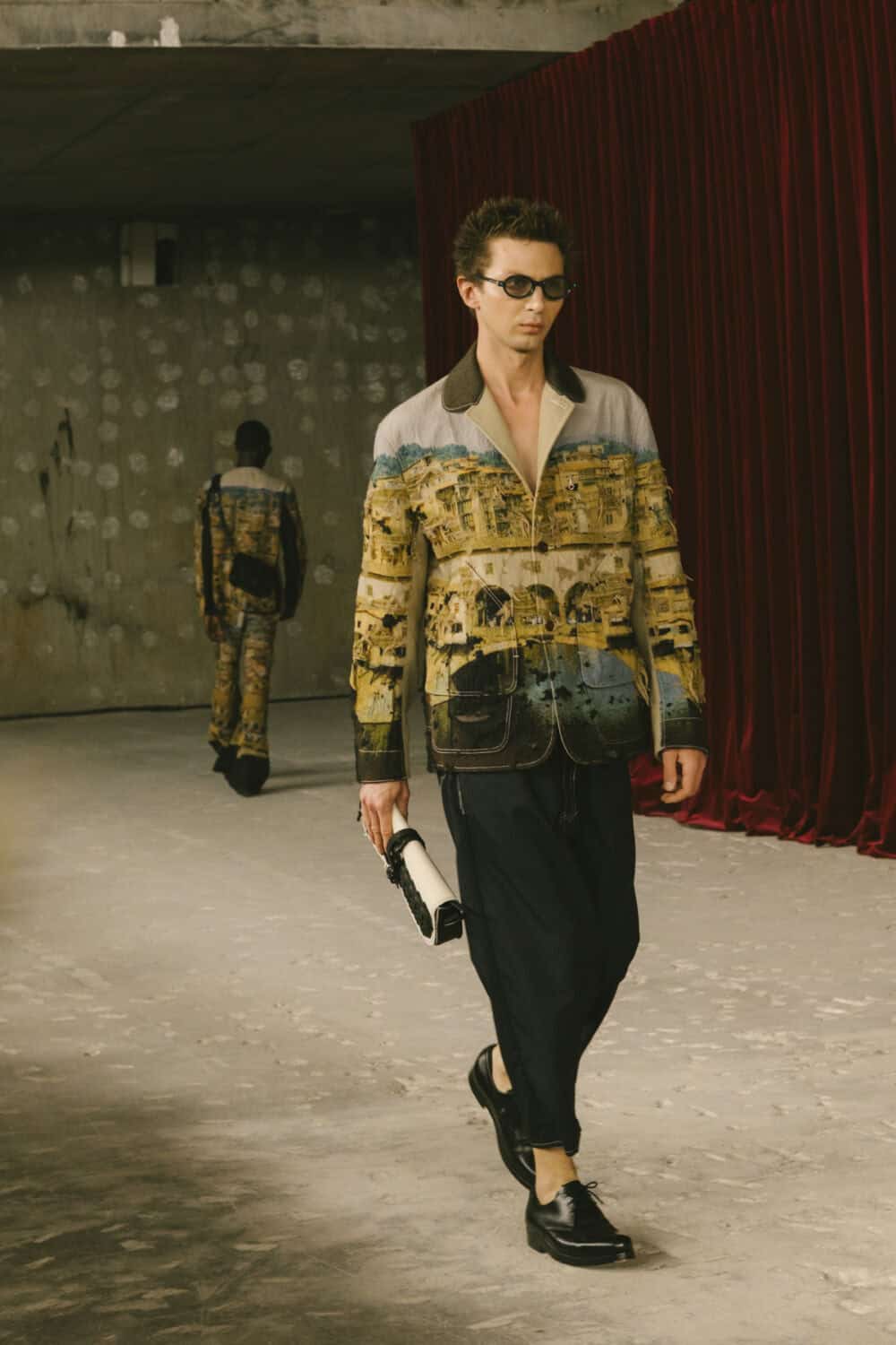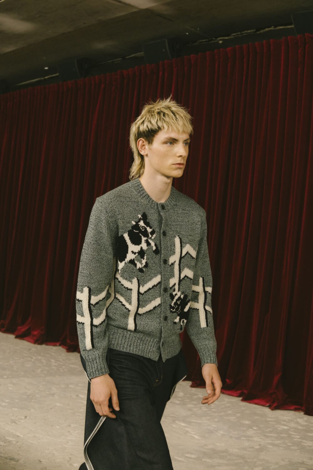 Watanabe pulled from his usual playbook – patchworking, layering and a love of heritage fabrics – but this season felt looser, more relaxed. Knitwear came pastoral and a bit precious, stitched with rolling hills and grazing sheep like postcards from a farm boy’s daydream. Trousers came baggy, breezy or skinny with a ‘70s-style kick flair. Denim made a strong showing too, in Frankensteined or irregularly-cut jeans, the kind you’d wear to smoke outside a philosophy lecture. Artistic prints – from Munch’s painting depicting anarchist philosopher Hans Jaeger to Elizabeth Peyton’s portraiture – popped up across outerwear and tees, a witty riff on taste itself.