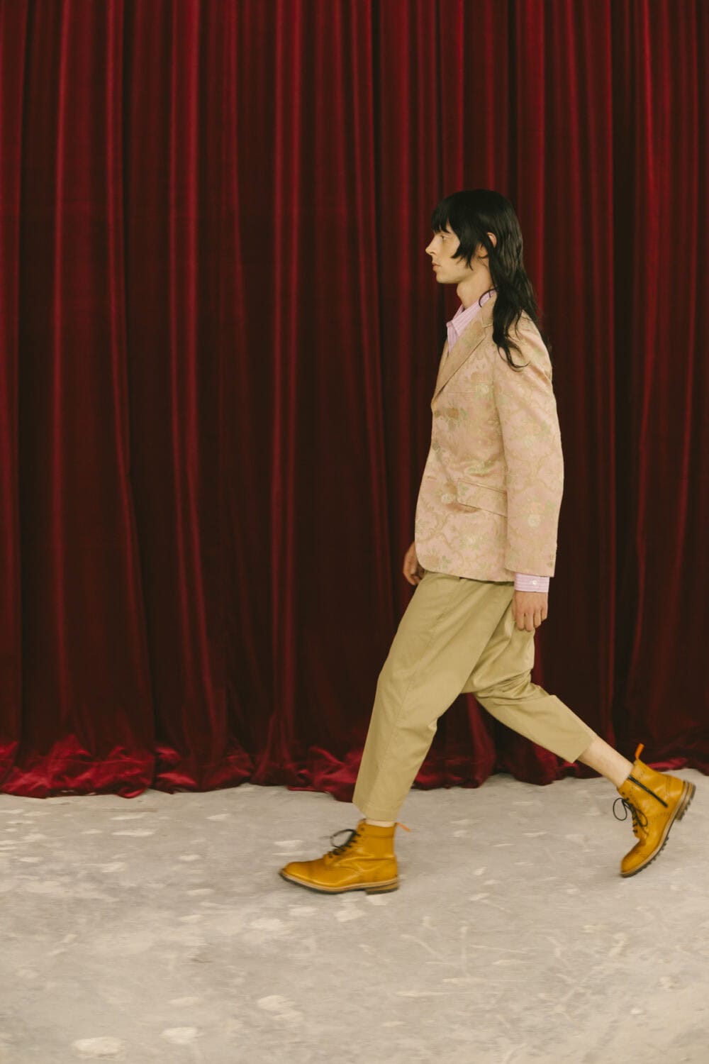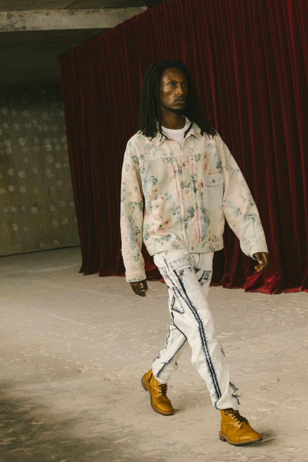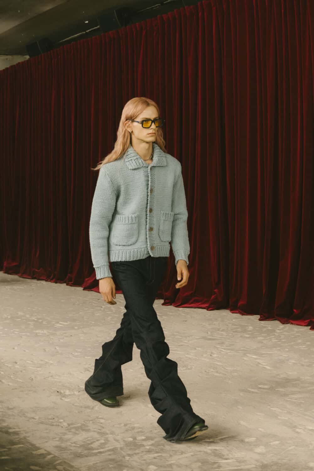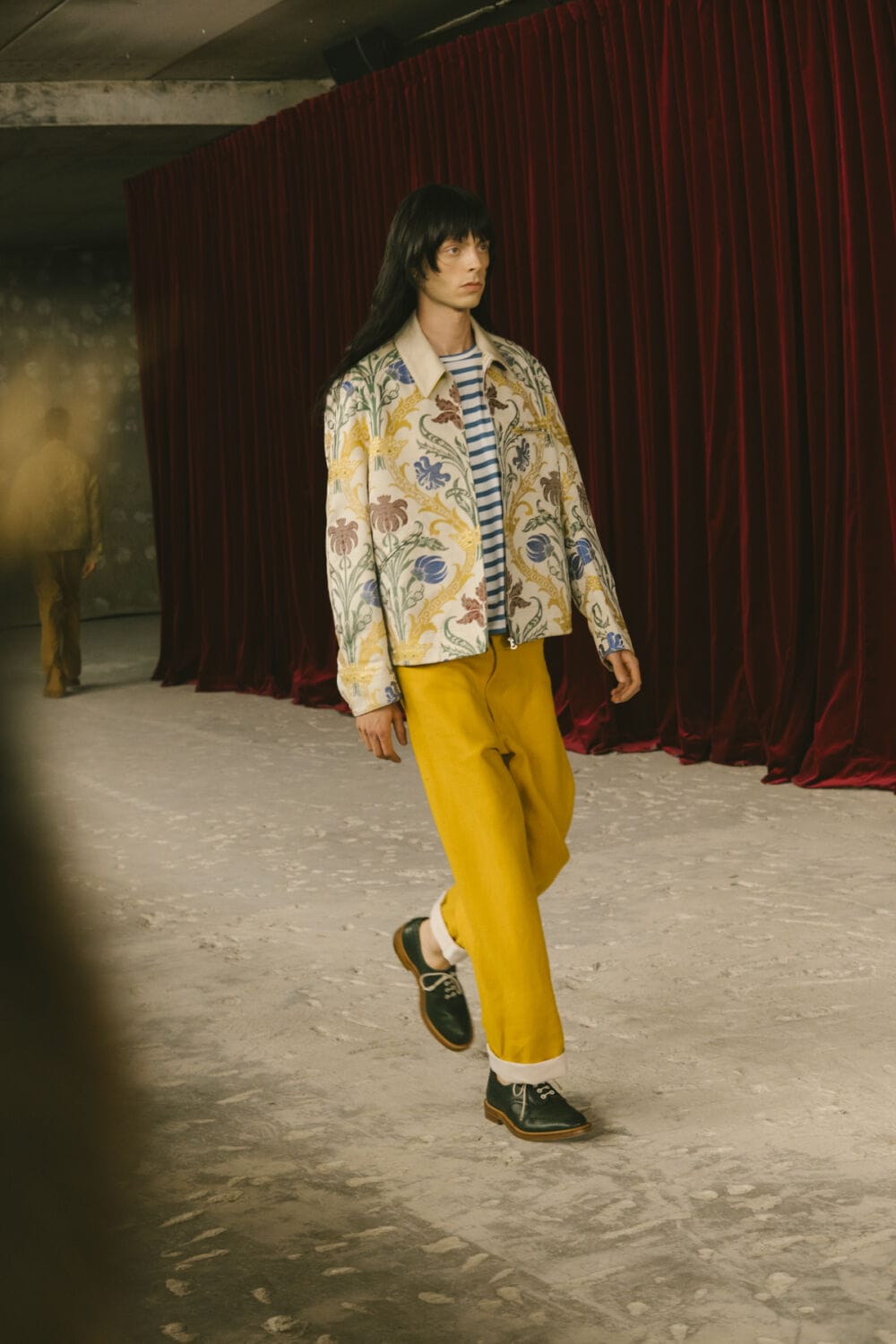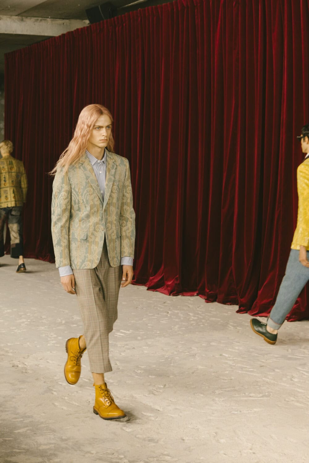 Watanabe pulled from his usual playbook – patchworking, layering and a love of heritage fabrics – but this season felt looser, more relaxed. Knitwear came pastoral and a bit precious, stitched with rolling hills and grazing sheep like postcards from a farm boy’s daydream. Trousers came baggy, breezy or skinny with a ‘70s-style kick flair. Denim made a strong showing too, in Frankensteined or irregularly-cut jeans, the kind you’d wear to smoke outside a philosophy lecture. Artistic prints – from Munch’s painting depicting anarchist philosopher Hans Jaeger to Elizabeth Peyton’s portraiture – popped up across outerwear and tees, a witty riff on taste itself.