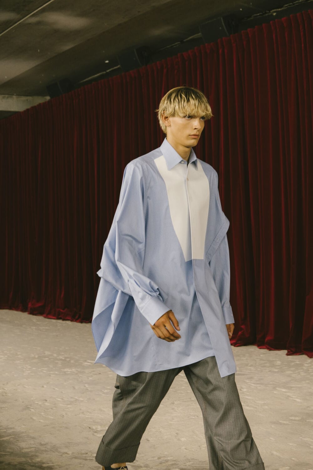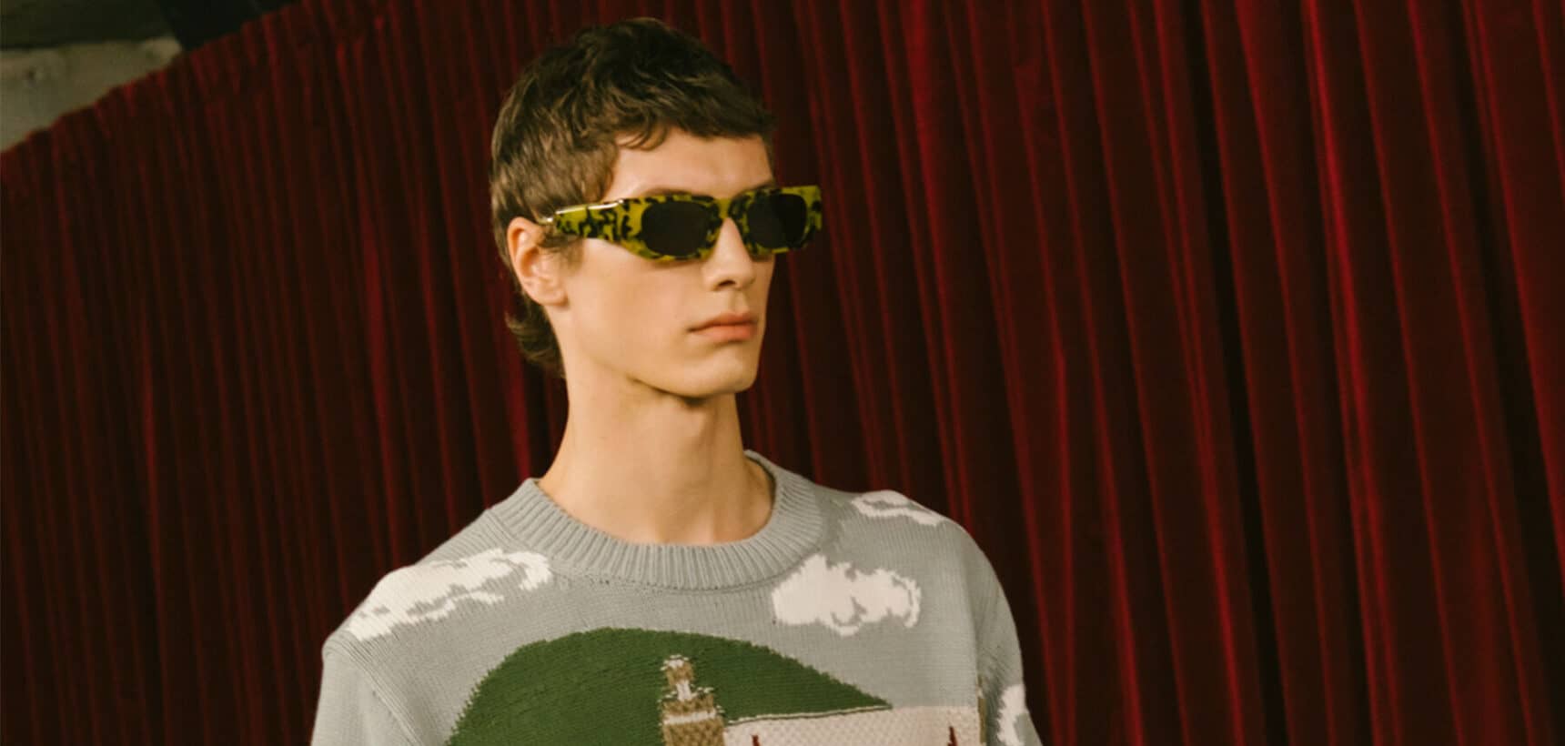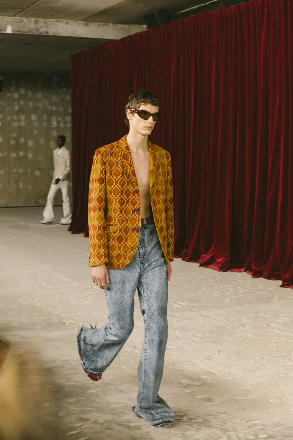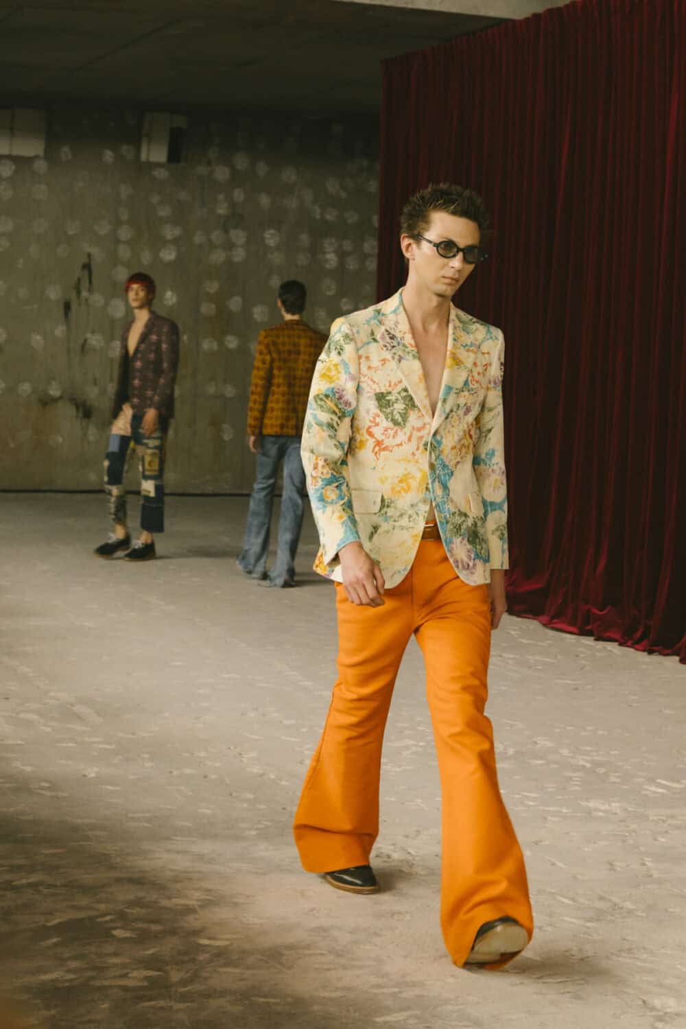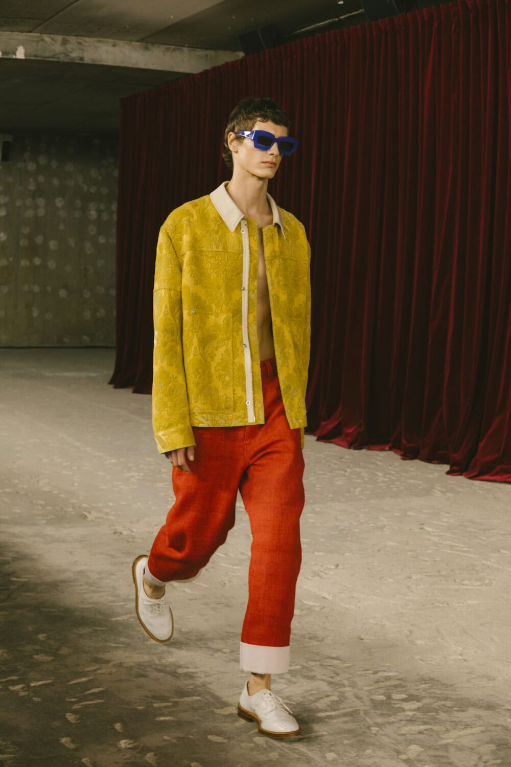 Watanabe pulled from his usual playbook – patchworking, layering and a love of heritage fabrics – but this season felt looser, more relaxed. Knitwear came pastoral and a bit precious, stitched with rolling hills and grazing sheep like postcards from a farm boy’s daydream. Trousers came baggy, breezy or skinny with a ‘70s-style kick flair. Denim made a strong showing too, in Frankensteined or irregularly-cut jeans, the kind you’d wear to smoke outside a philosophy lecture. Artistic prints – from Munch’s painting depicting anarchist philosopher Hans Jaeger to Elizabeth Peyton’s portraiture – popped up across outerwear and tees, a witty riff on taste itself.