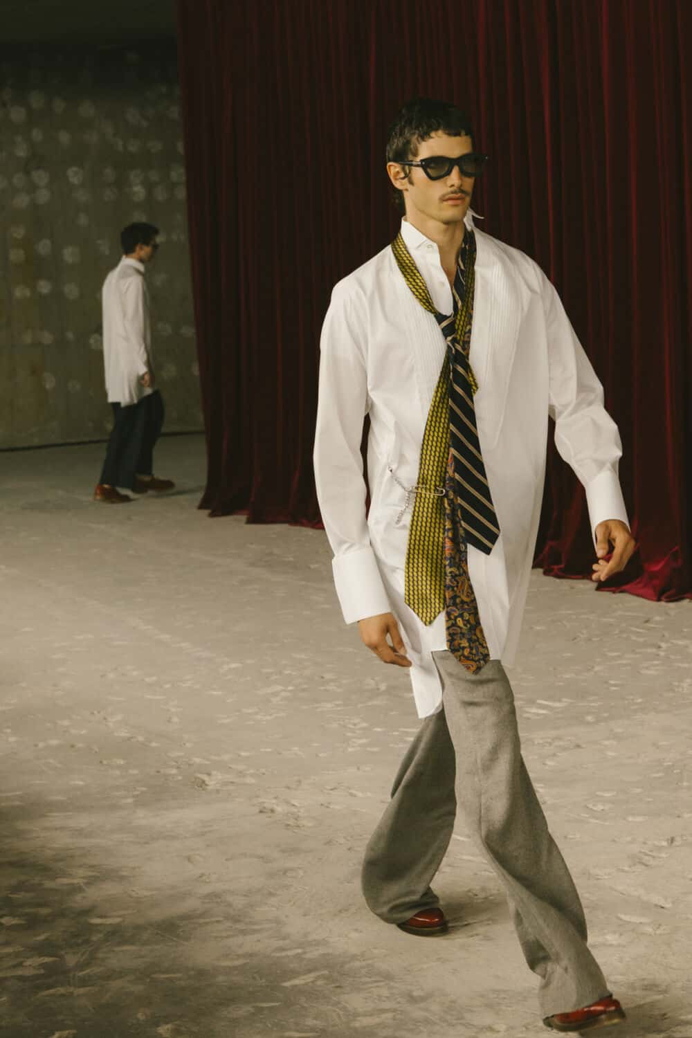 What does the thinking man wear when he’s running late to class but still wants to turn a look? Junya Watanabe has answers. For SS26, the Japanese designer delivered a masterclass in chaotic academia and true to his ethos, straddled the line between antiquity and invention, dressing his models in rococo-inspired jacquards and vintage brocades, only to twist them into something entirely new: blazers askew, ties stacked and undone just so, and trousers that looked like they’d survived a very stylish fall down a library staircase. There were frayed hems, asymmetrical cuts and denim patches where you’d least expect them. Think prep school meets punk squat – tailored blazers, crisp shirts and ties, all roughed up just enough to feel cool rather than precious.