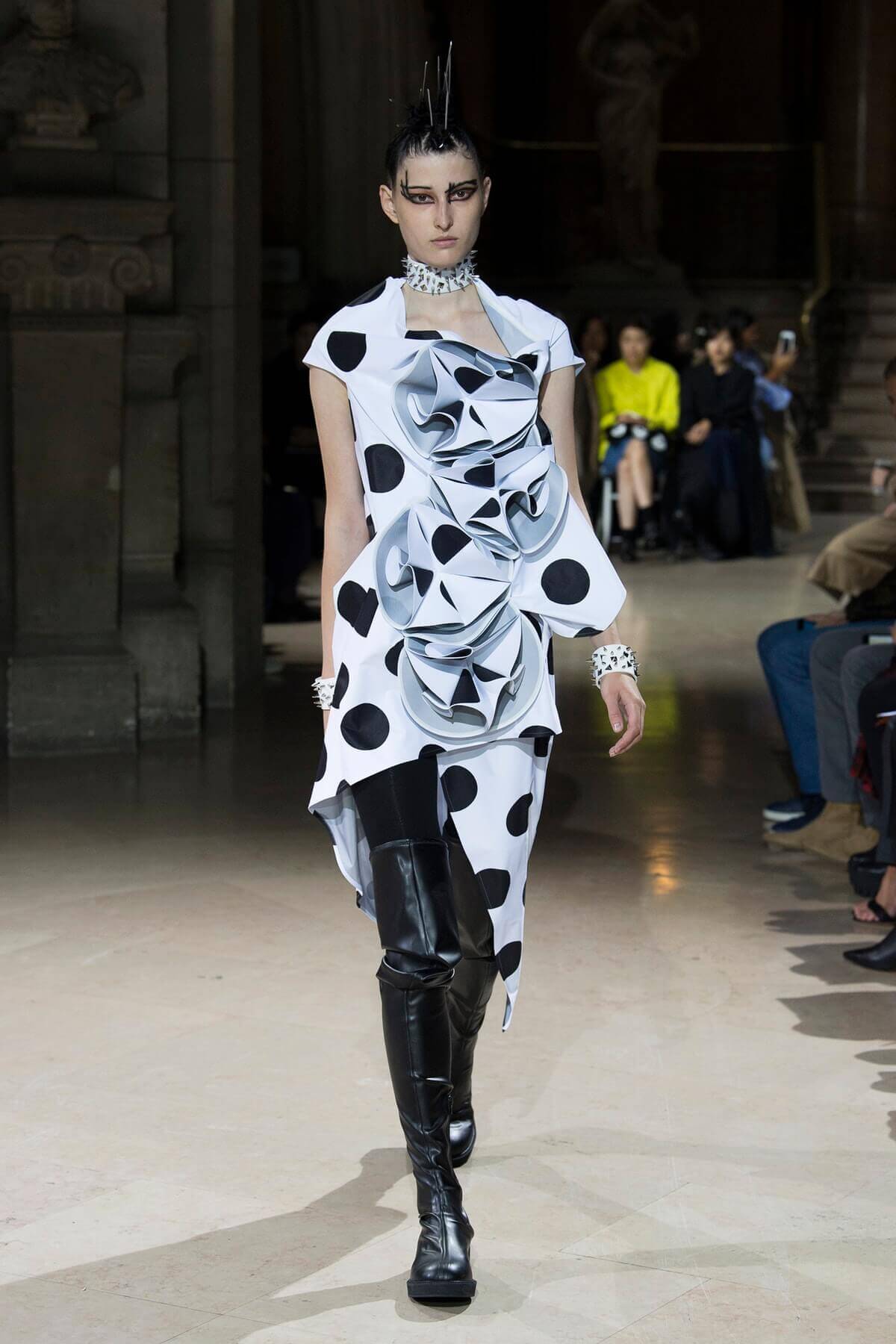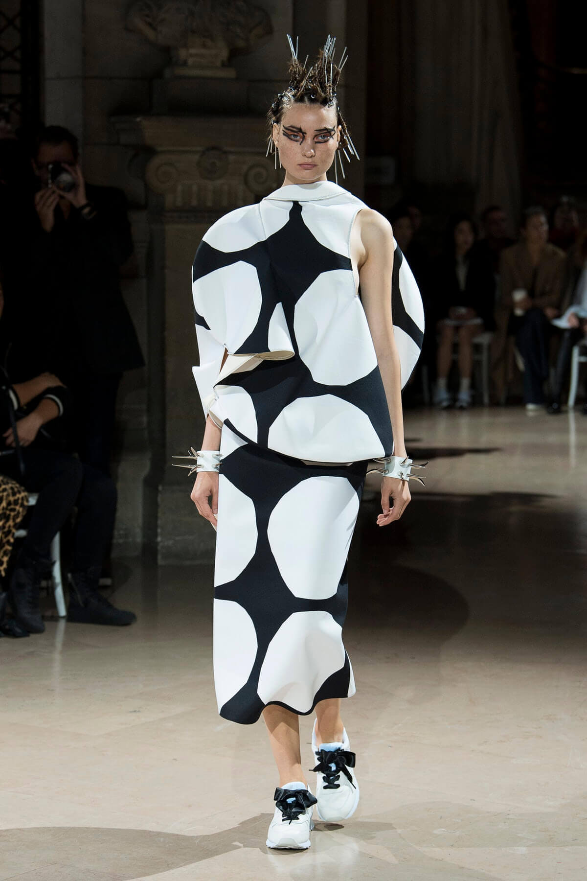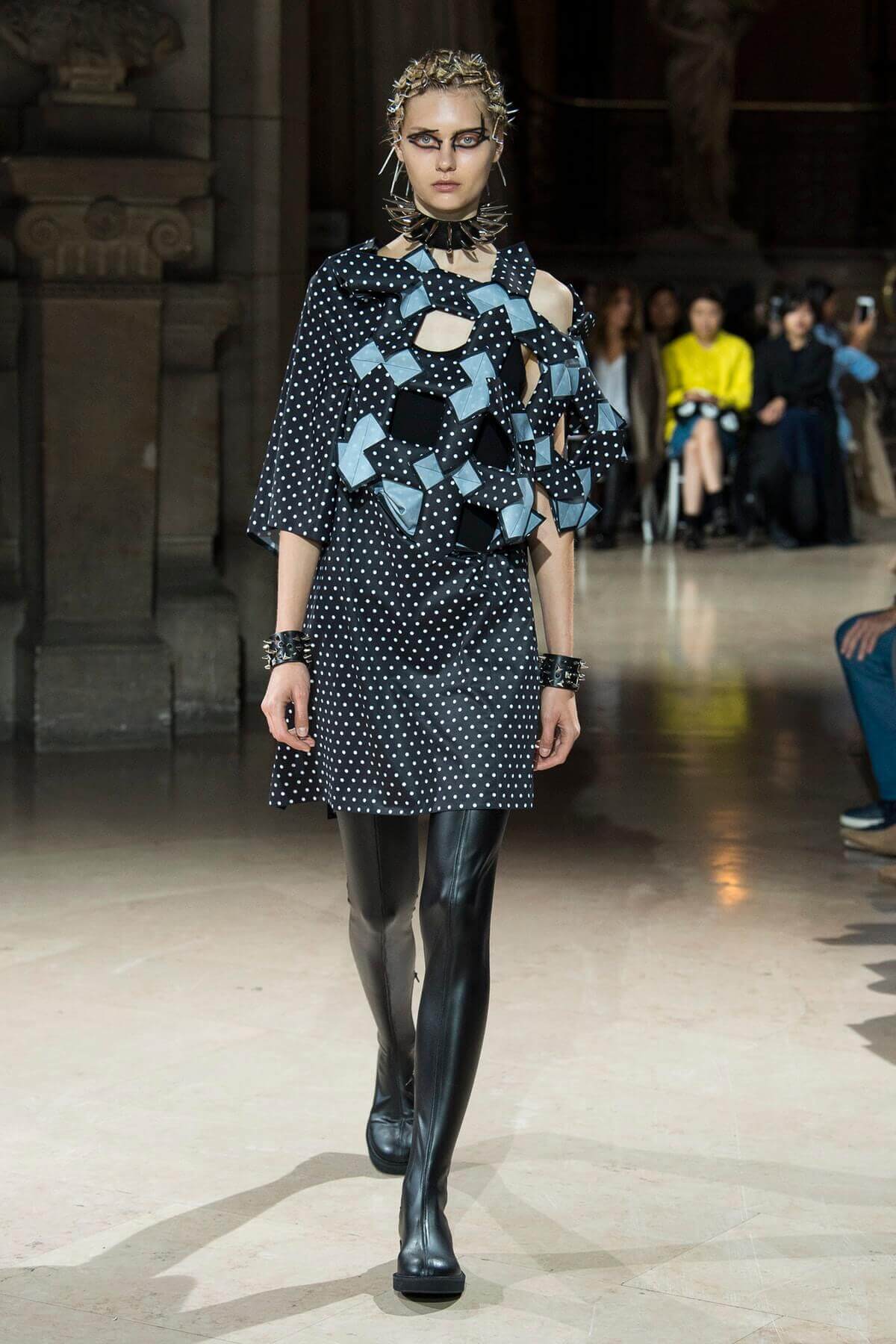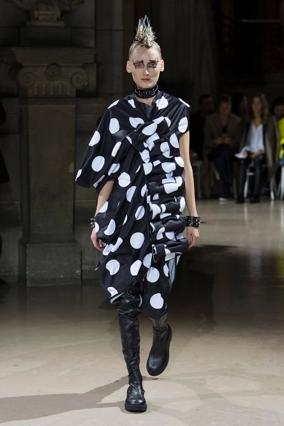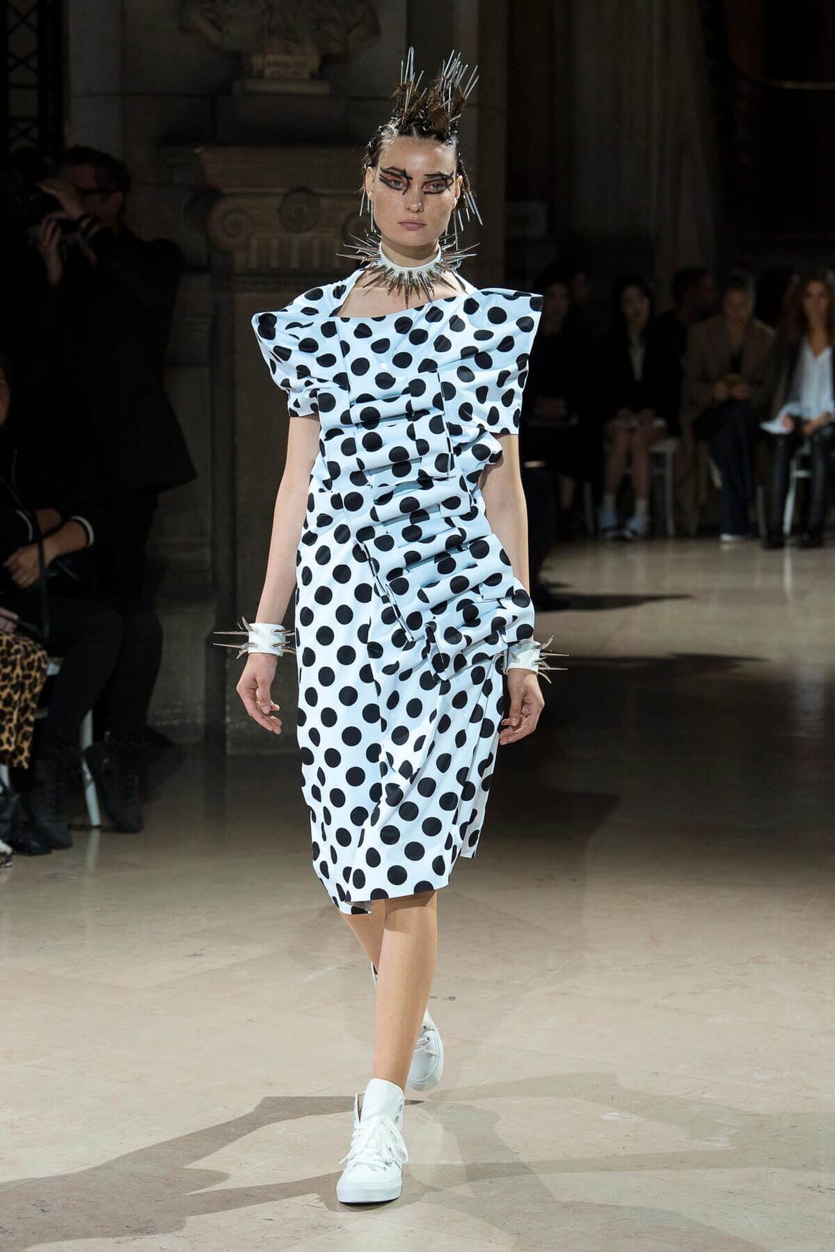 The seasonal pop-up Junya Watanabe show – rarely in the same place twice – was a study in house coda: the stripe, the polka dot and camouflage (abstracted). But also in a Marimekko print. All this came in undulating and geodesic shapes; folded in and over and layered and chopped and ruched and gathered and knotted and plaited… to create garments, which although brand new, still looked familiar and “Junya”. The pattern became the cutting pattern on a series of polka dot prints; the dots increasing and decreasing in size throughout the show and dictating the garment. The white dot on black background sprouting out like a fat migraine pill or cut away to be left hanging. Or when it was folded, became a flower, which sat on the front of dresses or was neatly folded into square lines of plaits with the front and reverse of the fabric on show at the same time. Despite the hours and hours and hours of work to create and perfect all this for outstanding results, none of it looked laboured. There was a spring in the models’ step and the music running from Beck’s ‘Heart Is A Drum’ to ‘Chances Are’ by Johnny Mathis, breathed a happy energy into everything.