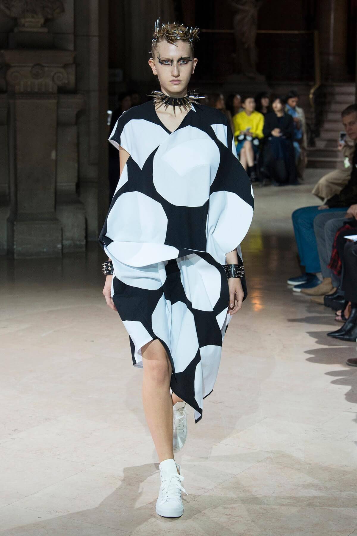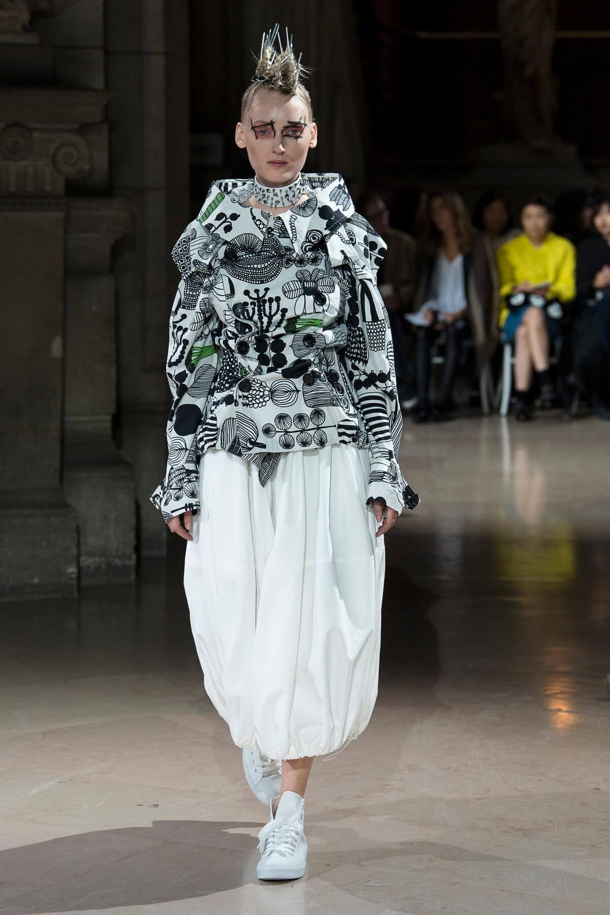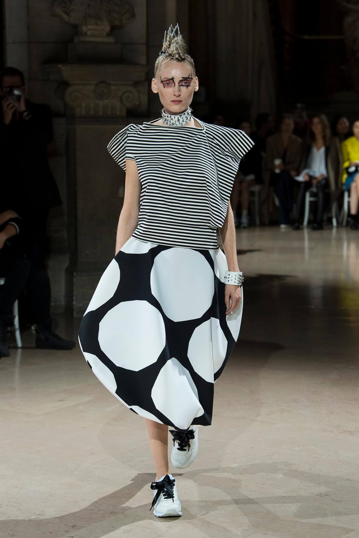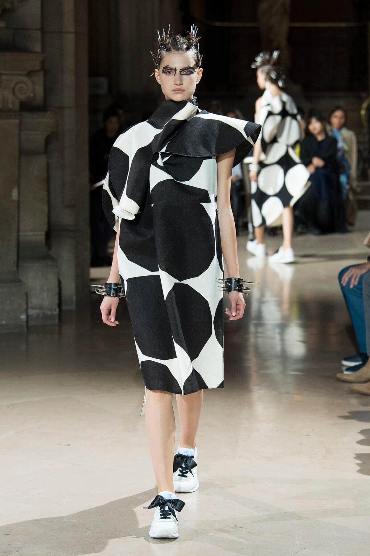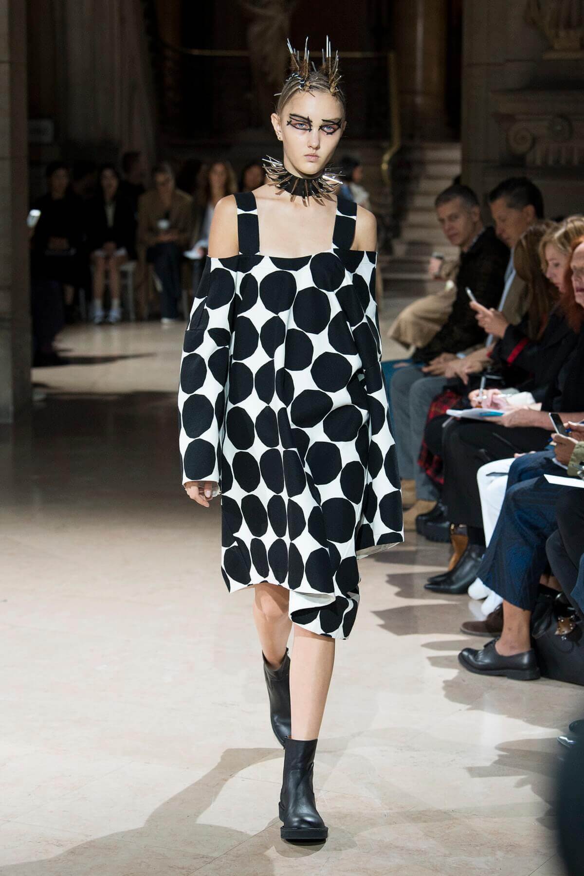 The seasonal pop-up Junya Watanabe show – rarely in the same place twice – was a study in house coda: the stripe, the polka dot and camouflage (abstracted). But also in a Marimekko print. All this came in undulating and geodesic shapes; folded in and over and layered and chopped and ruched and gathered and knotted and plaited… to create garments, which although brand new, still looked familiar and “Junya”. The pattern became the cutting pattern on a series of polka dot prints; the dots increasing and decreasing in size throughout the show and dictating the garment. The white dot on black background sprouting out like a fat migraine pill or cut away to be left hanging. Or when it was folded, became a flower, which sat on the front of dresses or was neatly folded into square lines of plaits with the front and reverse of the fabric on show at the same time. Despite the hours and hours and hours of work to create and perfect all this for outstanding results, none of it looked laboured. There was a spring in the models’ step and the music running from Beck’s ‘Heart Is A Drum’ to ‘Chances Are’ by Johnny Mathis, breathed a happy energy into everything.