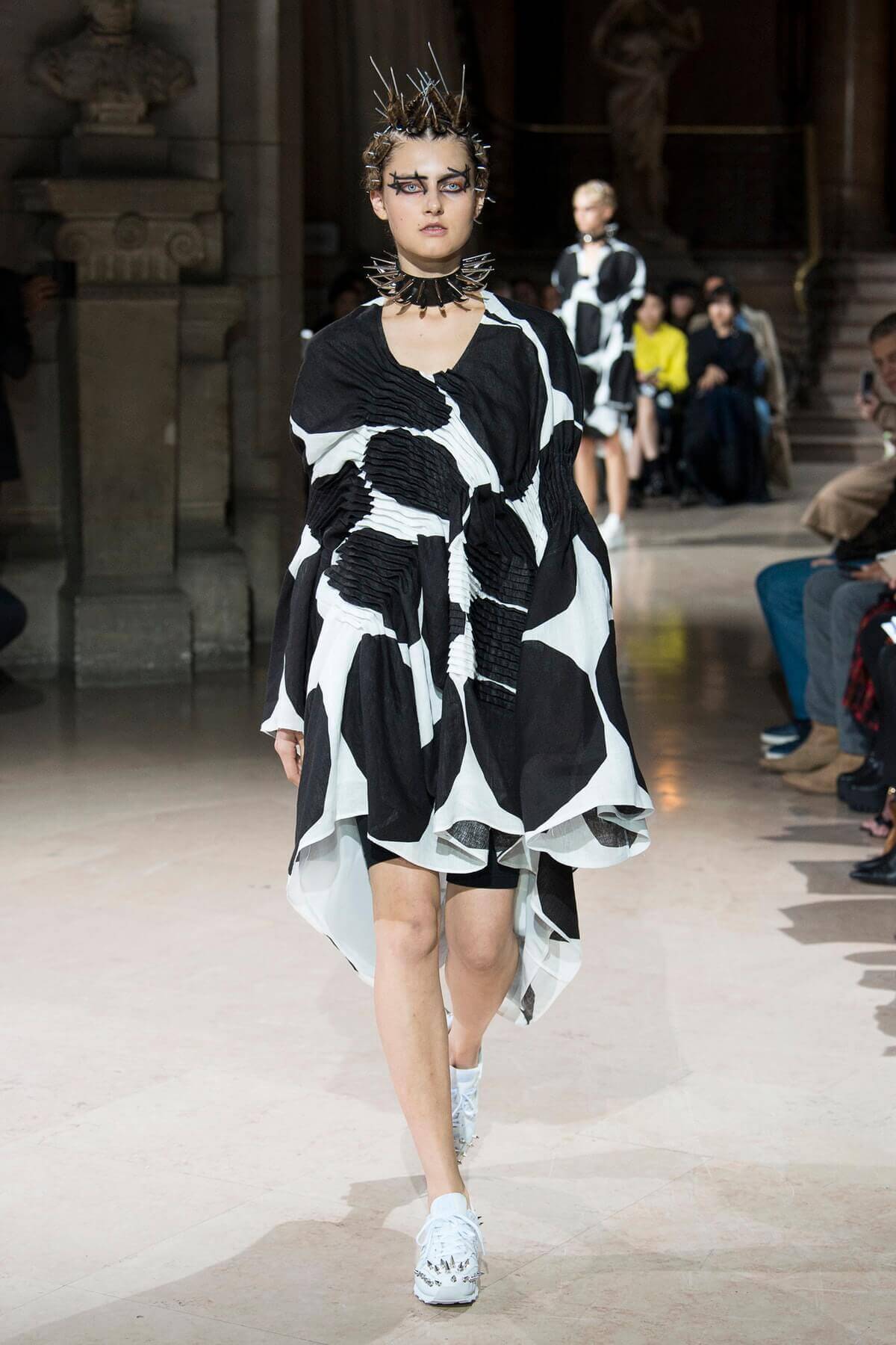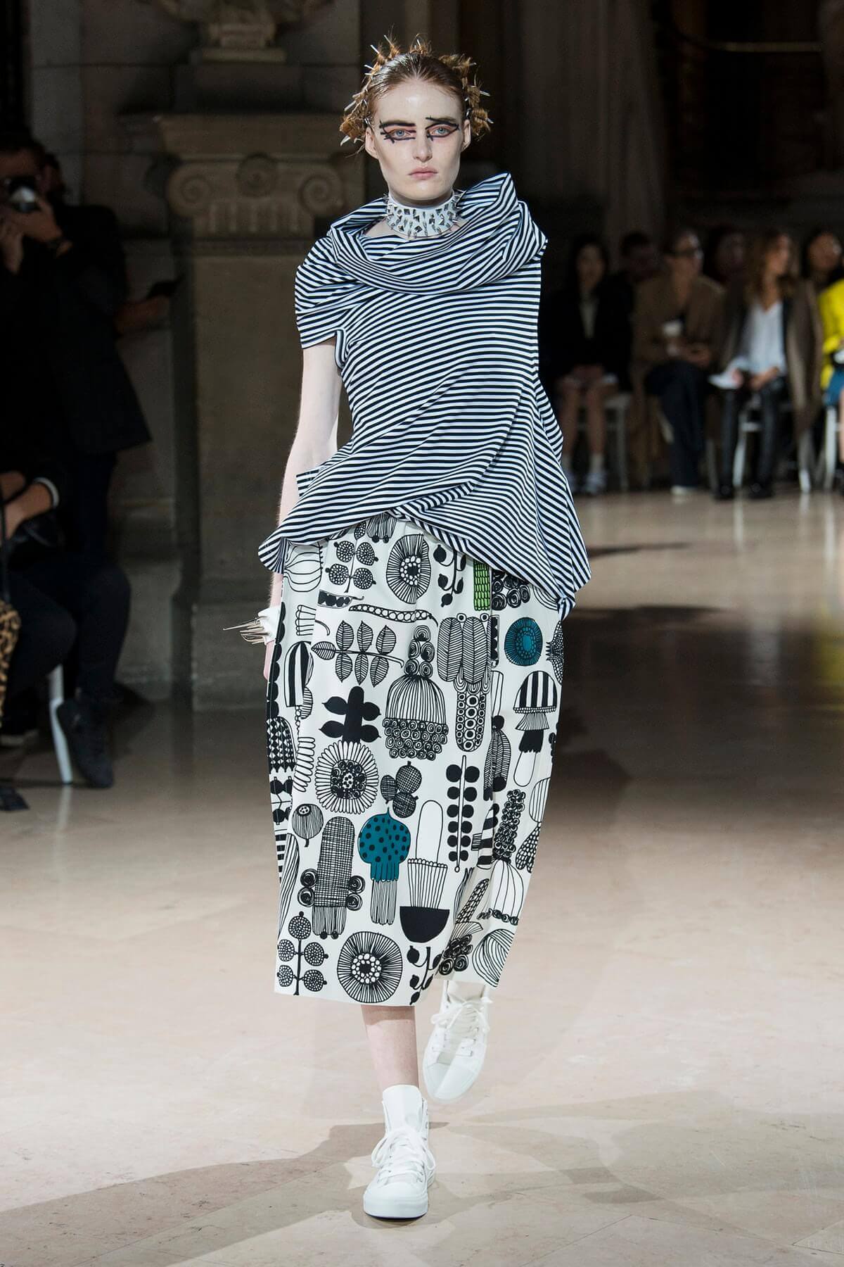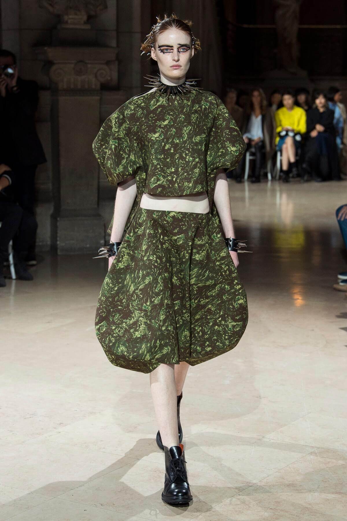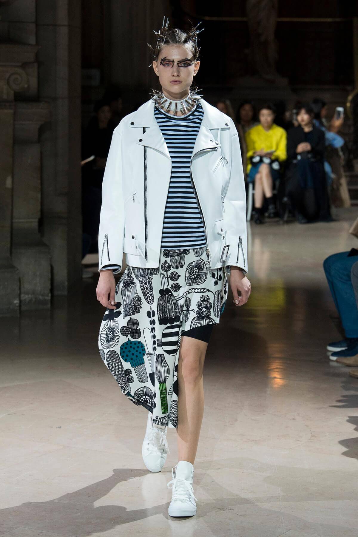 The seasonal pop-up Junya Watanabe show – rarely in the same place twice – was a study in house coda: the stripe, the polka dot and camouflage (abstracted). But also in a Marimekko print. All this came in undulating and geodesic shapes; folded in and over and layered and chopped and ruched and gathered and knotted and plaited… to create garments, which although brand new, still looked familiar and “Junya”. The pattern became the cutting pattern on a series of polka dot prints; the dots increasing and decreasing in size throughout the show and dictating the garment. The white dot on black background sprouting out like a fat migraine pill or cut away to be left hanging. Or when it was folded, became a flower, which sat on the front of dresses or was neatly folded into square lines of plaits with the front and reverse of the fabric on show at the same time. Despite the hours and hours and hours of work to create and perfect all this for outstanding results, none of it looked laboured. There was a spring in the models’ step and the music running from Beck’s ‘Heart Is A Drum’ to ‘Chances Are’ by Johnny Mathis, breathed a happy energy into everything.