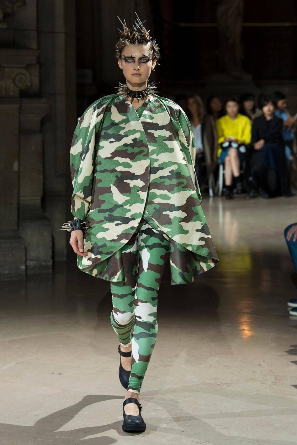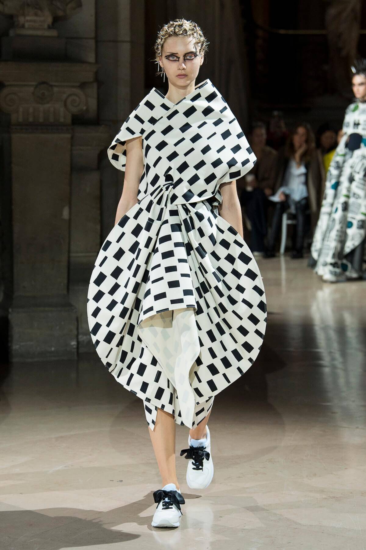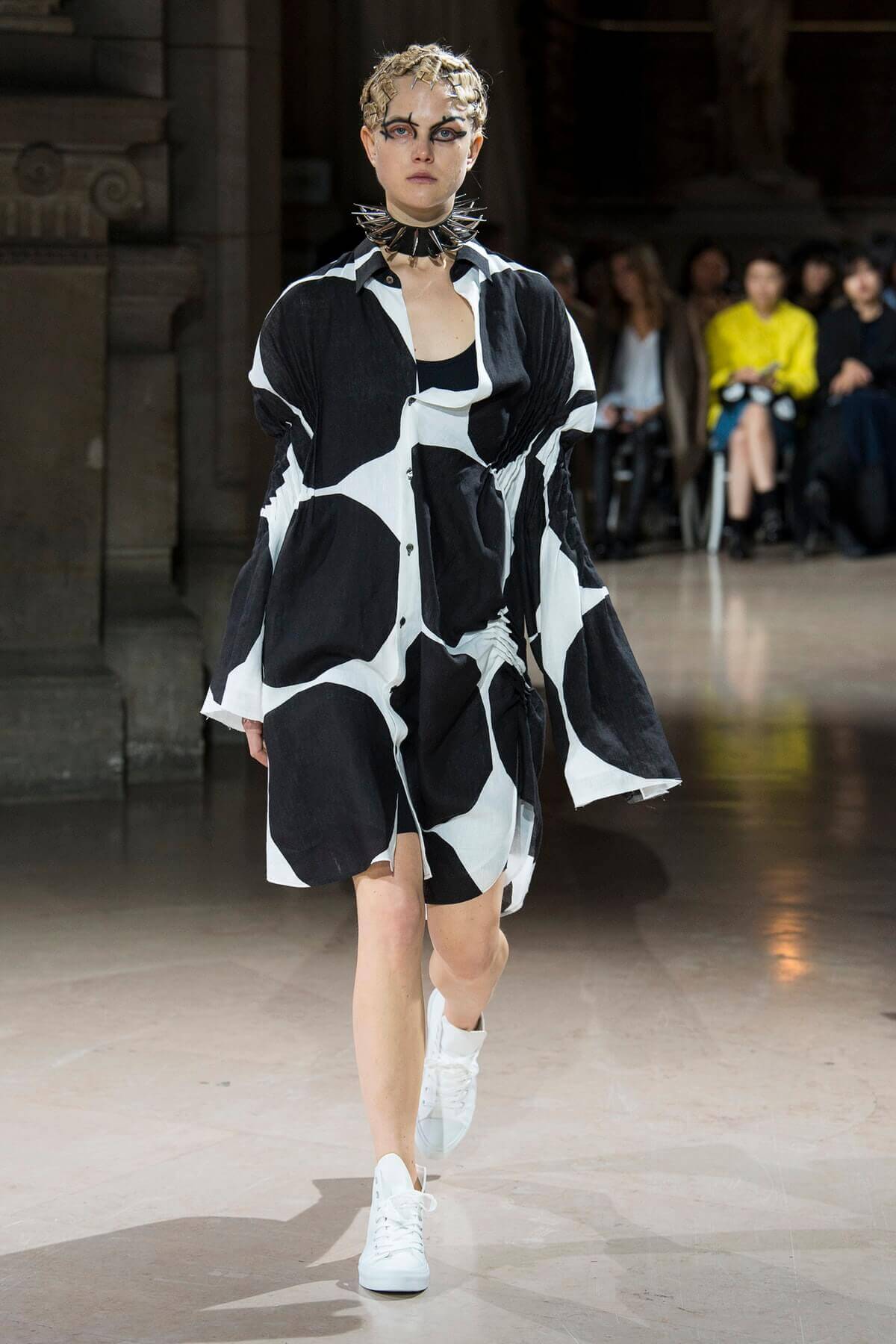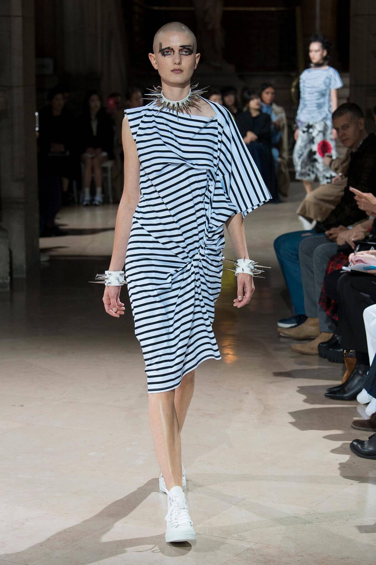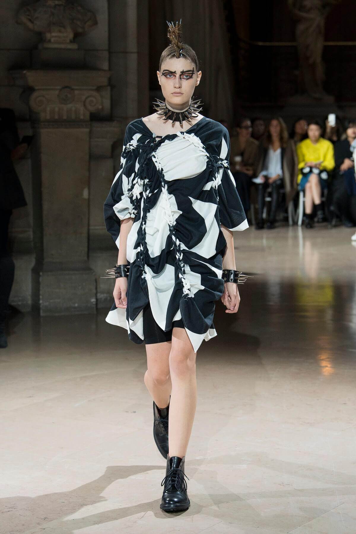 The seasonal pop-up Junya Watanabe show – rarely in the same place twice – was a study in house coda: the stripe, the polka dot and camouflage (abstracted). But also in a Marimekko print. All this came in undulating and geodesic shapes; folded in and over and layered and chopped and ruched and gathered and knotted and plaited… to create garments, which although brand new, still looked familiar and “Junya”. The pattern became the cutting pattern on a series of polka dot prints; the dots increasing and decreasing in size throughout the show and dictating the garment. The white dot on black background sprouting out like a fat migraine pill or cut away to be left hanging. Or when it was folded, became a flower, which sat on the front of dresses or was neatly folded into square lines of plaits with the front and reverse of the fabric on show at the same time. Despite the hours and hours and hours of work to create and perfect all this for outstanding results, none of it looked laboured. There was a spring in the models’ step and the music running from Beck’s ‘Heart Is A Drum’ to ‘Chances Are’ by Johnny Mathis, breathed a happy energy into everything.