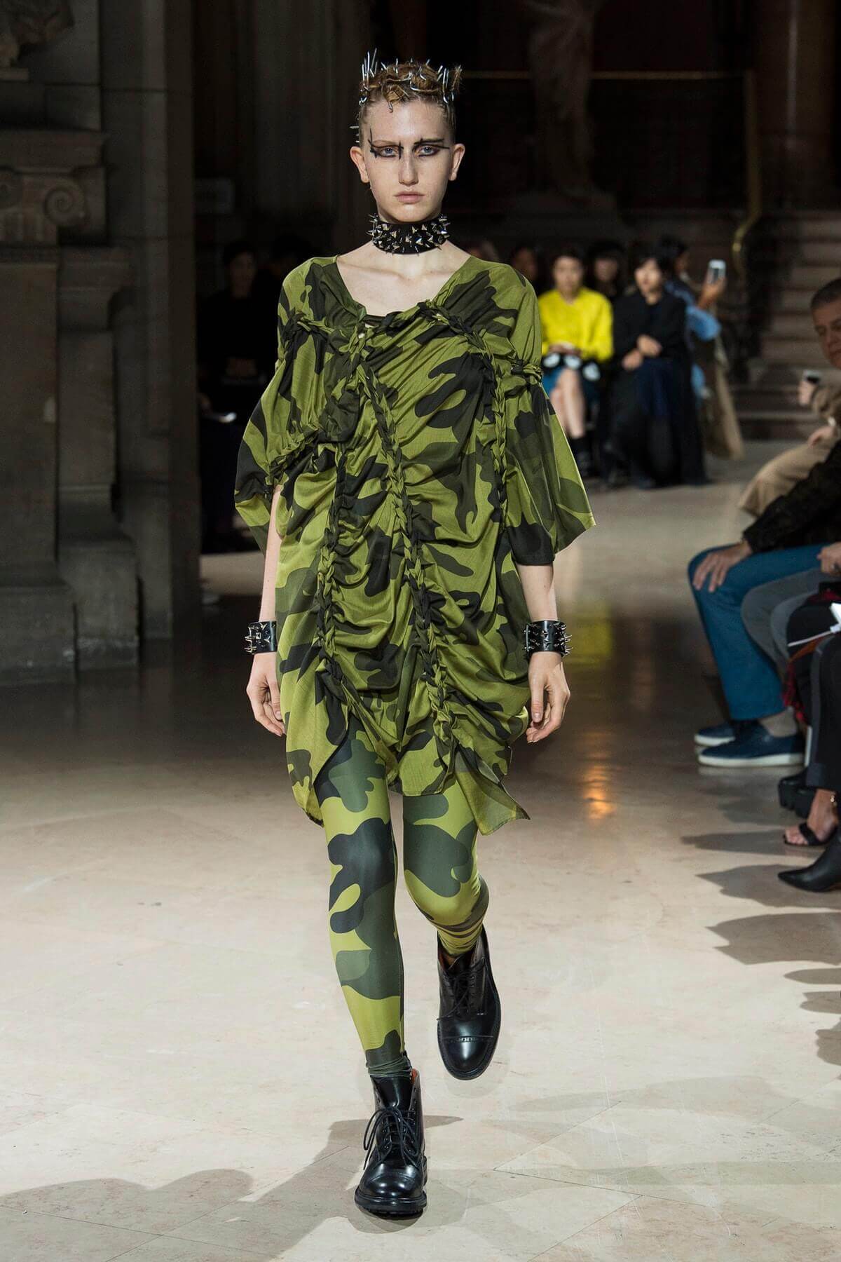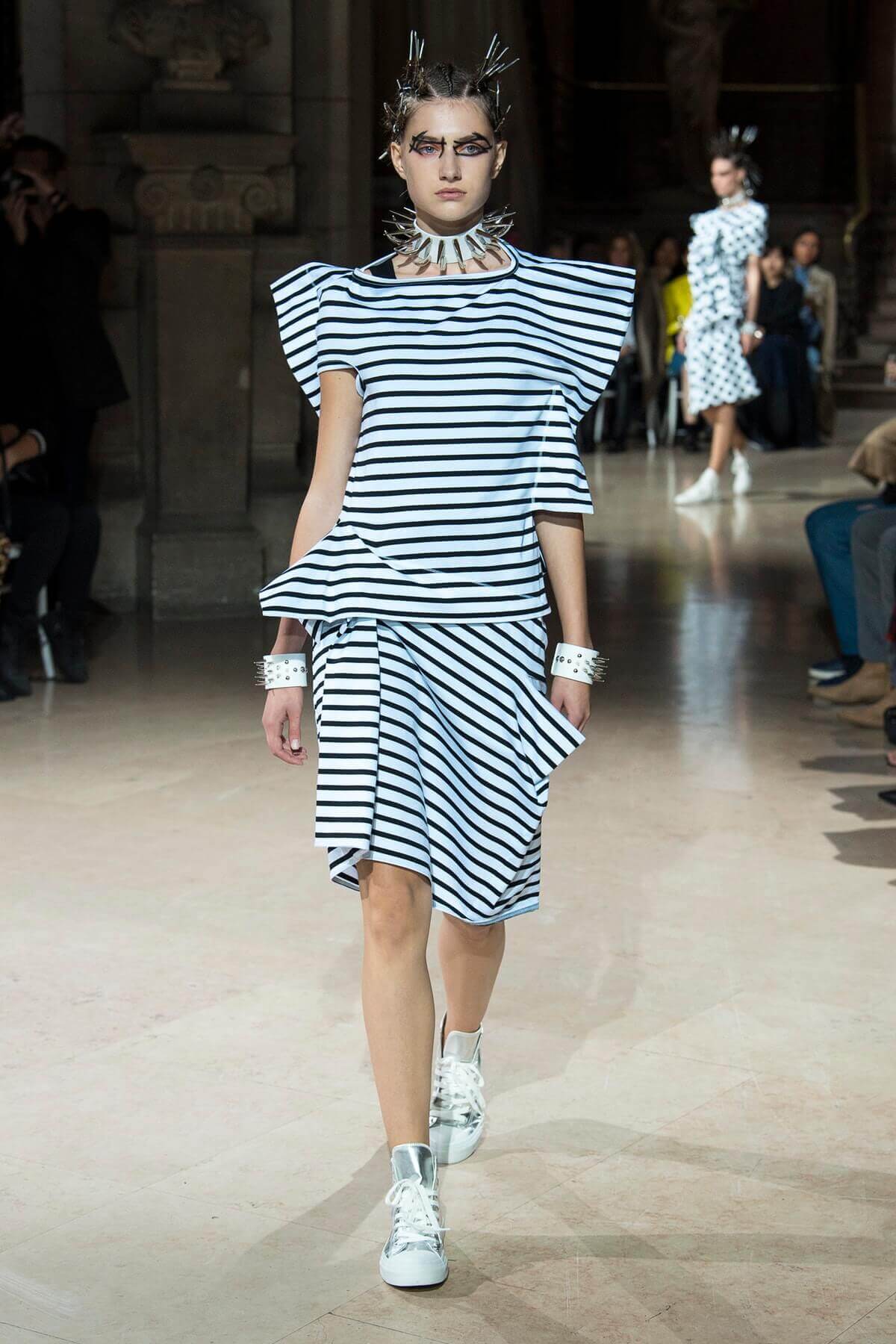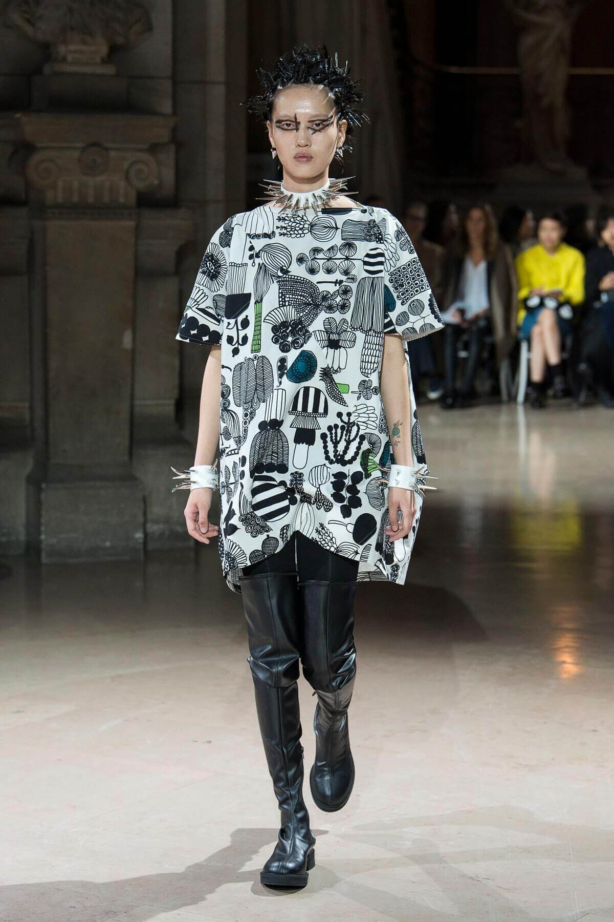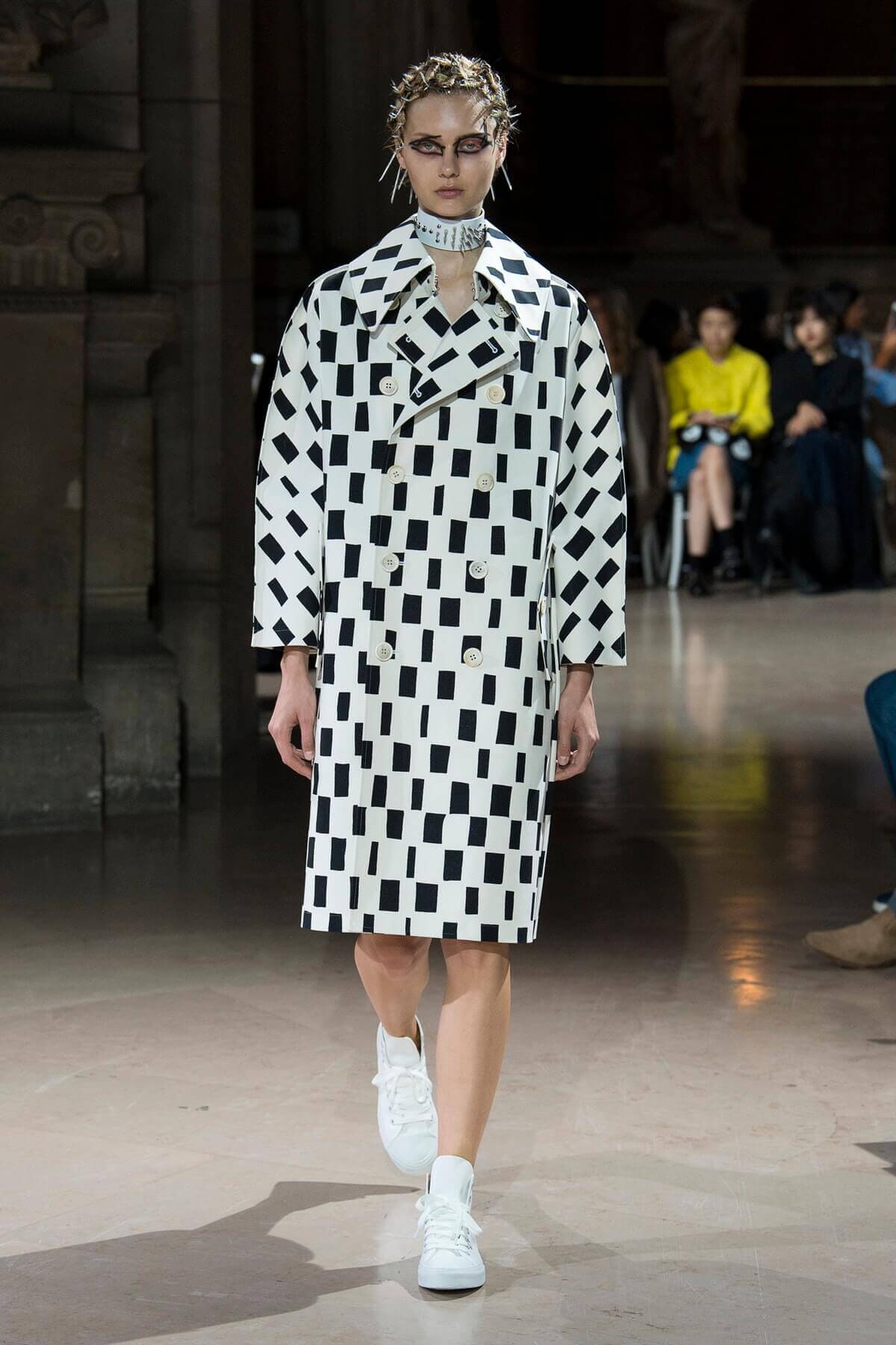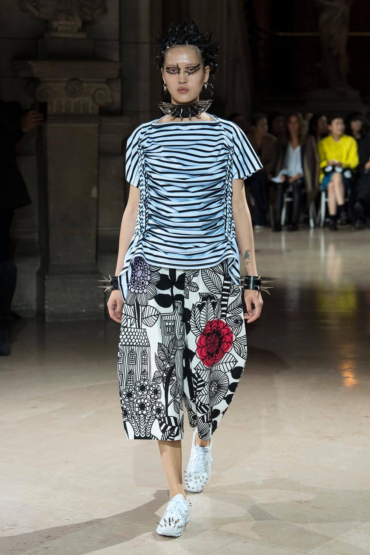 The seasonal pop-up Junya Watanabe show – rarely in the same place twice – was a study in house coda: the stripe, the polka dot and camouflage (abstracted). But also in a Marimekko print. All this came in undulating and geodesic shapes; folded in and over and layered and chopped and ruched and gathered and knotted and plaited… to create garments, which although brand new, still looked familiar and “Junya”. The pattern became the cutting pattern on a series of polka dot prints; the dots increasing and decreasing in size throughout the show and dictating the garment. The white dot on black background sprouting out like a fat migraine pill or cut away to be left hanging. Or when it was folded, became a flower, which sat on the front of dresses or was neatly folded into square lines of plaits with the front and reverse of the fabric on show at the same time. Despite the hours and hours and hours of work to create and perfect all this for outstanding results, none of it looked laboured. There was a spring in the models’ step and the music running from Beck’s ‘Heart Is A Drum’ to ‘Chances Are’ by Johnny Mathis, breathed a happy energy into everything.