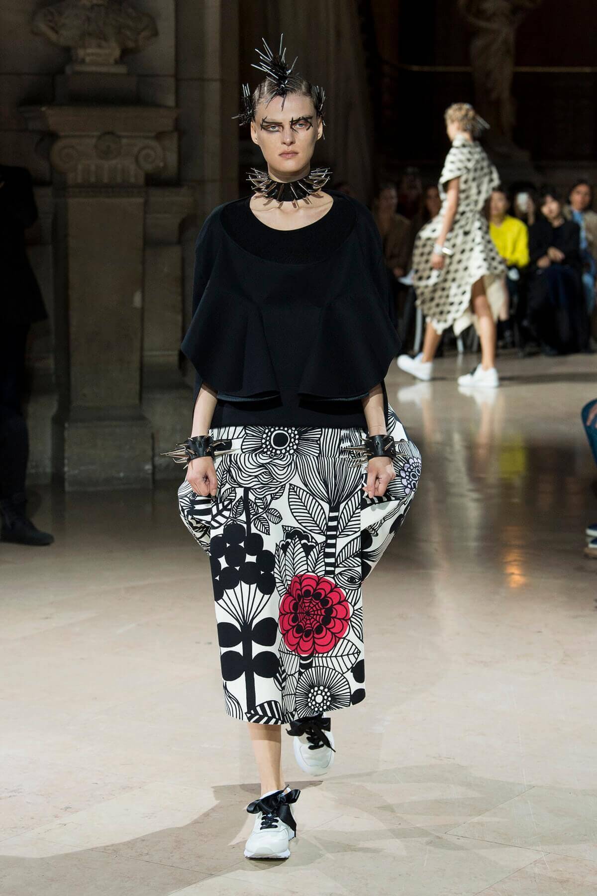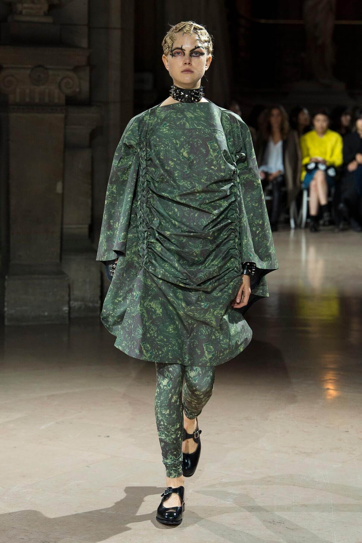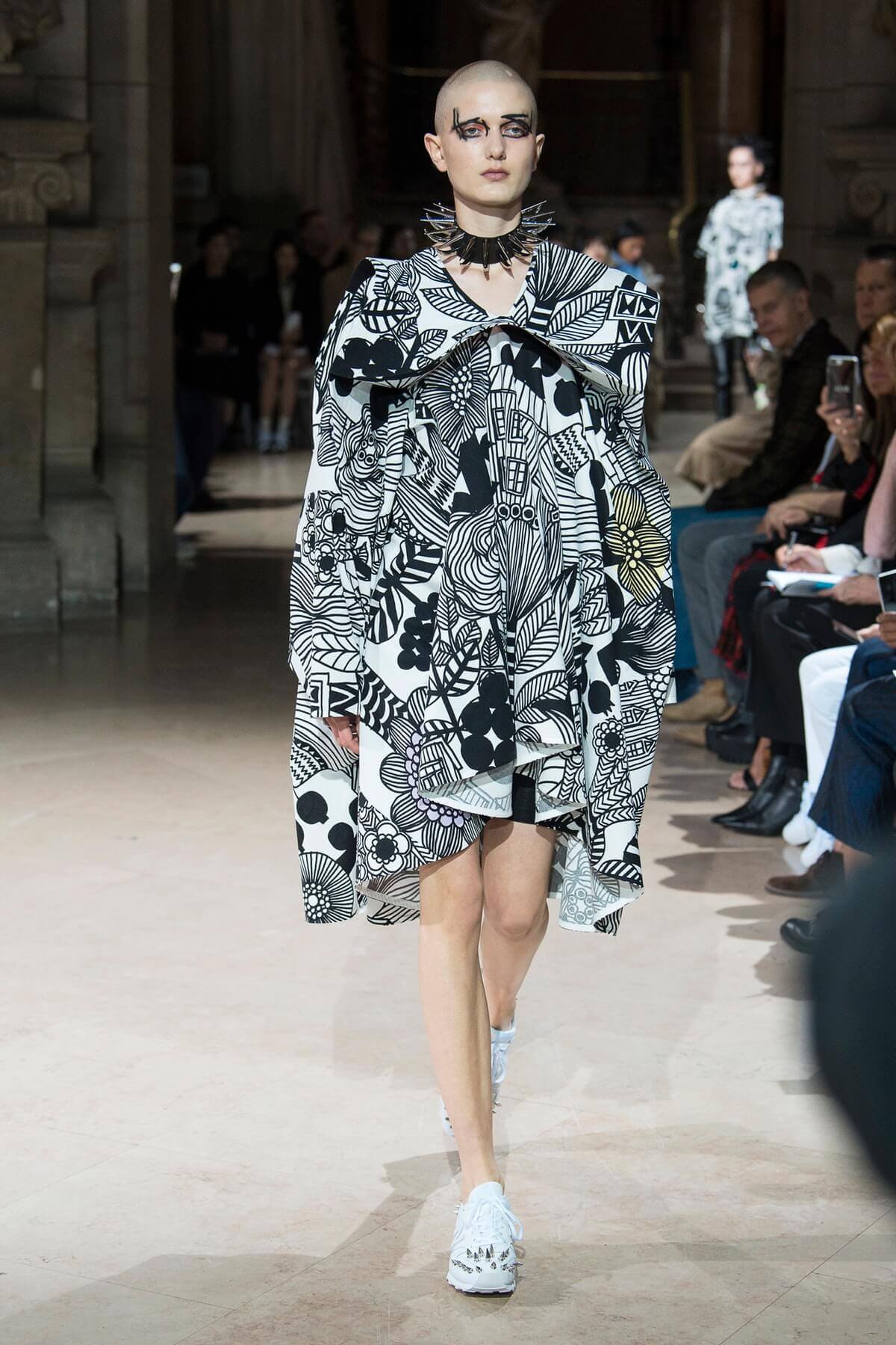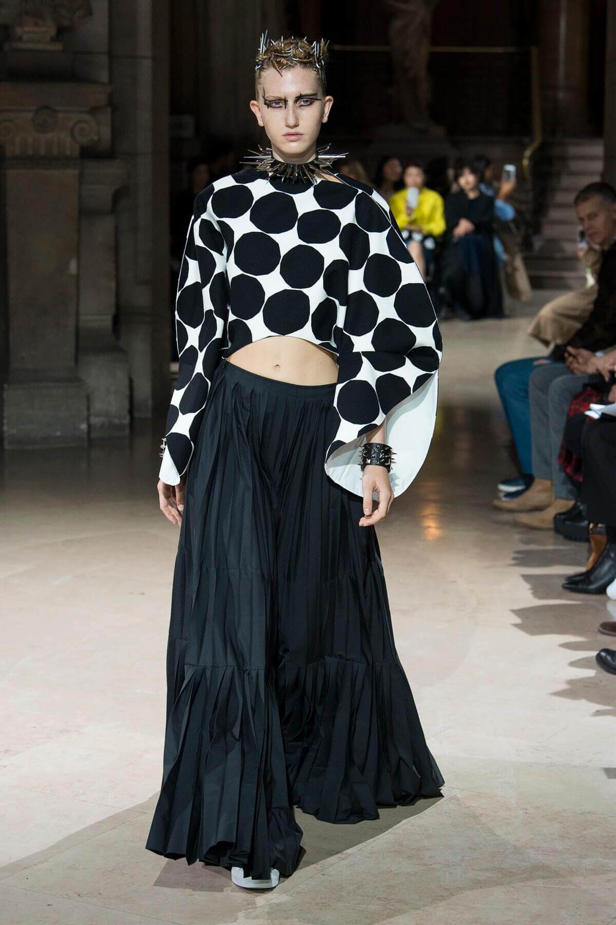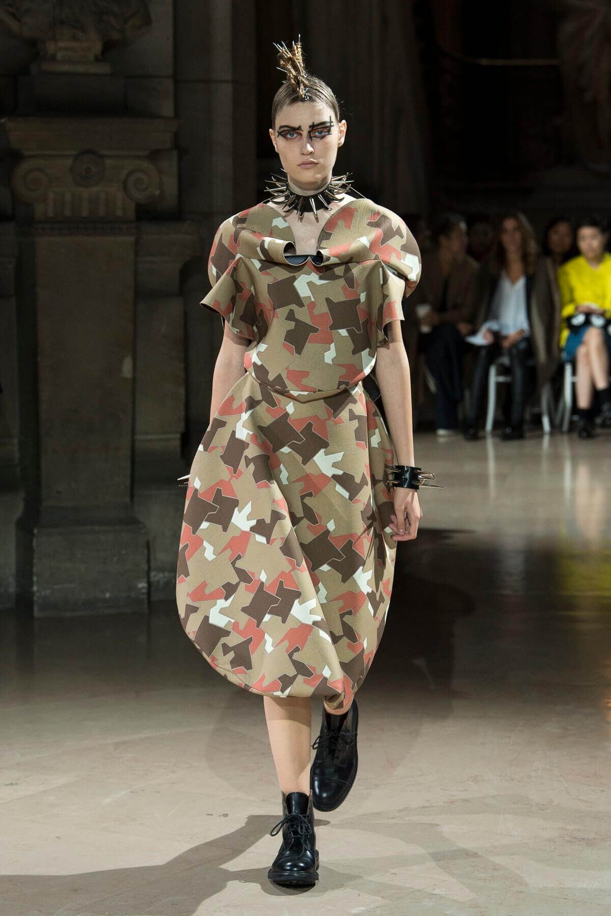 The seasonal pop-up Junya Watanabe show – rarely in the same place twice – was a study in house coda: the stripe, the polka dot and camouflage (abstracted). But also in a Marimekko print. All this came in undulating and geodesic shapes; folded in and over and layered and chopped and ruched and gathered and knotted and plaited… to create garments, which although brand new, still looked familiar and “Junya”. The pattern became the cutting pattern on a series of polka dot prints; the dots increasing and decreasing in size throughout the show and dictating the garment. The white dot on black background sprouting out like a fat migraine pill or cut away to be left hanging. Or when it was folded, became a flower, which sat on the front of dresses or was neatly folded into square lines of plaits with the front and reverse of the fabric on show at the same time. Despite the hours and hours and hours of work to create and perfect all this for outstanding results, none of it looked laboured. There was a spring in the models’ step and the music running from Beck’s ‘Heart Is A Drum’ to ‘Chances Are’ by Johnny Mathis, breathed a happy energy into everything.