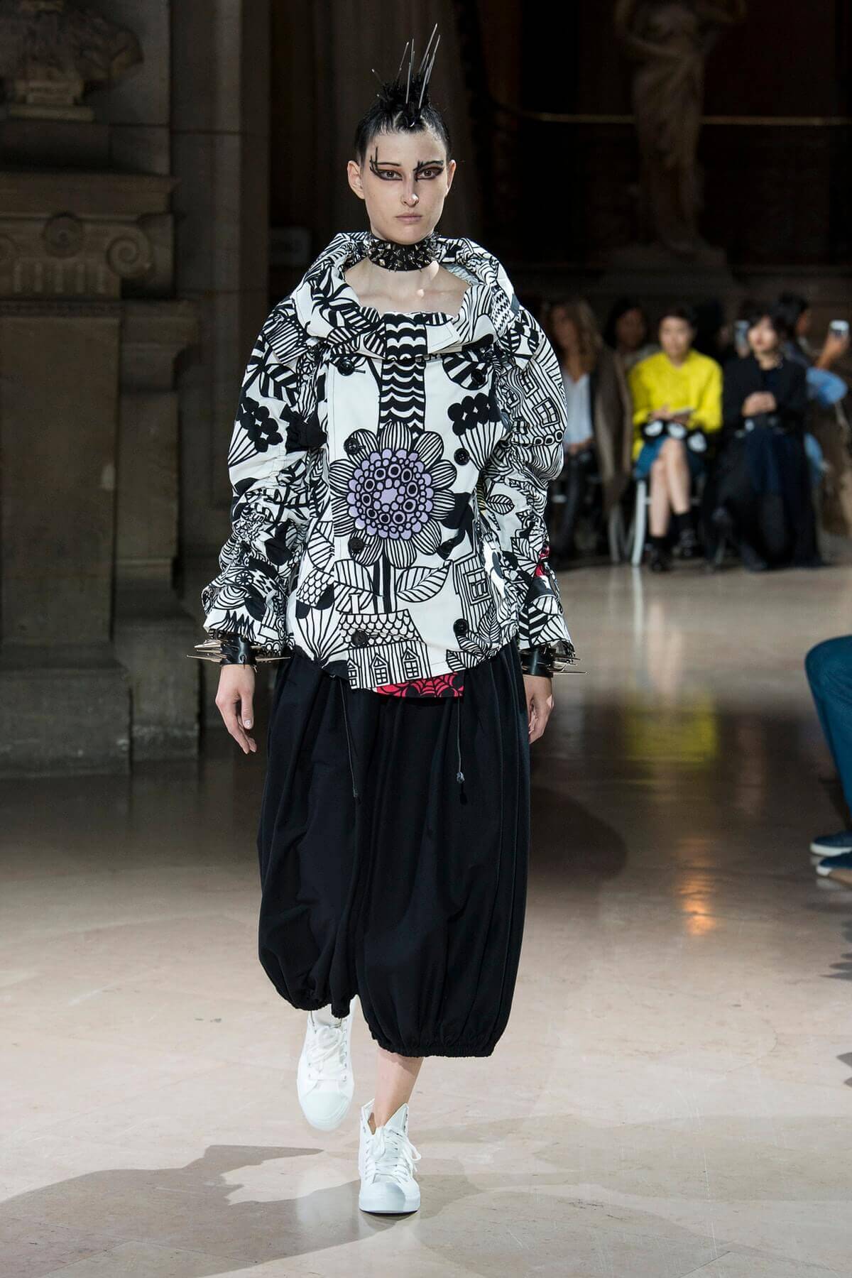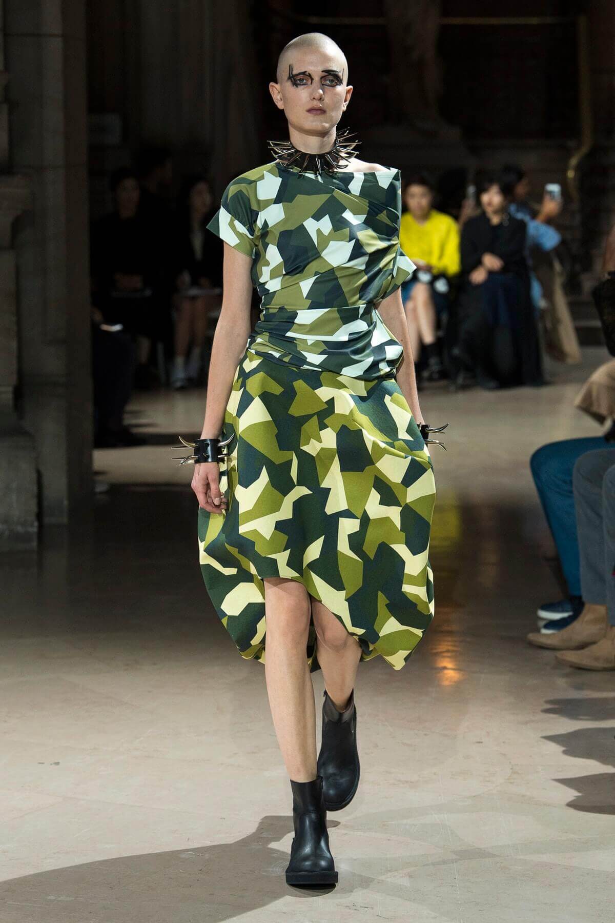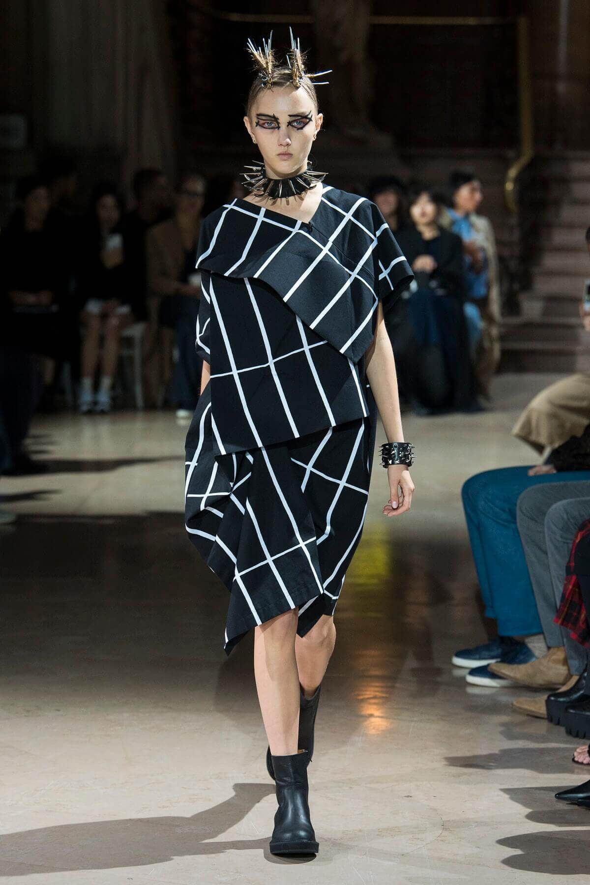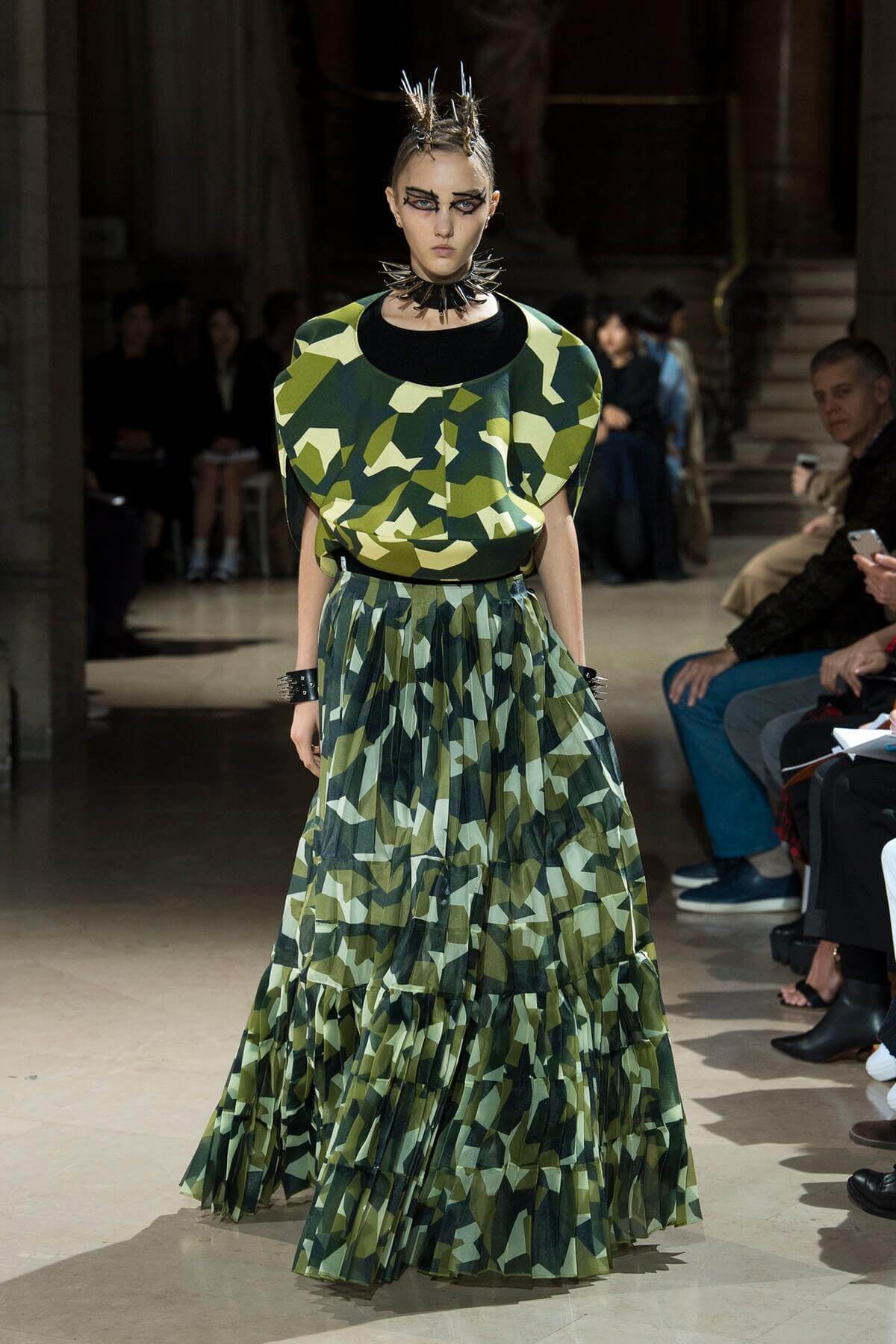 The seasonal pop-up Junya Watanabe show – rarely in the same place twice – was a study in house coda: the stripe, the polka dot and camouflage (abstracted). But also in a Marimekko print. All this came in undulating and geodesic shapes; folded in and over and layered and chopped and ruched and gathered and knotted and plaited… to create garments, which although brand new, still looked familiar and “Junya”. The pattern became the cutting pattern on a series of polka dot prints; the dots increasing and decreasing in size throughout the show and dictating the garment. The white dot on black background sprouting out like a fat migraine pill or cut away to be left hanging. Or when it was folded, became a flower, which sat on the front of dresses or was neatly folded into square lines of plaits with the front and reverse of the fabric on show at the same time. Despite the hours and hours and hours of work to create and perfect all this for outstanding results, none of it looked laboured. There was a spring in the models’ step and the music running from Beck’s ‘Heart Is A Drum’ to ‘Chances Are’ by Johnny Mathis, breathed a happy energy into everything.