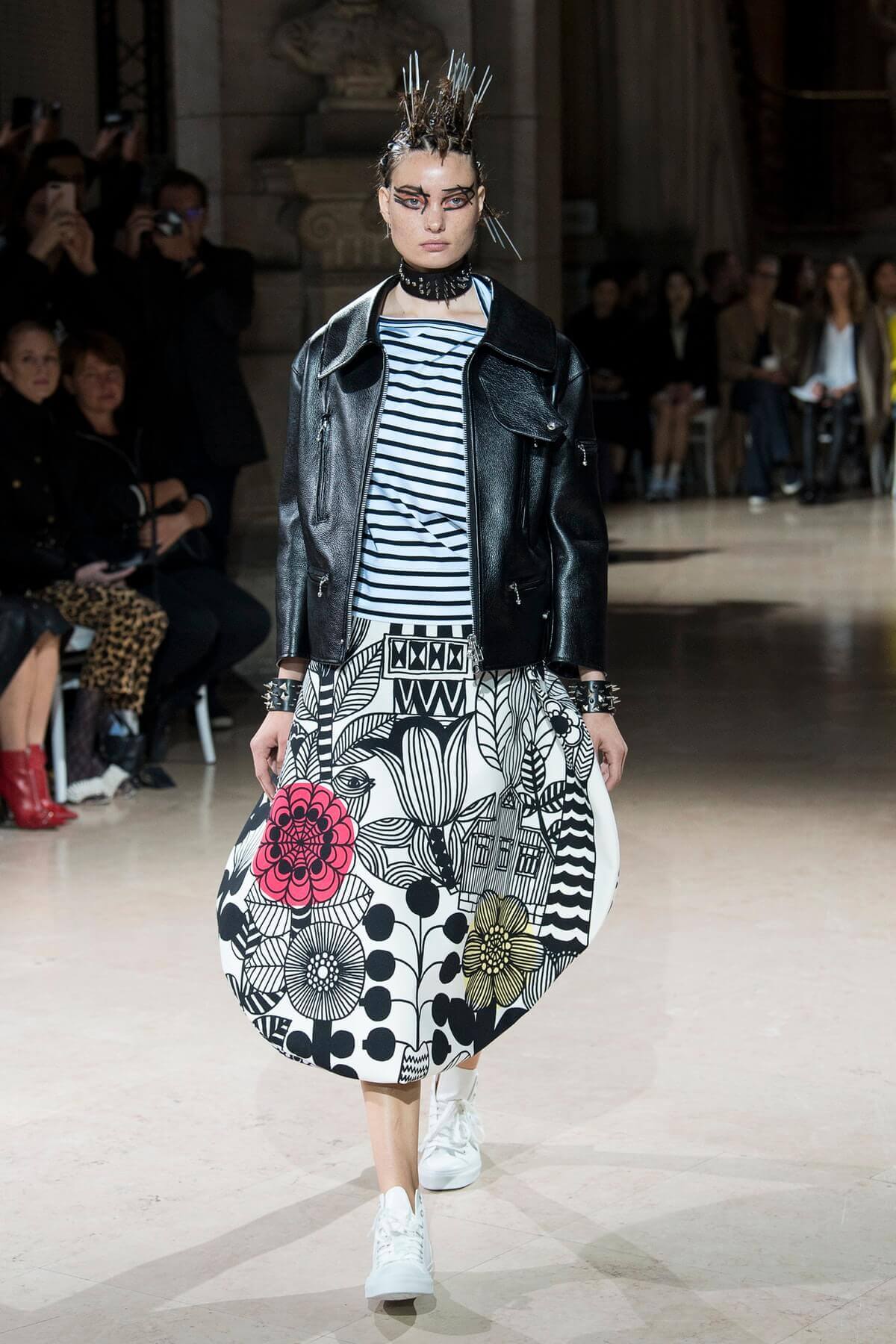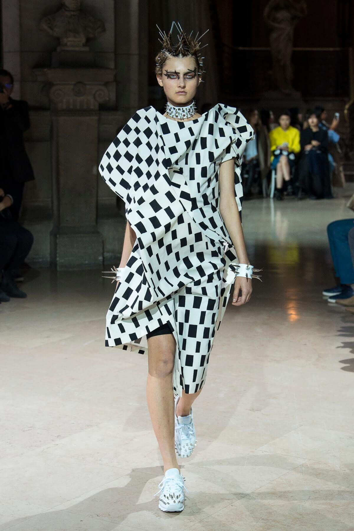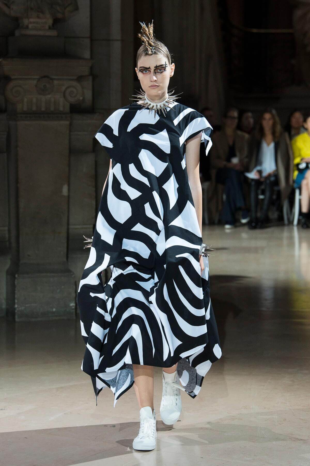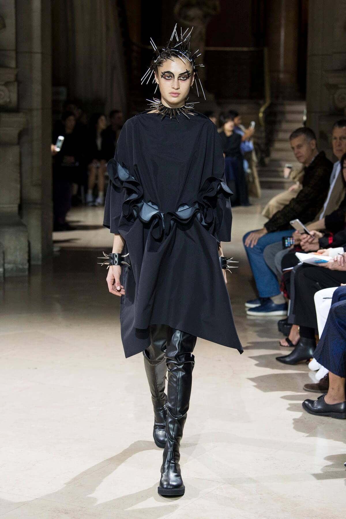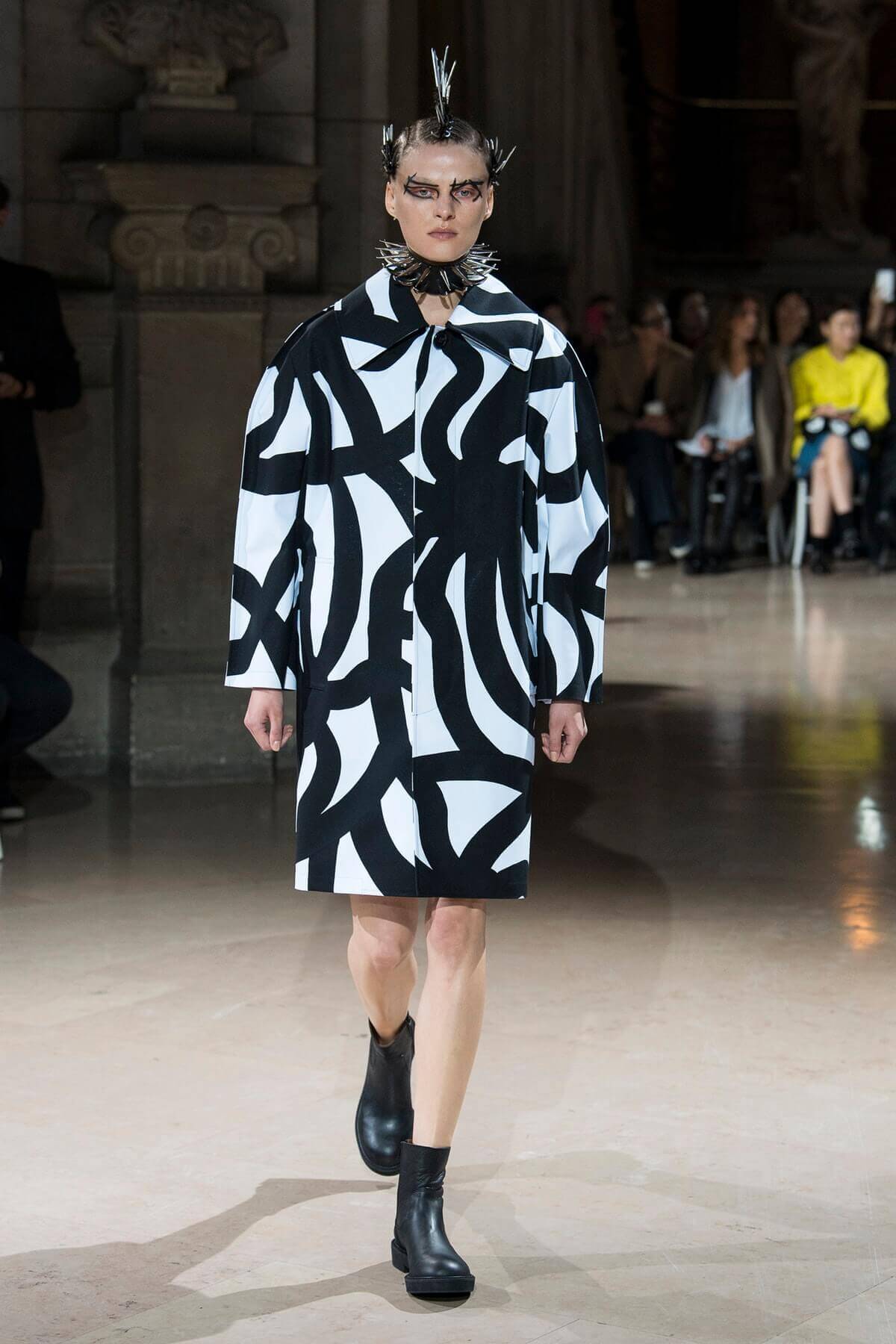 The seasonal pop-up Junya Watanabe show – rarely in the same place twice – was a study in house coda: the stripe, the polka dot and camouflage (abstracted). But also in a Marimekko print. All this came in undulating and geodesic shapes; folded in and over and layered and chopped and ruched and gathered and knotted and plaited… to create garments, which although brand new, still looked familiar and “Junya”. The pattern became the cutting pattern on a series of polka dot prints; the dots increasing and decreasing in size throughout the show and dictating the garment. The white dot on black background sprouting out like a fat migraine pill or cut away to be left hanging. Or when it was folded, became a flower, which sat on the front of dresses or was neatly folded into square lines of plaits with the front and reverse of the fabric on show at the same time. Despite the hours and hours and hours of work to create and perfect all this for outstanding results, none of it looked laboured. There was a spring in the models’ step and the music running from Beck’s ‘Heart Is A Drum’ to ‘Chances Are’ by Johnny Mathis, breathed a happy energy into everything.