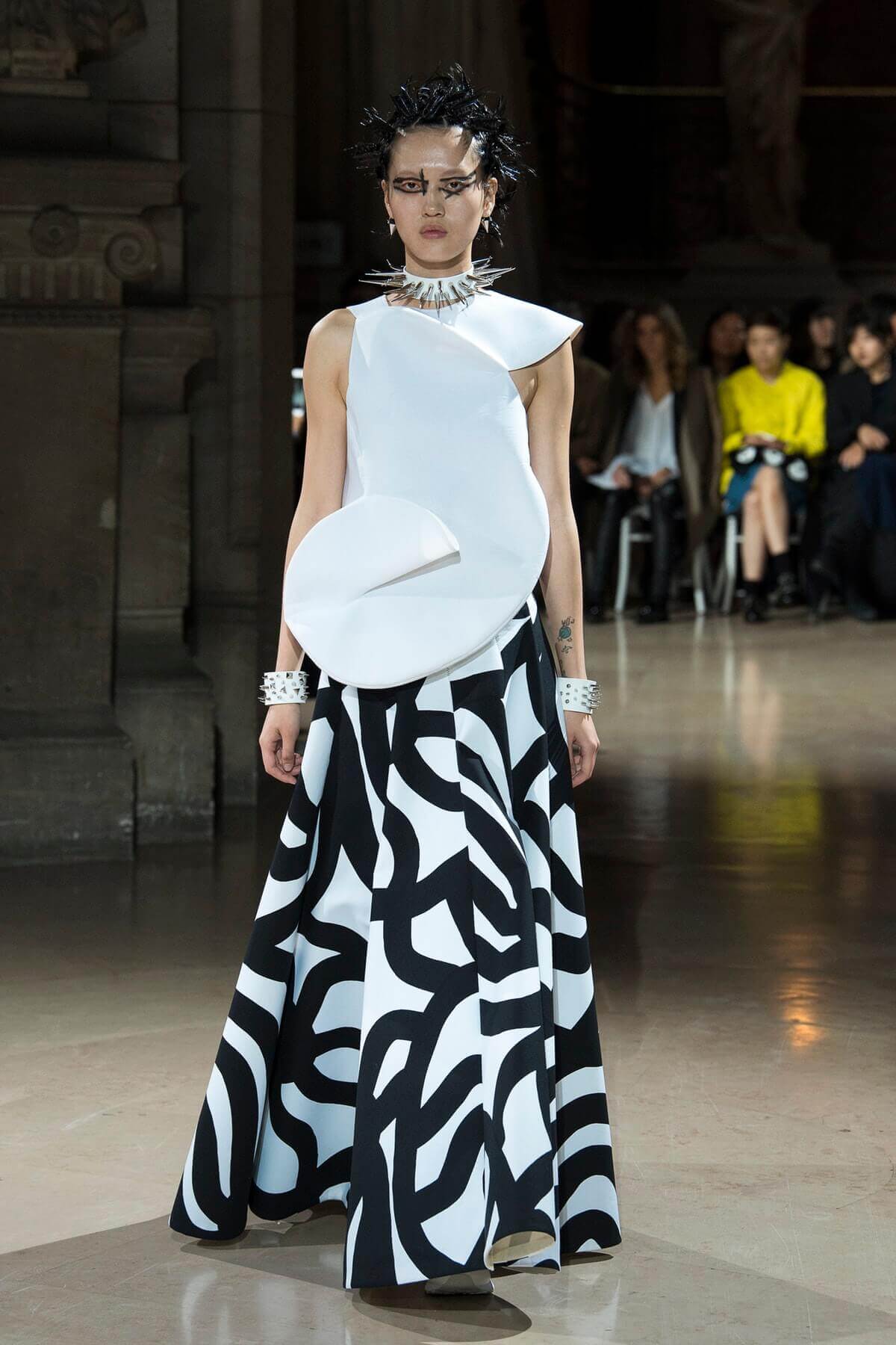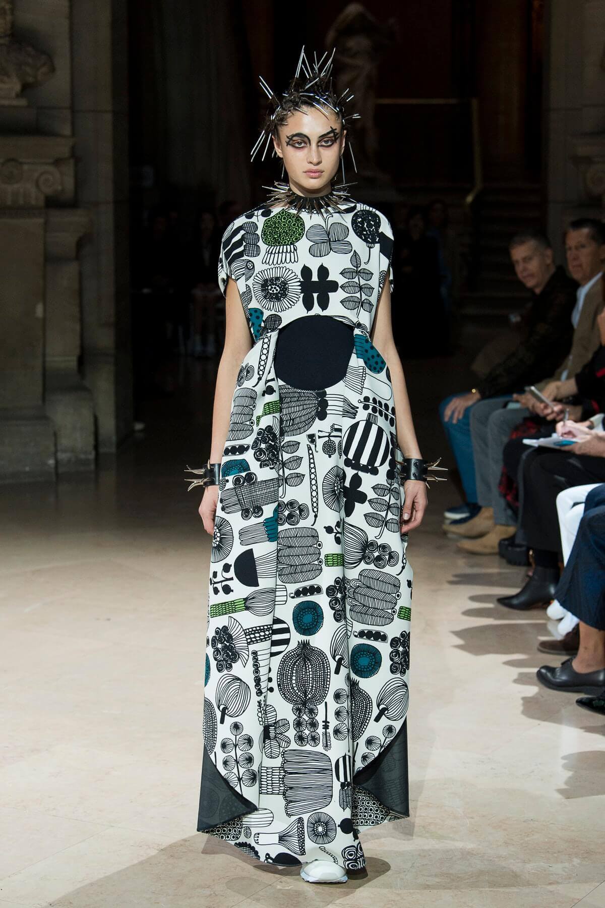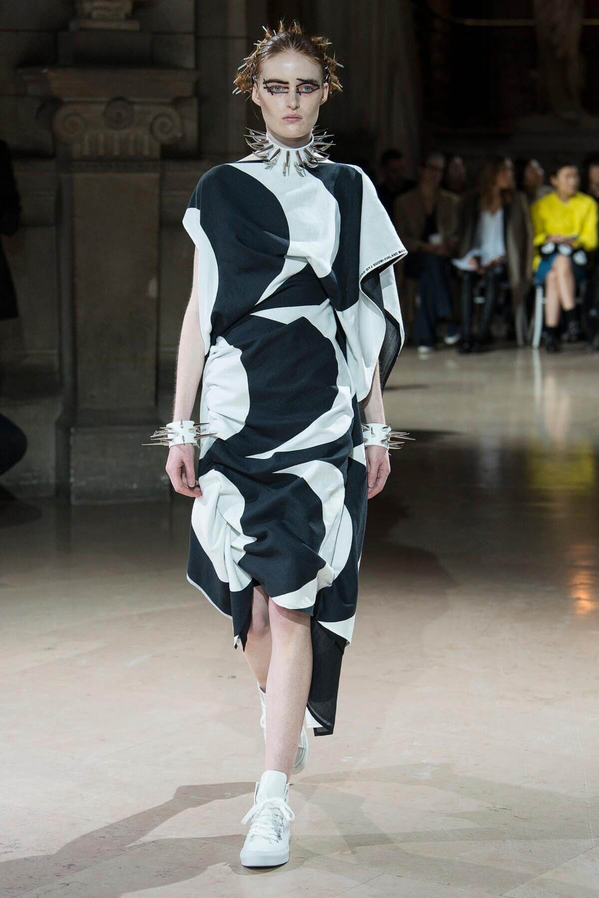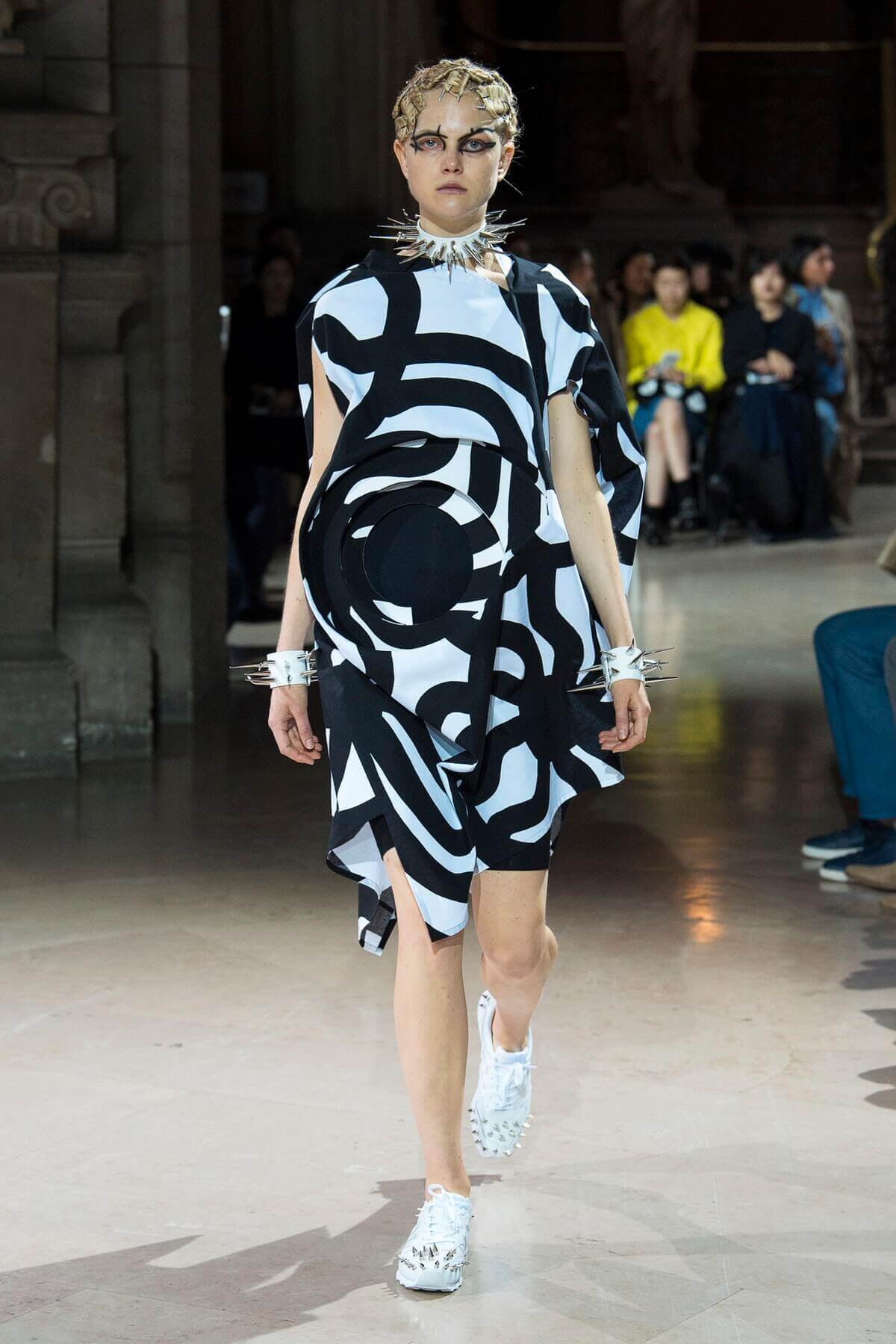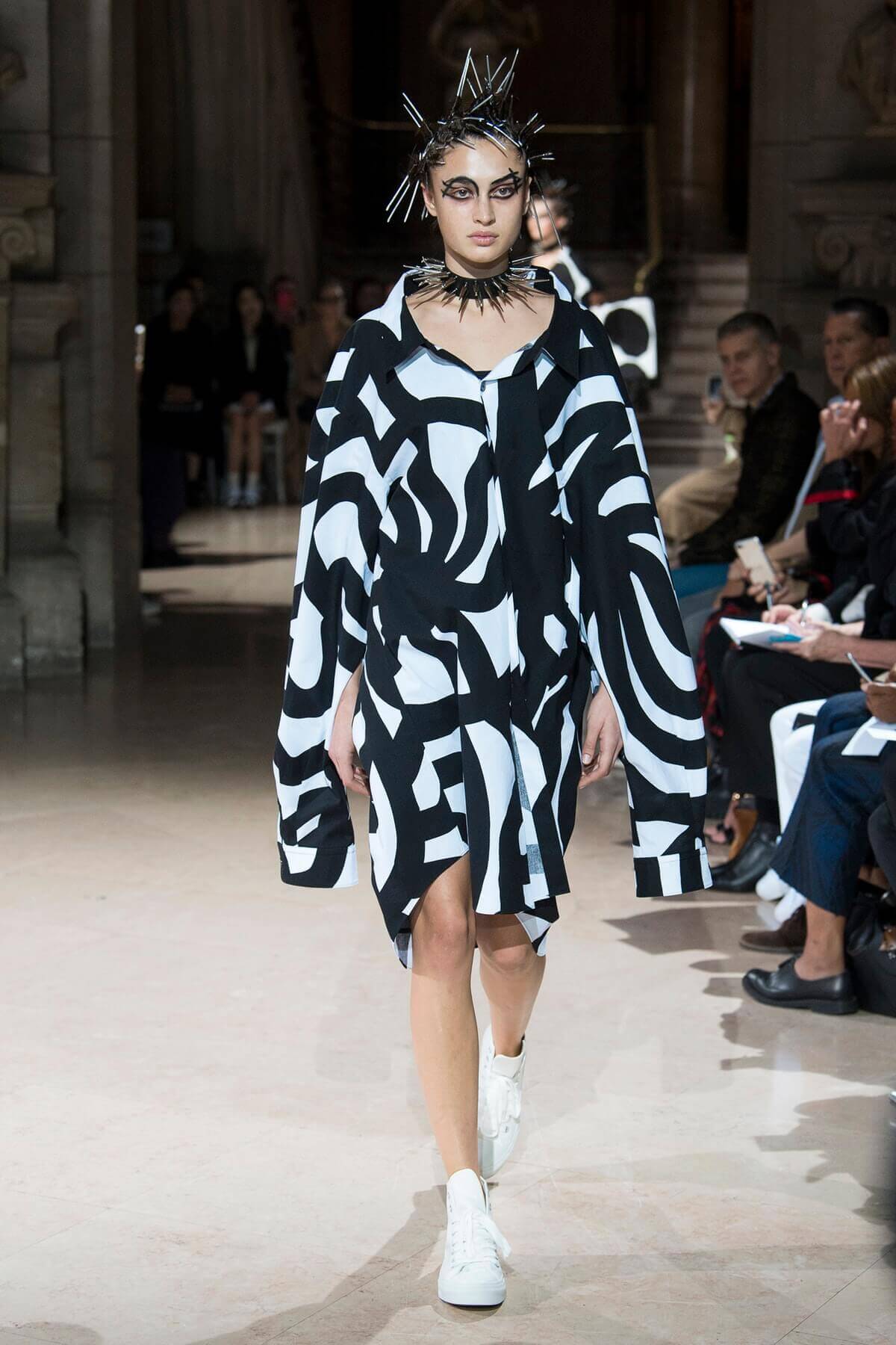 The seasonal pop-up Junya Watanabe show – rarely in the same place twice – was a study in house coda: the stripe, the polka dot and camouflage (abstracted). But also in a Marimekko print. All this came in undulating and geodesic shapes; folded in and over and layered and chopped and ruched and gathered and knotted and plaited… to create garments, which although brand new, still looked familiar and “Junya”. The pattern became the cutting pattern on a series of polka dot prints; the dots increasing and decreasing in size throughout the show and dictating the garment. The white dot on black background sprouting out like a fat migraine pill or cut away to be left hanging. Or when it was folded, became a flower, which sat on the front of dresses or was neatly folded into square lines of plaits with the front and reverse of the fabric on show at the same time. Despite the hours and hours and hours of work to create and perfect all this for outstanding results, none of it looked laboured. There was a spring in the models’ step and the music running from Beck’s ‘Heart Is A Drum’ to ‘Chances Are’ by Johnny Mathis, breathed a happy energy into everything.