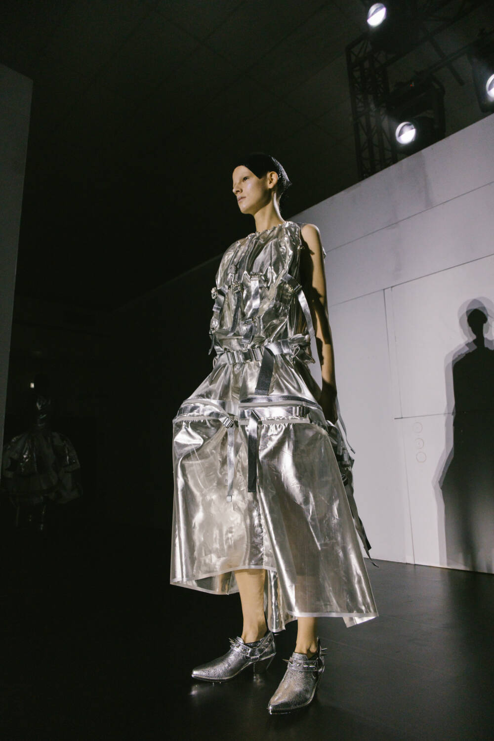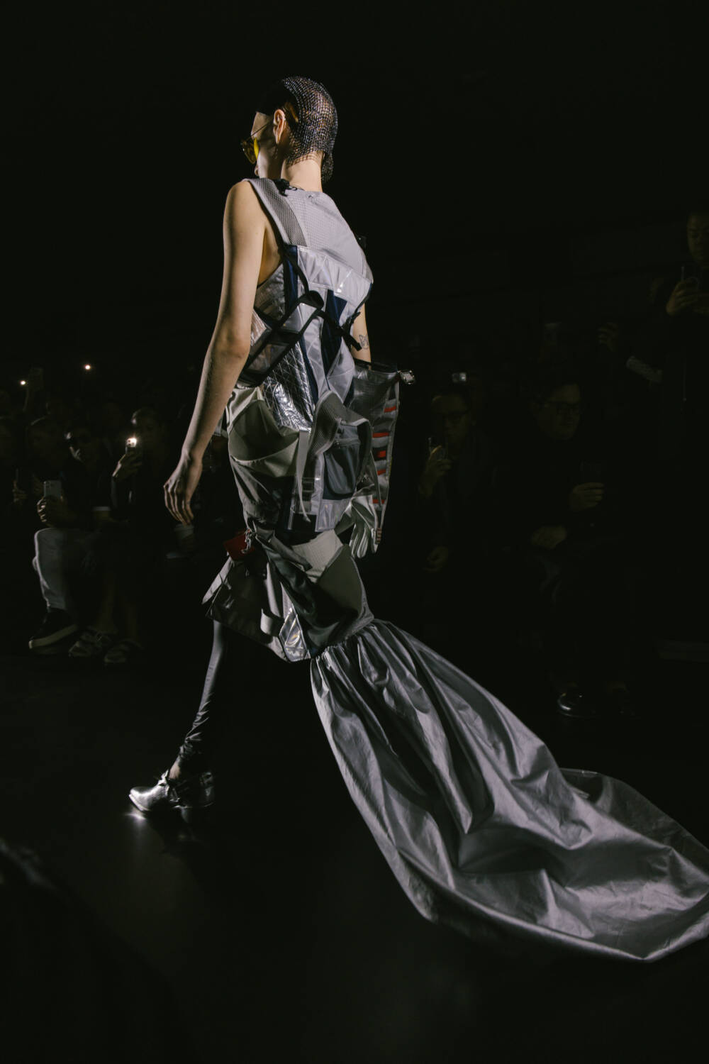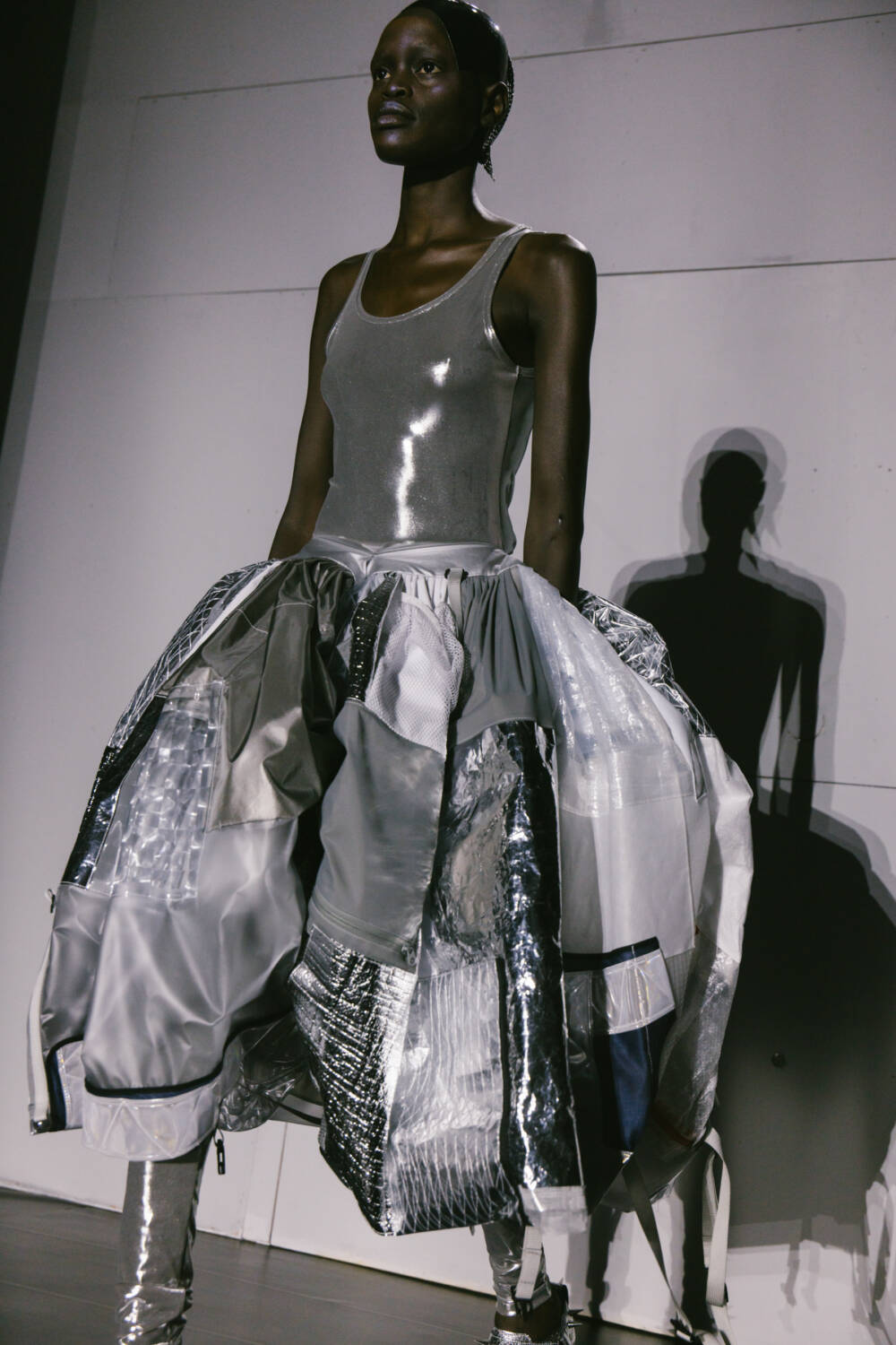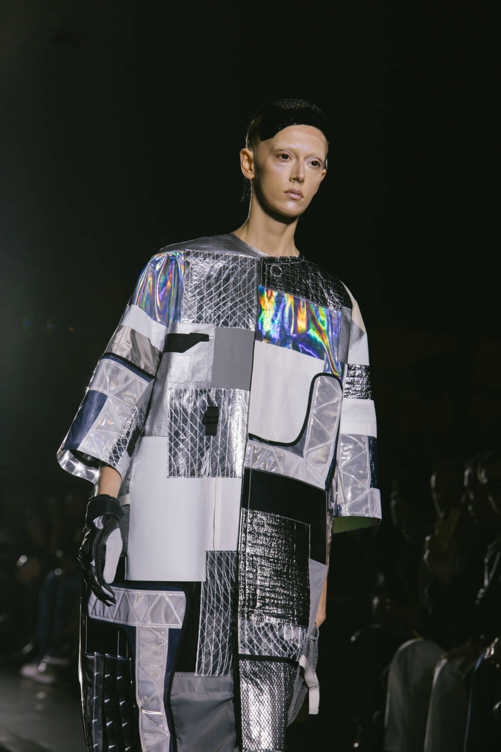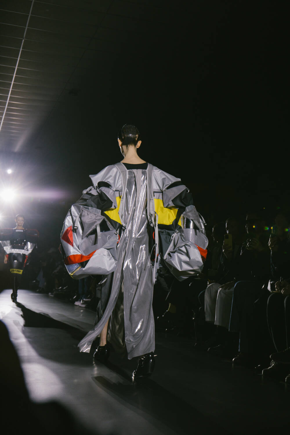 He proposed puffed-up skirts collaged from shiny silver patches, sculptural biker jackets and Innerraum backpacks pieced together to envision elegant, techy frocks. “I feel that abnormal clothing is necessary in our everyday life,” said the designer in his show notes. When it comes to this future-facing glamour, nothing’s short of spectacular.