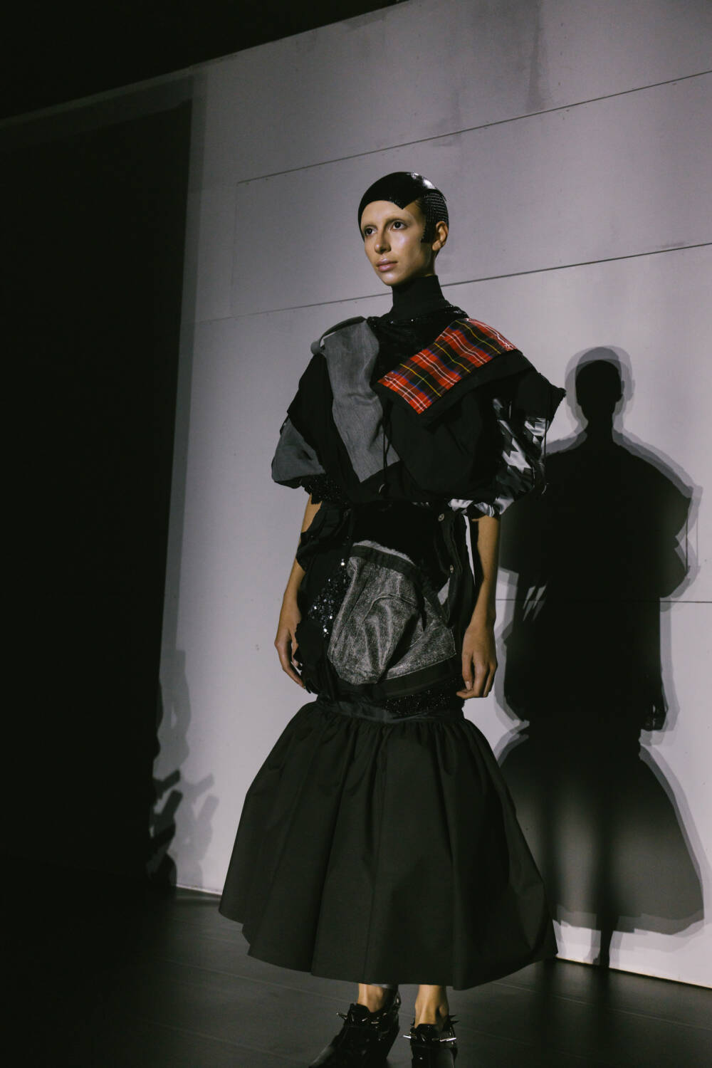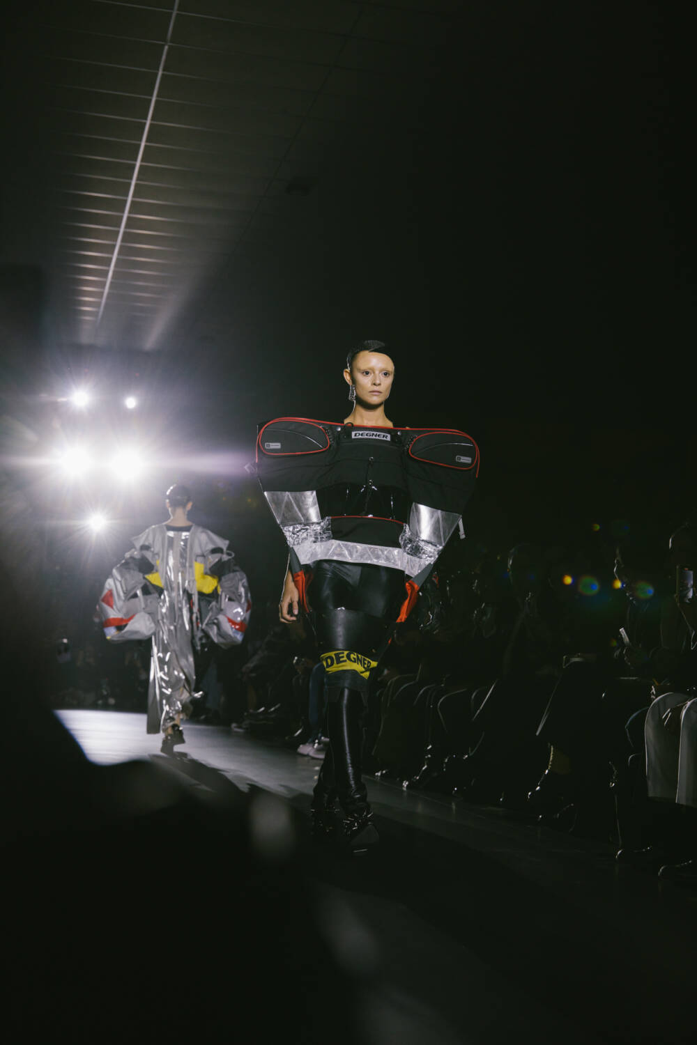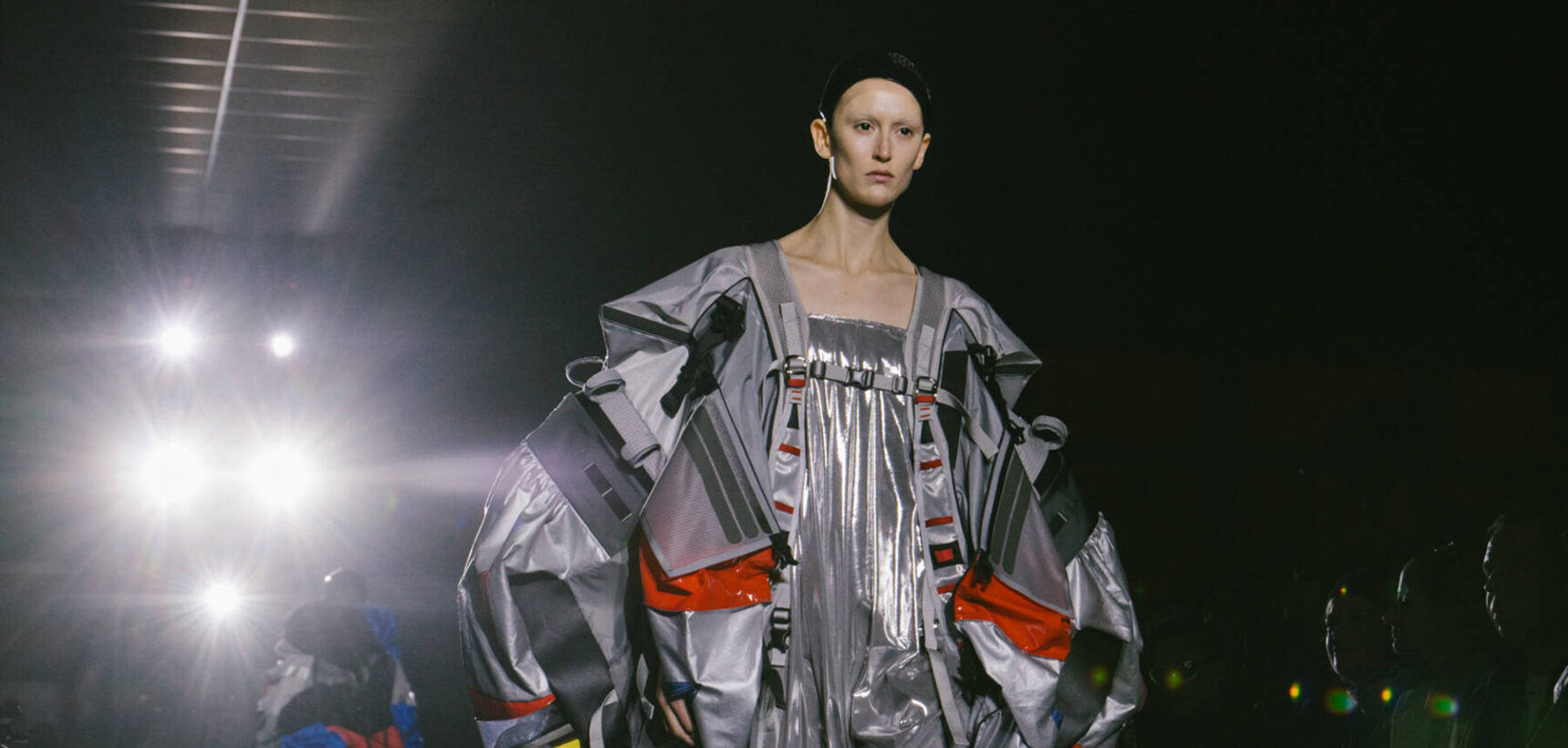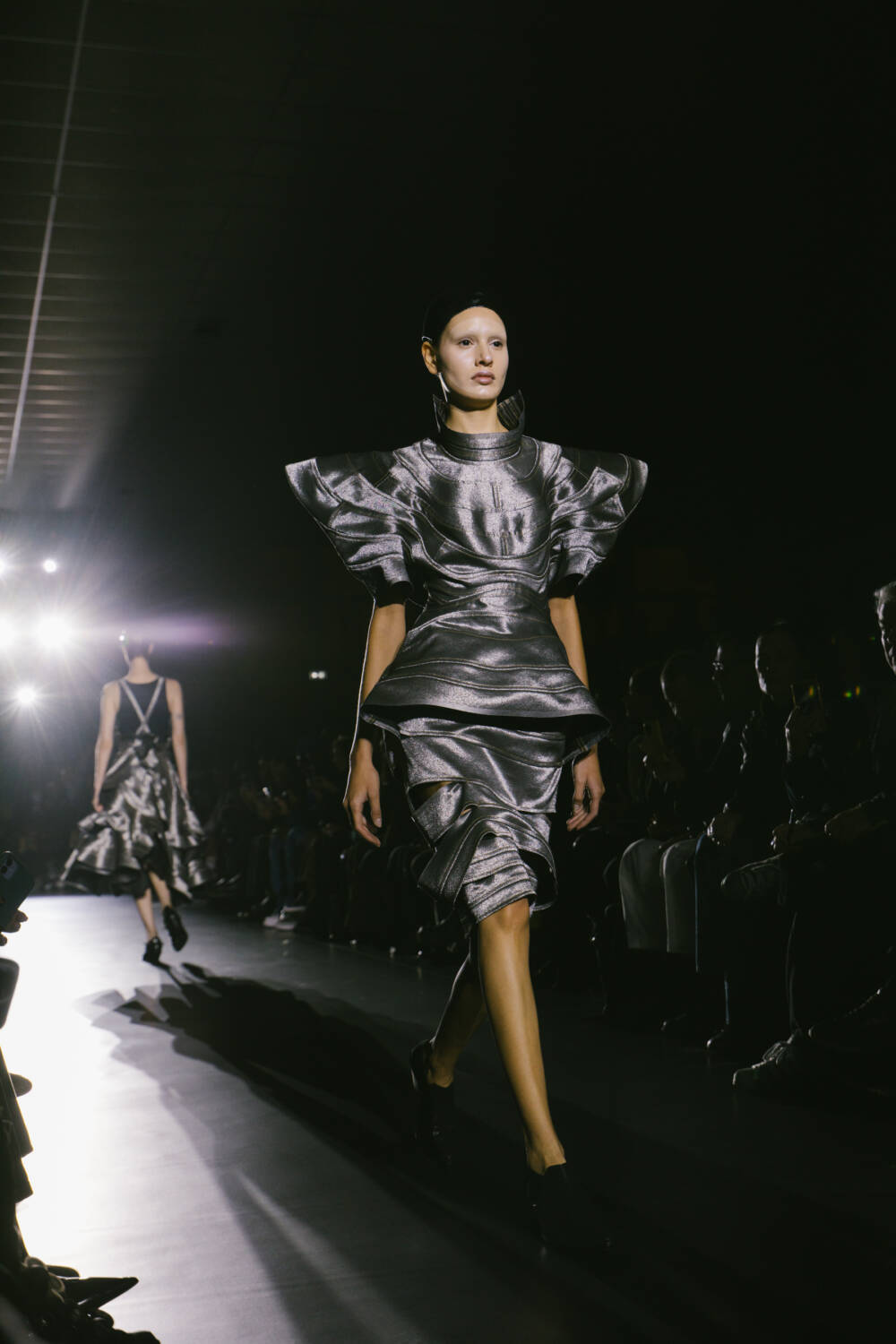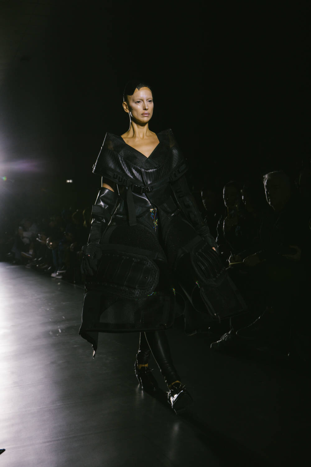 He proposed puffed-up skirts collaged from shiny silver patches, sculptural biker jackets and Innerraum backpacks pieced together to envision elegant, techy frocks. “I feel that abnormal clothing is necessary in our everyday life,” said the designer in his show notes. When it comes to this future-facing glamour, nothing’s short of spectacular.