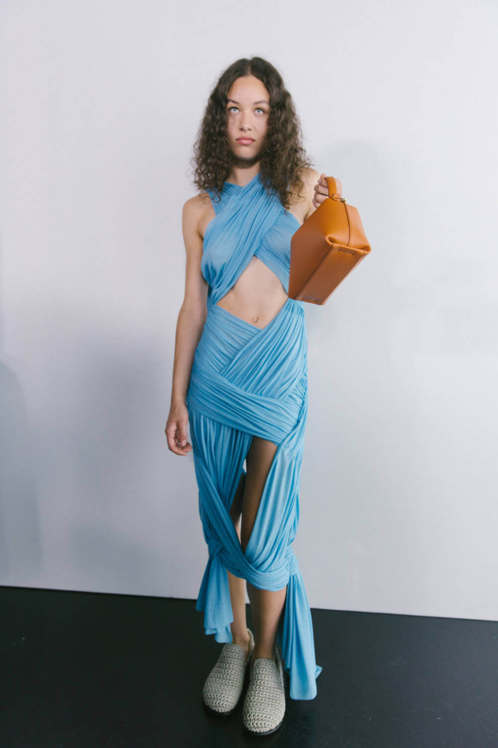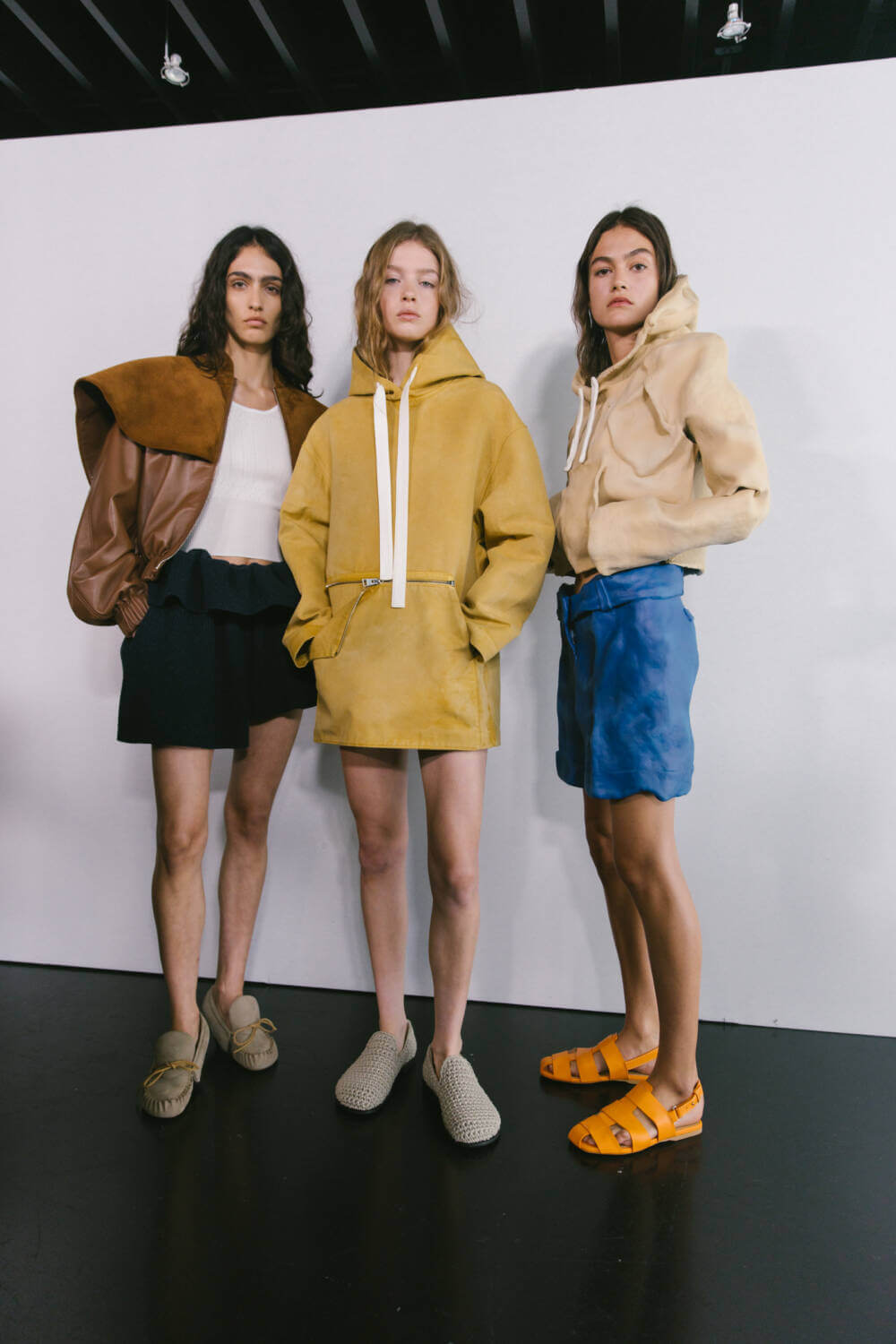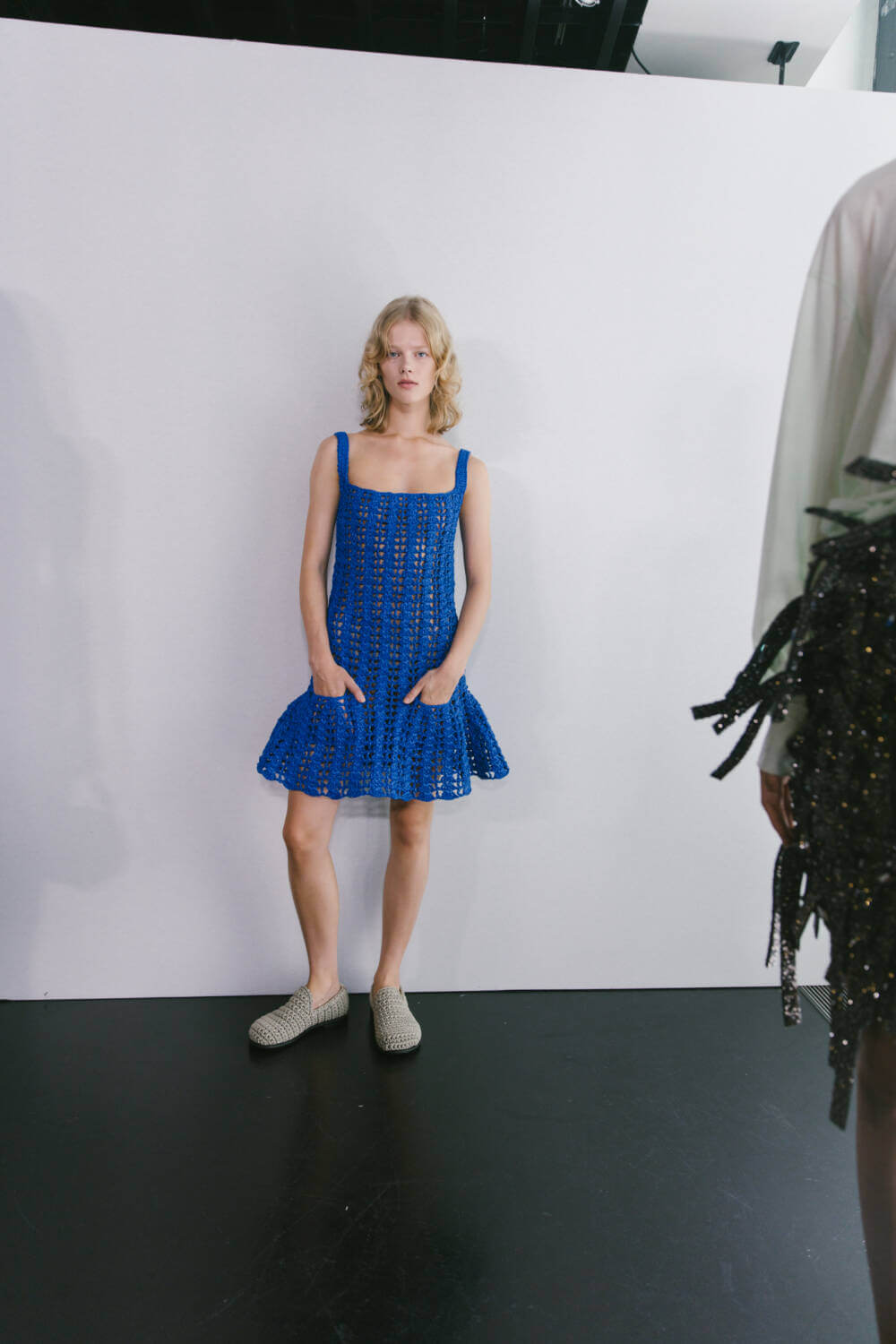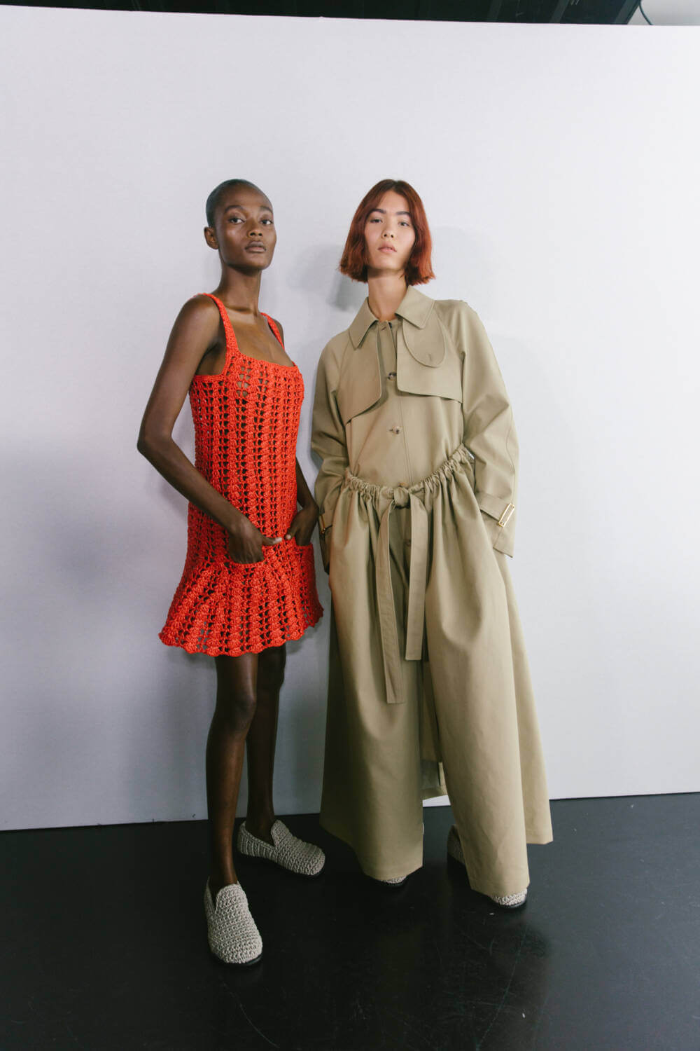 You’ve all heard of Big Dick Energy. The fashion equivalent is Big Show Energy, something JW Anderson delivers in abundance. He filled the huge Roundhouse venue with friends, fashion VIPs and fans, all fabulously decked out in his designs. Then he whacked up the volume on the soundtrack and sent out a collection that oozed creative confidence. The moulded hoodie and shorts that opened the show was akin to a wearable sculpture although the supple leather version that came out after showed just how deftly the designer straddles the art/fashion divide. Casual and statement sit comfortably together on the JW Anderson catwalk. The designer described the collection as a mix of practical and playful, where surprising proportions brought something fresh to wardrobe staples like cargo pants, bombers and blazers. Macrame mini dresses, padded, ‘sleeping bag’ separates, and silky hoodies worn with crystallised mini skirts were in the mix along with slouchy tailoring and on-the-money accessories (woven loafers, unstructured leather bags and fisherman’s sandals). You could hear the tills ringing as each look strode by.