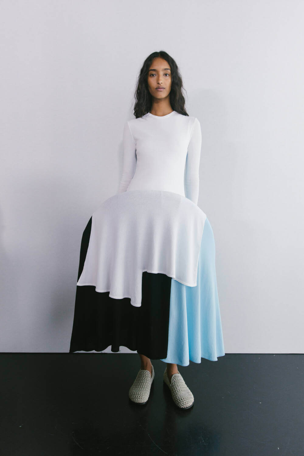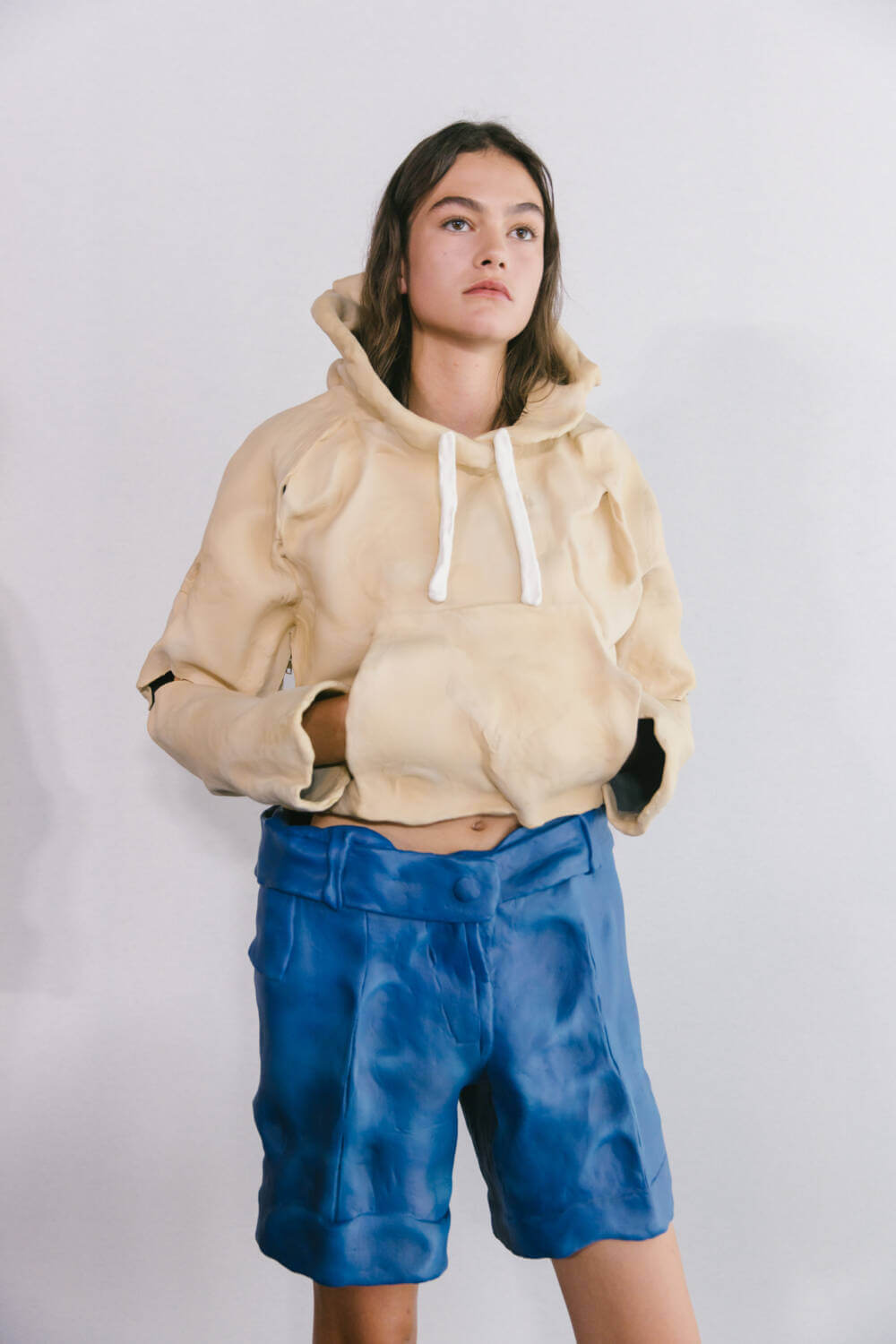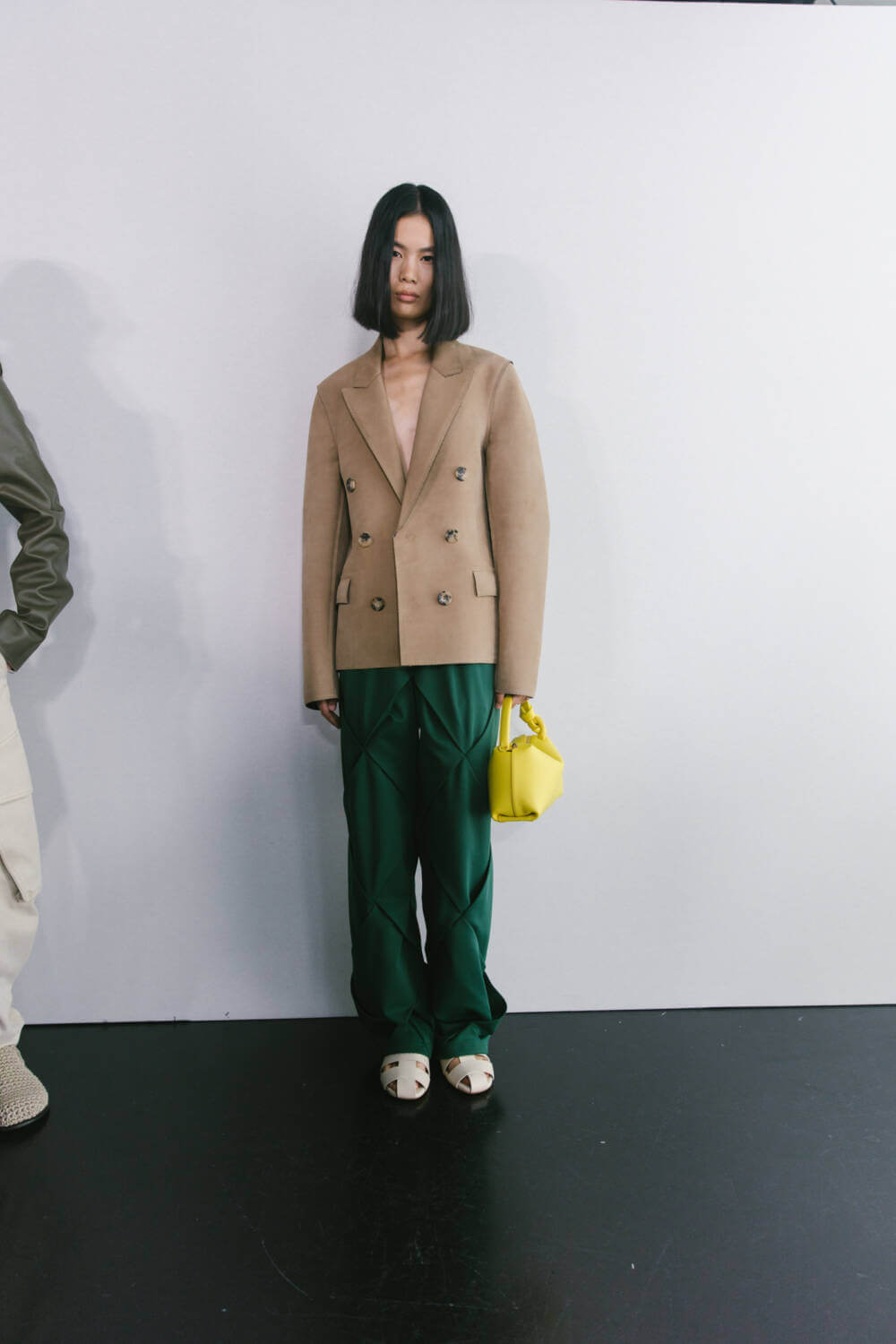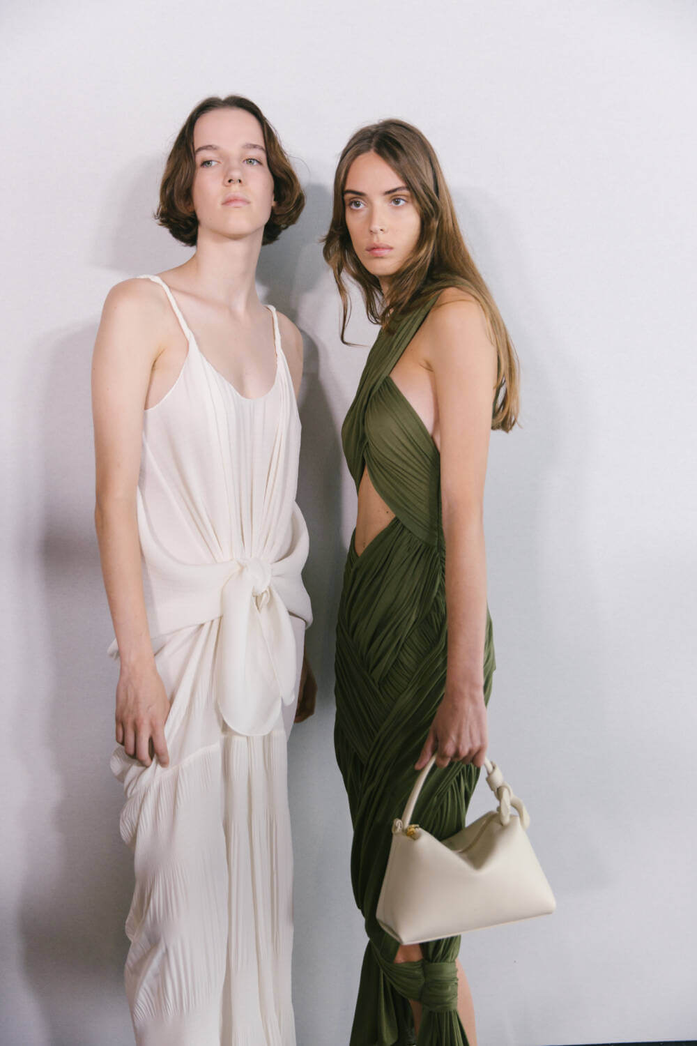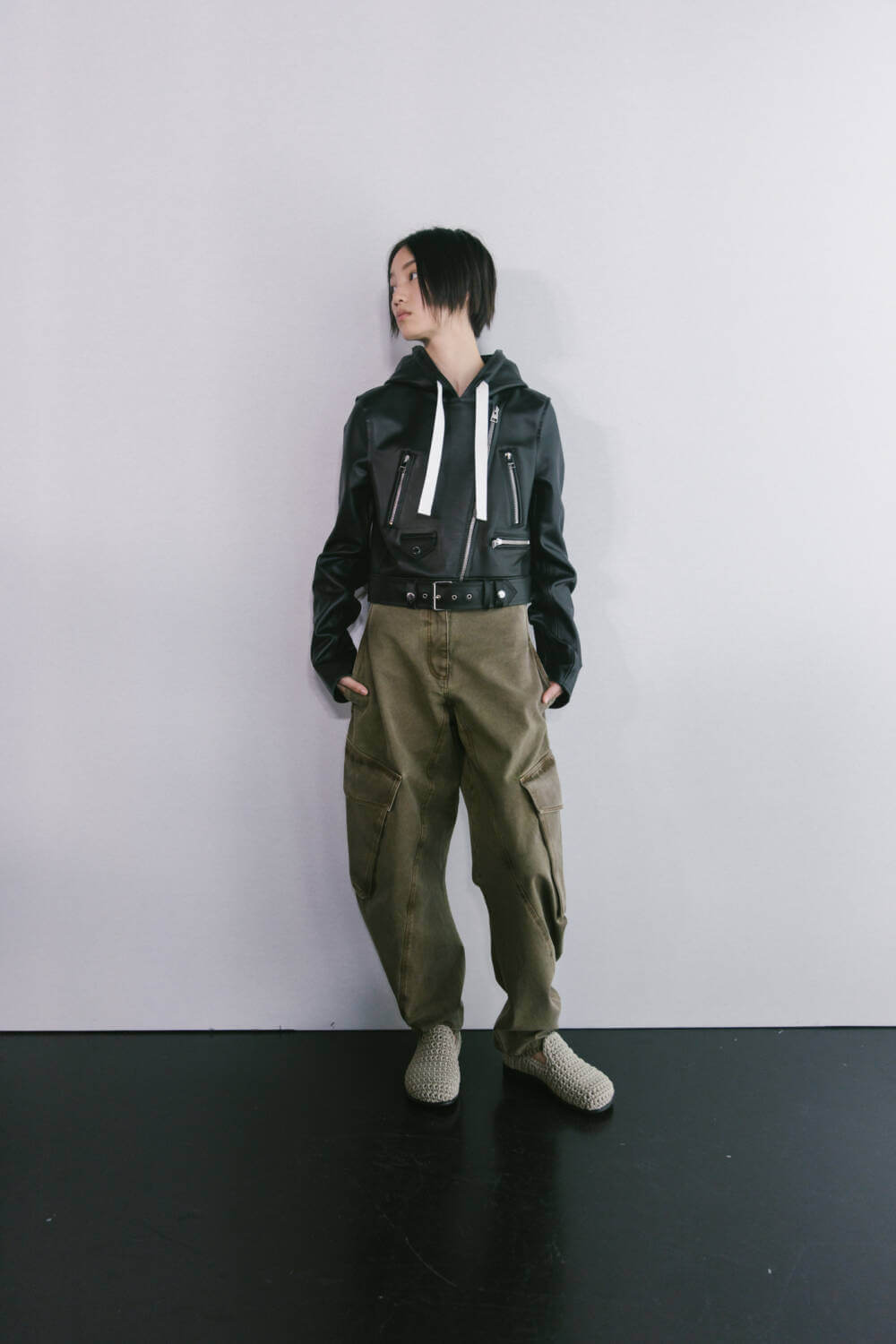 You’ve all heard of Big Dick Energy. The fashion equivalent is Big Show Energy, something JW Anderson delivers in abundance. He filled the huge Roundhouse venue with friends, fashion VIPs and fans, all fabulously decked out in his designs. Then he whacked up the volume on the soundtrack and sent out a collection that oozed creative confidence. The moulded hoodie and shorts that opened the show was akin to a wearable sculpture although the supple leather version that came out after showed just how deftly the designer straddles the art/fashion divide. Casual and statement sit comfortably together on the JW Anderson catwalk. The designer described the collection as a mix of practical and playful, where surprising proportions brought something fresh to wardrobe staples like cargo pants, bombers and blazers. Macrame mini dresses, padded, ‘sleeping bag’ separates, and silky hoodies worn with crystallised mini skirts were in the mix along with slouchy tailoring and on-the-money accessories (woven loafers, unstructured leather bags and fisherman’s sandals). You could hear the tills ringing as each look strode by.