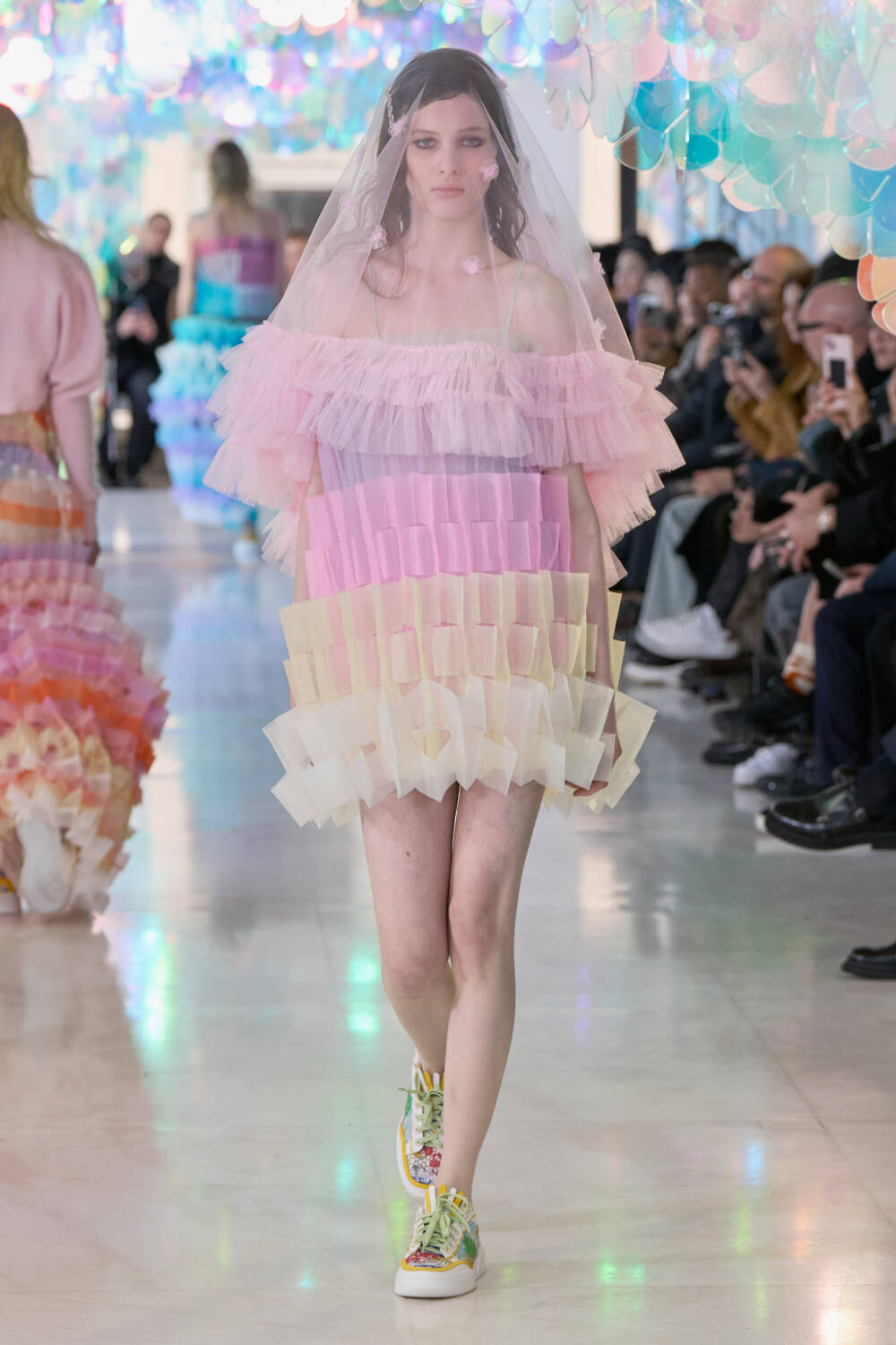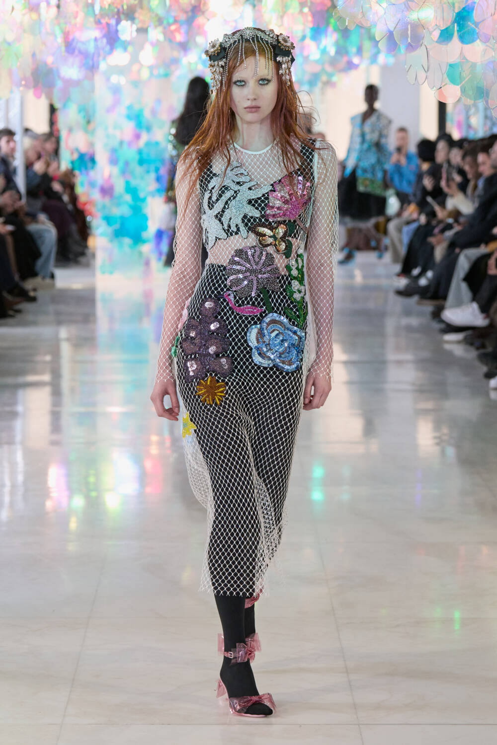 A sweeping swing coat was an archive silhouette, but was hand-painted with scenes from the Chinese countryside by Fang’s artist mother. The archive also inspired the 3D sequin flowers which encrusted cute little mini skirts and dresses plus a series of holographic sequin looks. An archival floral lace design was reinterpreted in laser cut organza and the designer transposed her painterly prints onto a classic D&G lingerie dress. Fang crossed Chinese imperial jewellery with the ornate headbands worn in the Sicilian court.