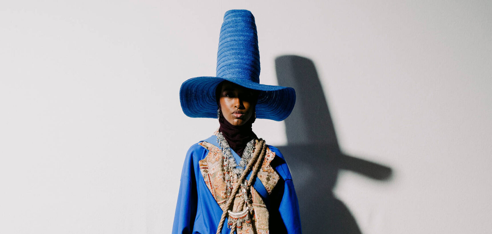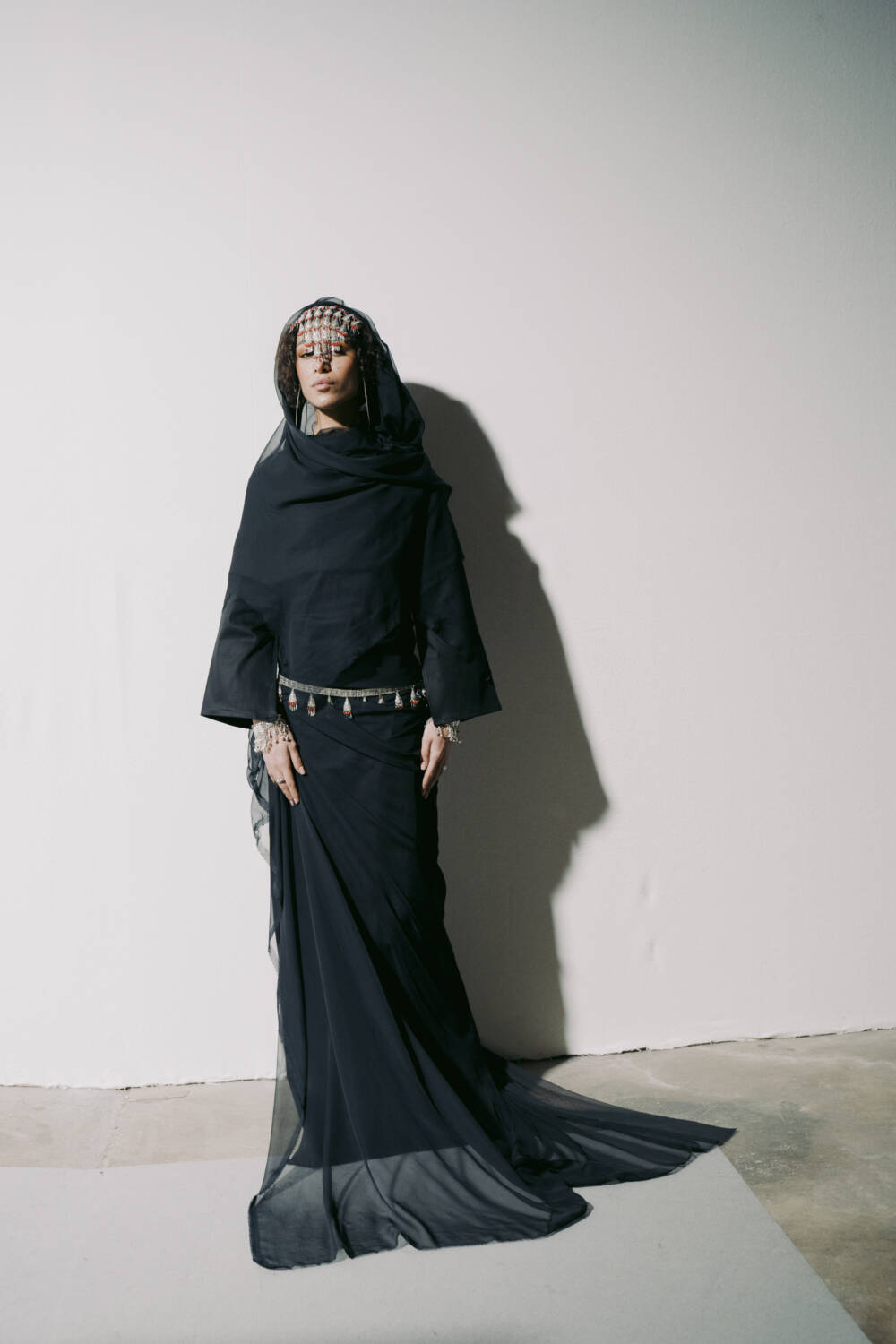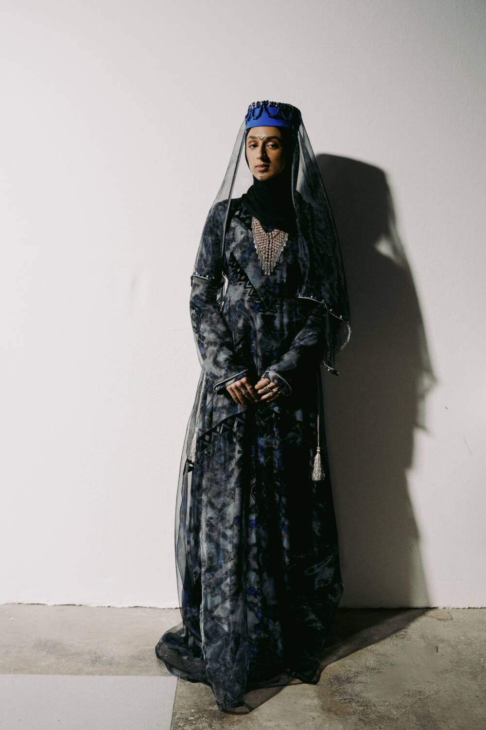 Walking down the slanted slope of the BFC Newgen space for Kazna Asker’s presentation yesterday meant being greeted with welcome sights and resonant sounds. The Tottenham-based designer, who roots her practice in themes of migration and a contemporary expression of traditional Yemeni dress, made the inspired decision to transport guests to a mock souk in the heart of Yafa.