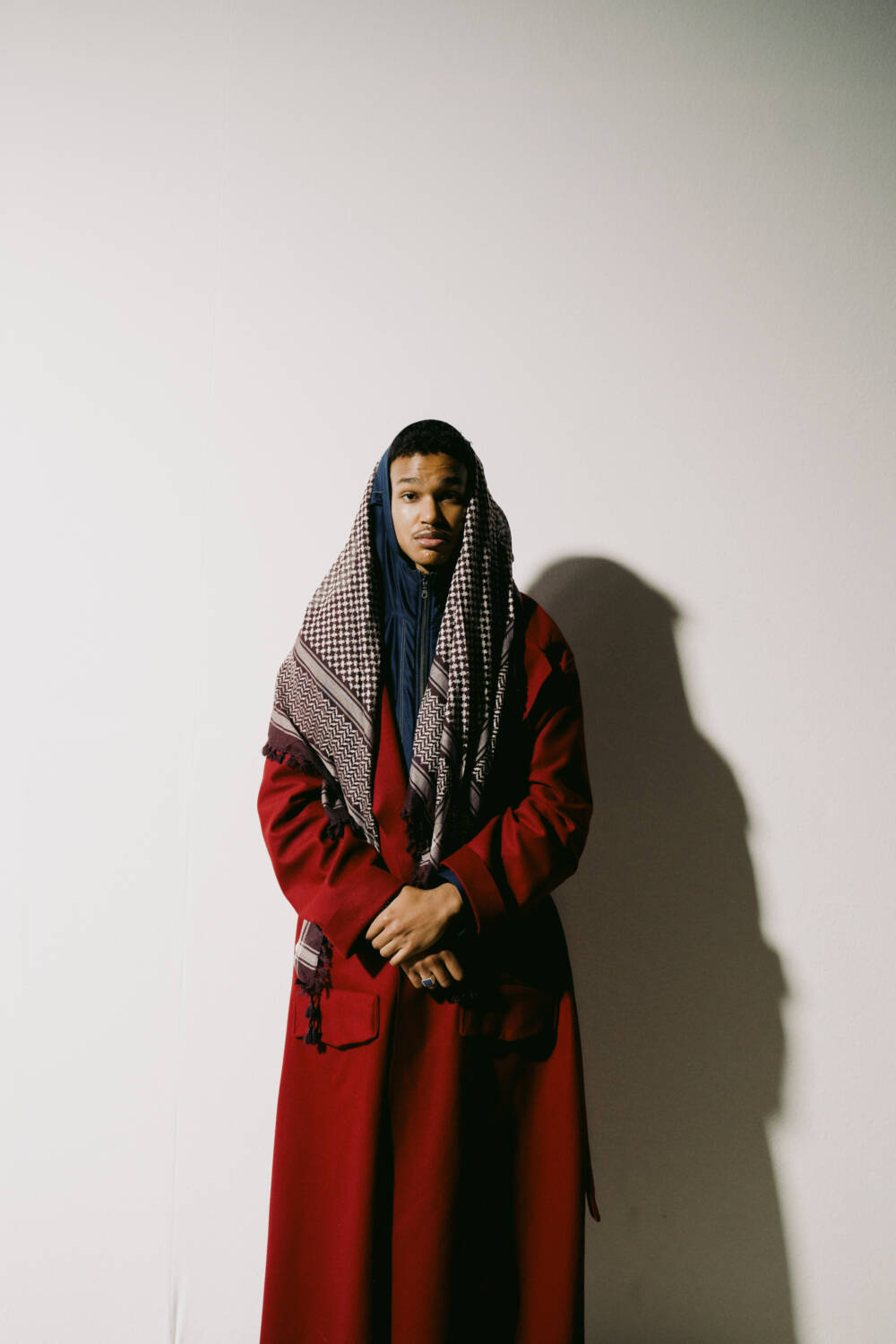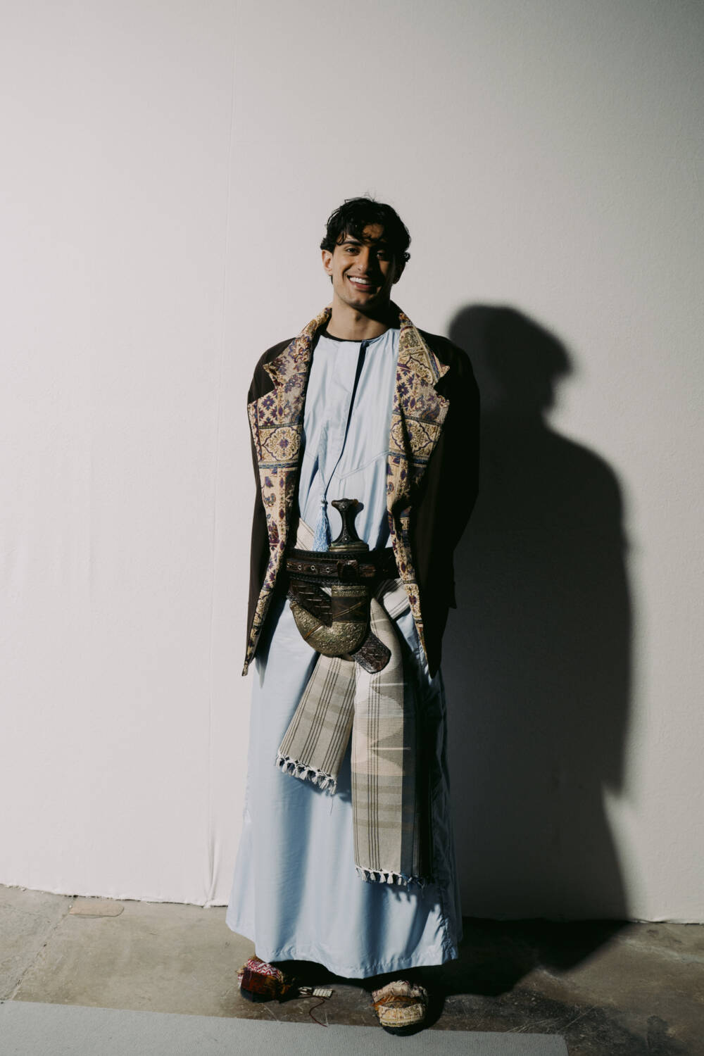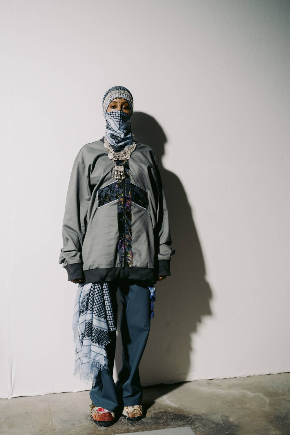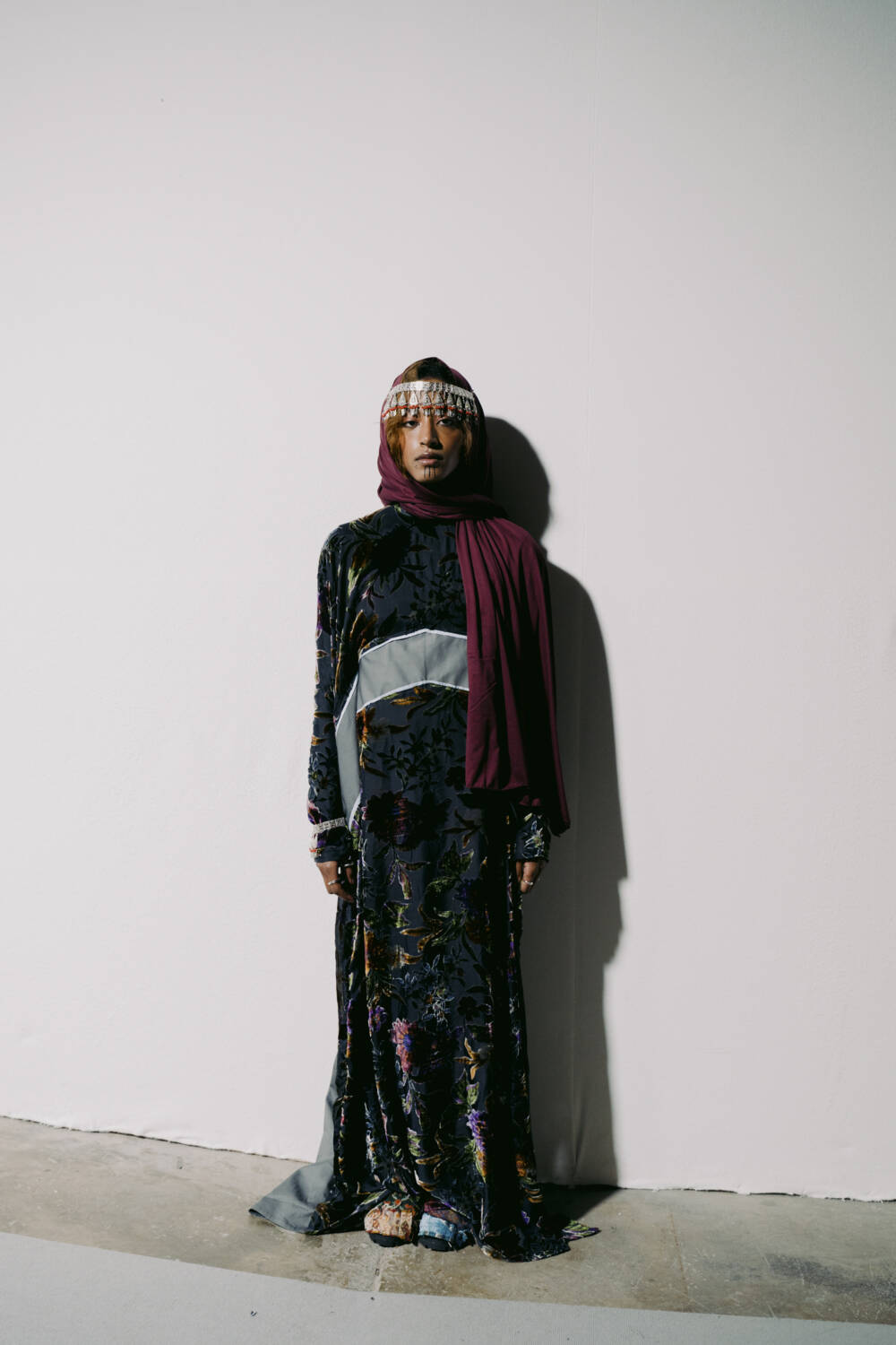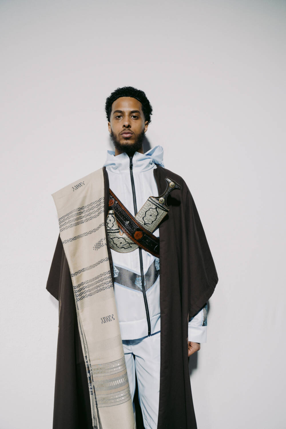 In true Asker style, the garments were heavily moulded around classic Middle Eastern dress, but with a sportswear twist. The Abaya, a fluid dress, was updated using contemporary draping techniques, whilst the menswear saw Asker blend cloaks and thobes with loose-fitting track jackets. Pieces were crafted using traditional upholstery textiles with sharp injections of cobalt blue and rich red. It was a warm embrace of the cross-cultural experience; a love letter written with fabric, stitched together with heart.