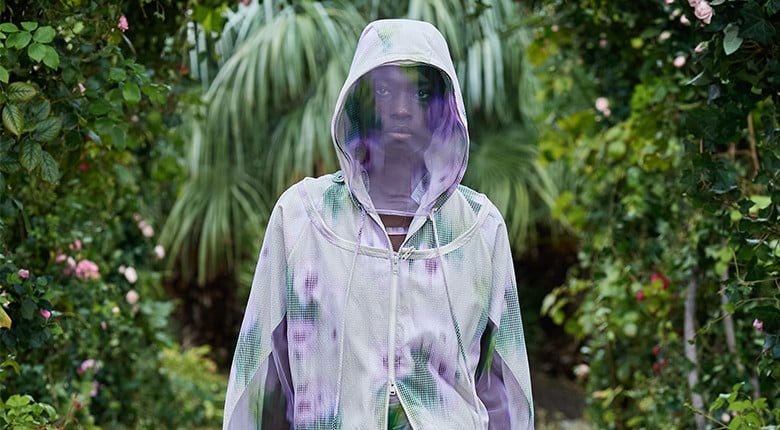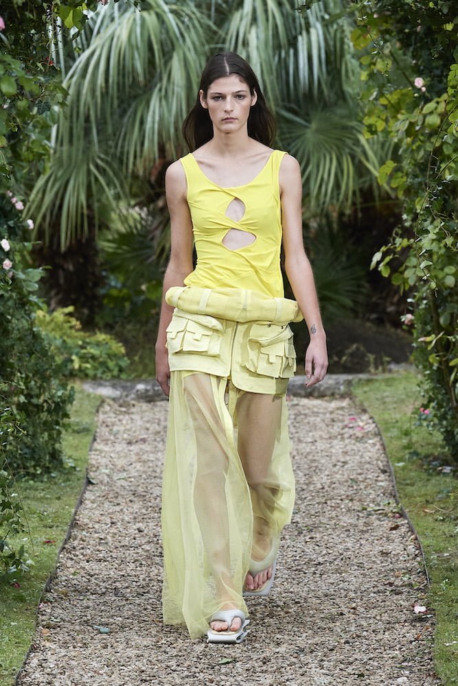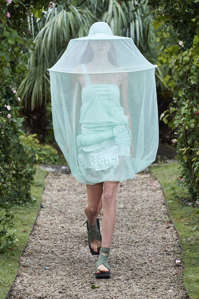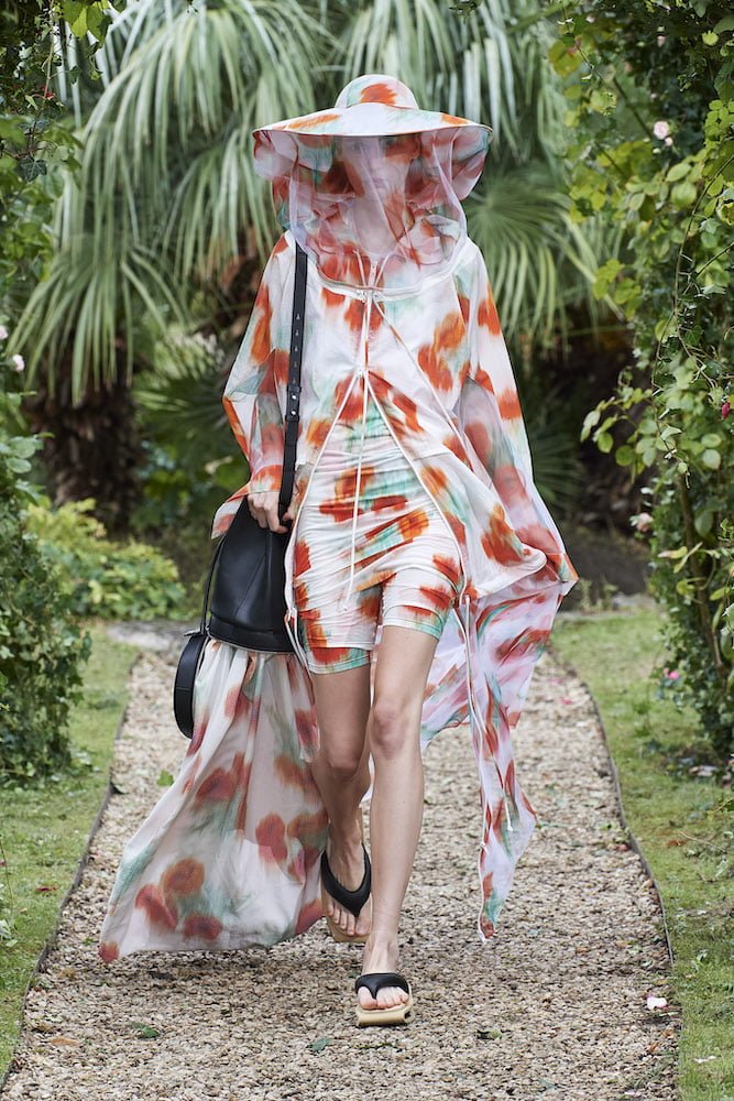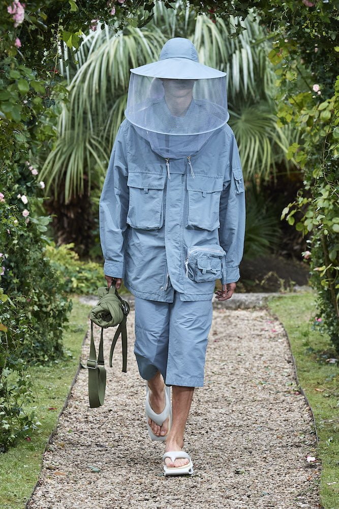 Optimism and pragmatism reigned supreme at Kenzo, where the talented Felipe Oliveira Baptista created a look that addressed Covid realities in soaring style. Inspired by bees, “the regulators of the planet,” and their fundamental relationship with mankind, Baptista based his look on the beekeeper’s protective uniform. Wide hats with veils that extended all the way down, enclosing the wearer, were the recurring motif of this co-ed show. They were worn with Stretchy vest dresses and cut out leggings or multi-pocket jackets and utility trousers.