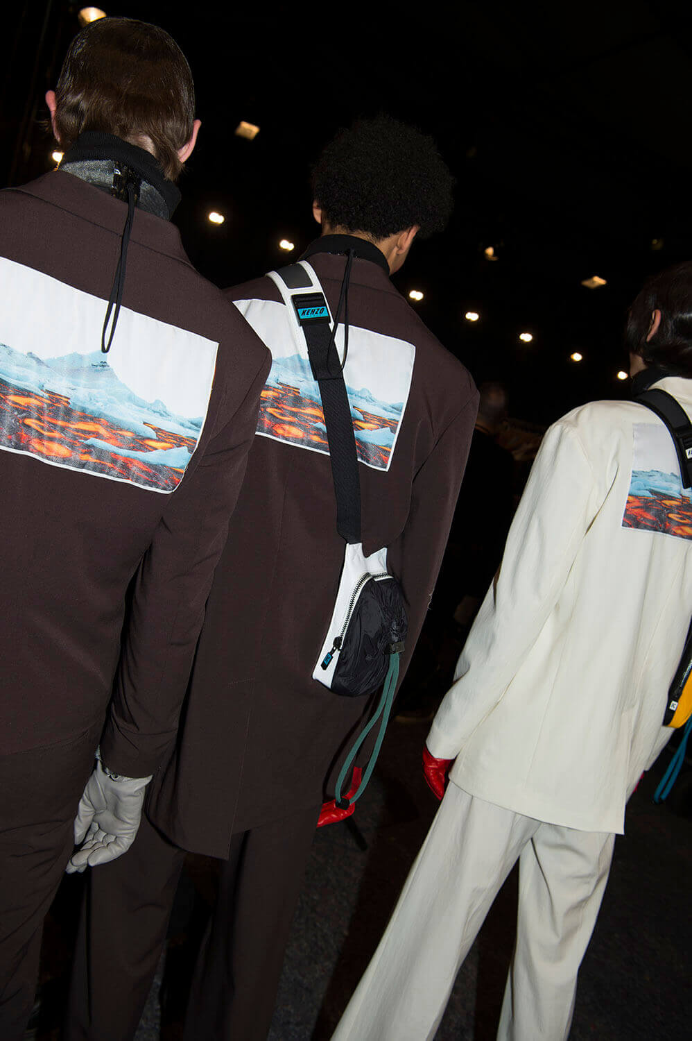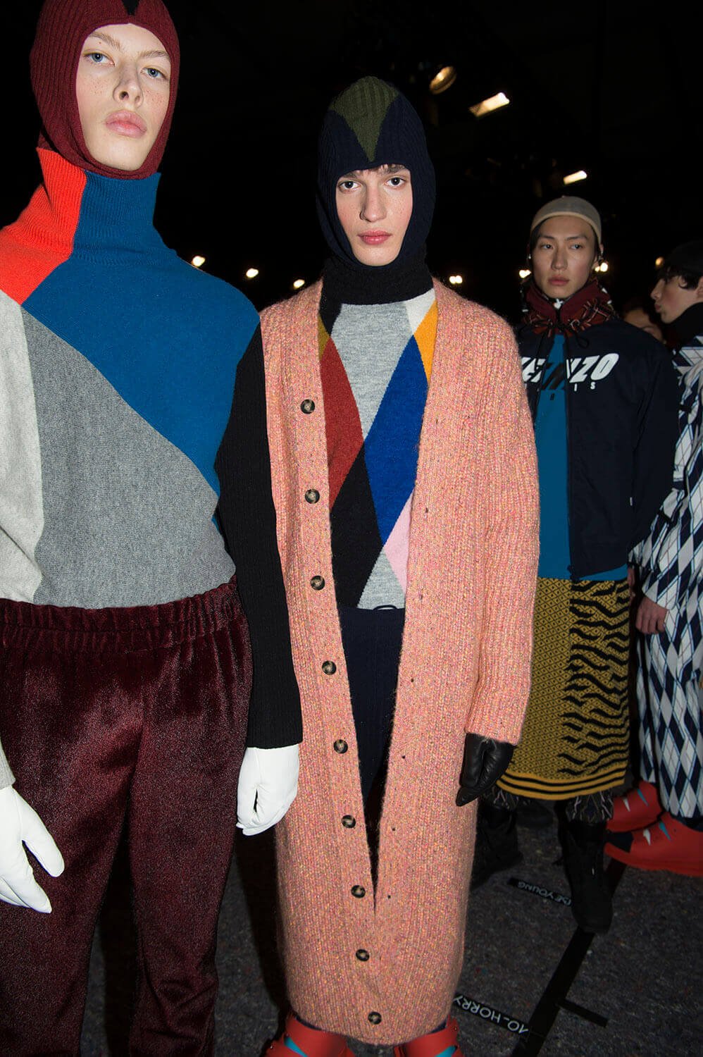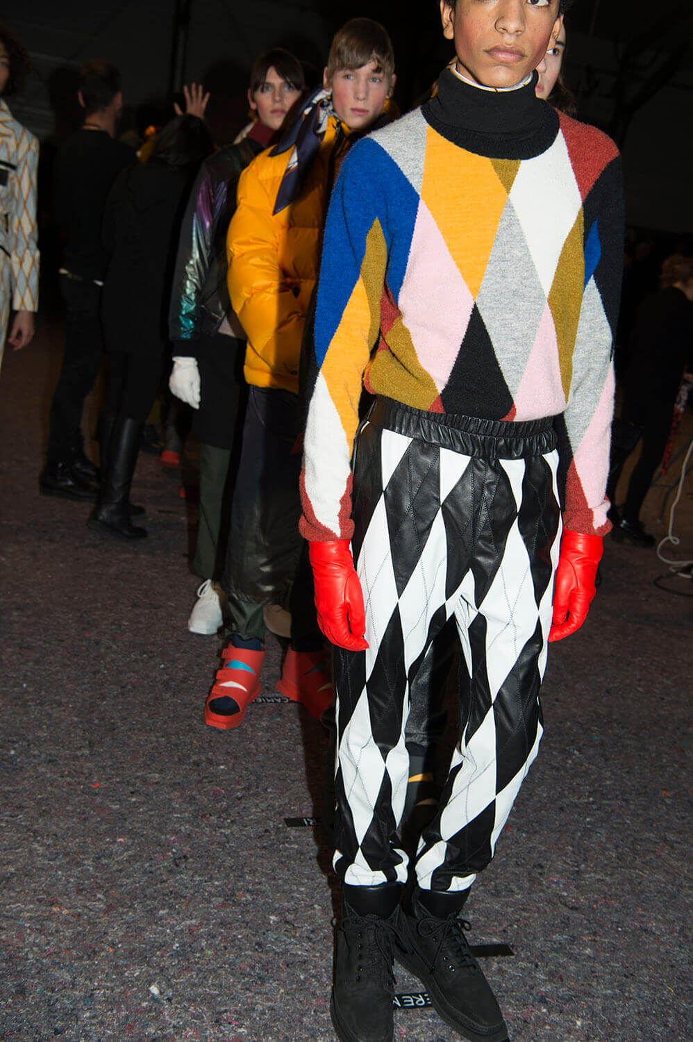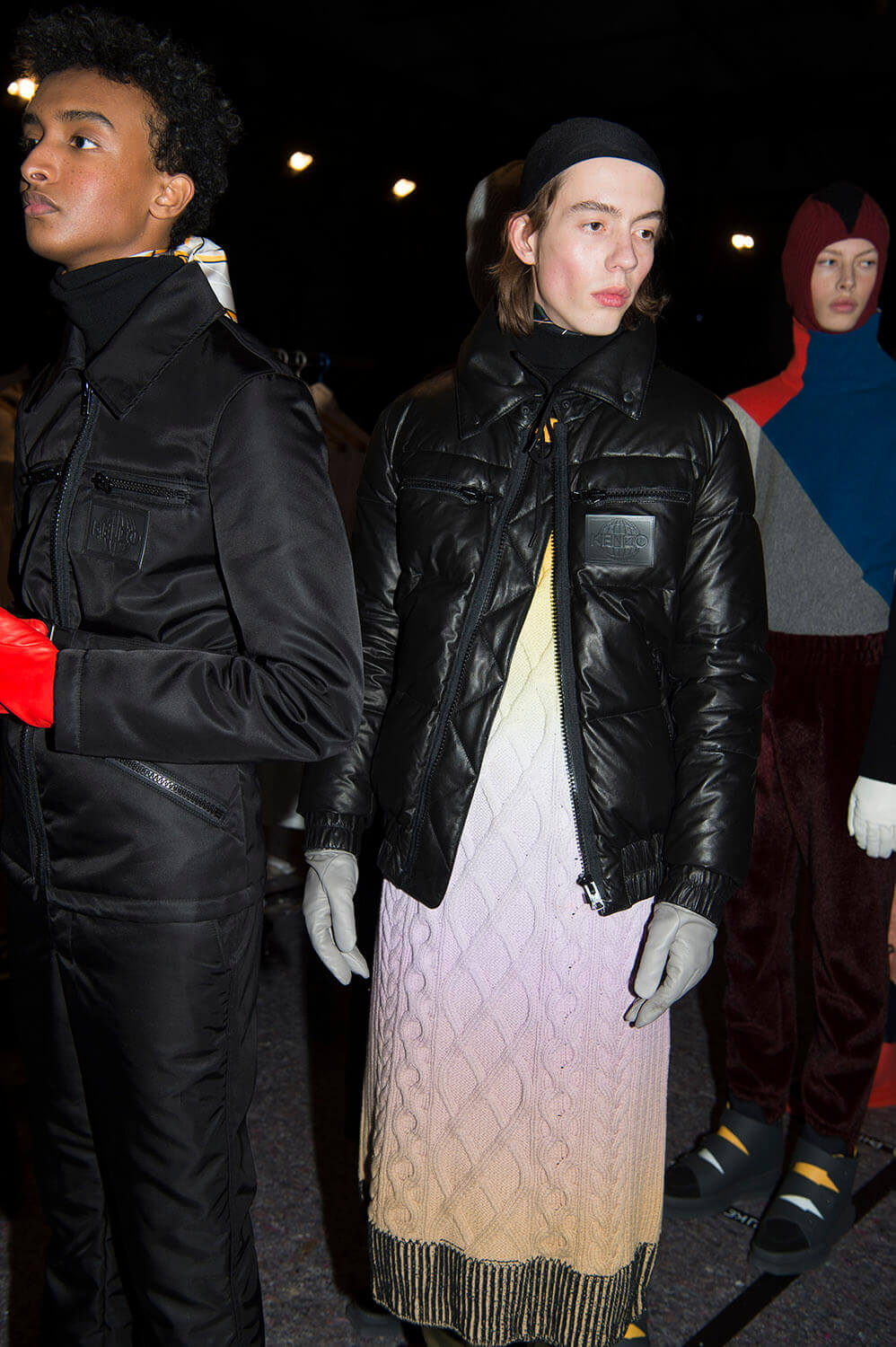 Correct me if I’m wrong, but to (possibly incorrectly) utilise a term learnt in GCSE English, is this not what one would call the breaking down of the fourth wall? The drawing back of the curtain? Because this evening, for Kenzo’s AW17 show (their first combined mens and womenswear outing) the backstage became front of stage. Line-up, hair and make-up, backstage photogs. All on show. A meta-moment. Which was a choice, apparently, made for sustainability purposes in association with charity Ideas For Us. Makes sense – who needs a fuck off fashion show when you have some really great clothes? And really great clothes Humberto and Carol gave us, inspired by, as the notes told us, a subculture of Arctic surfers. Which, from what we can gather, are like the normal type of surfers, but a bit colder. Point Break on ice. And a necessity, one would presume, for such cold weather based pursuits is warmth. Protection against the elements. So that became the kind of raison d’être of the collection – technical outerwear, from puffas to cinched ski jackets, anoraks (one, two, three’s a trend) and heavy snowboard-style boots. Knitwear that extended over the head, balaclava style. But all enlivened with that sort of haze of hippie day-glo surfer – long degrade jumpers, floral Hawaiian prints, harlequin diamonds. A zingy colour palette of orange, lemon yellow and glacier blue. It was rad. And, with that, our adventures in the land of menswear end come to an end for another season. It’s been a blast. Over and out…