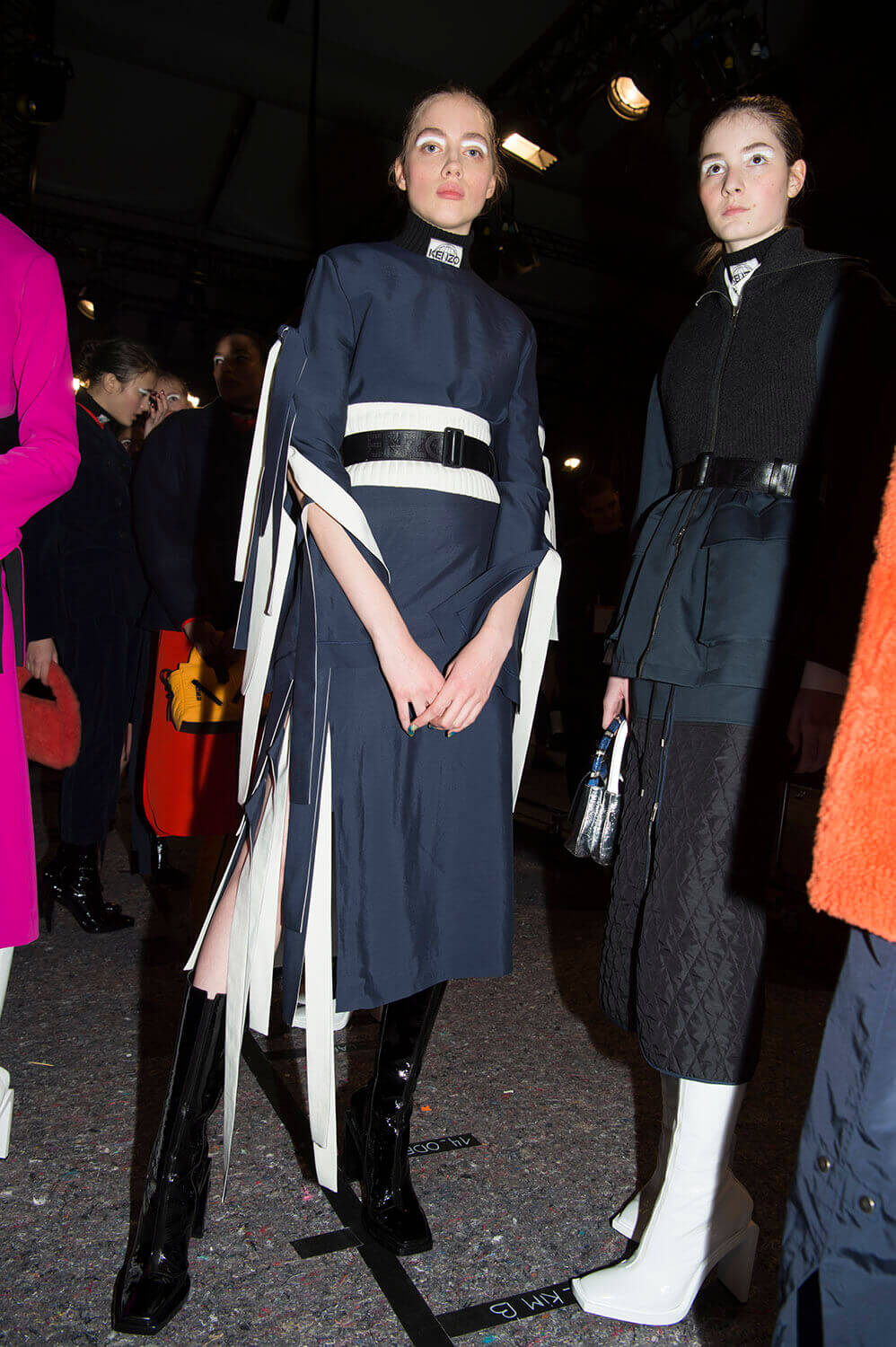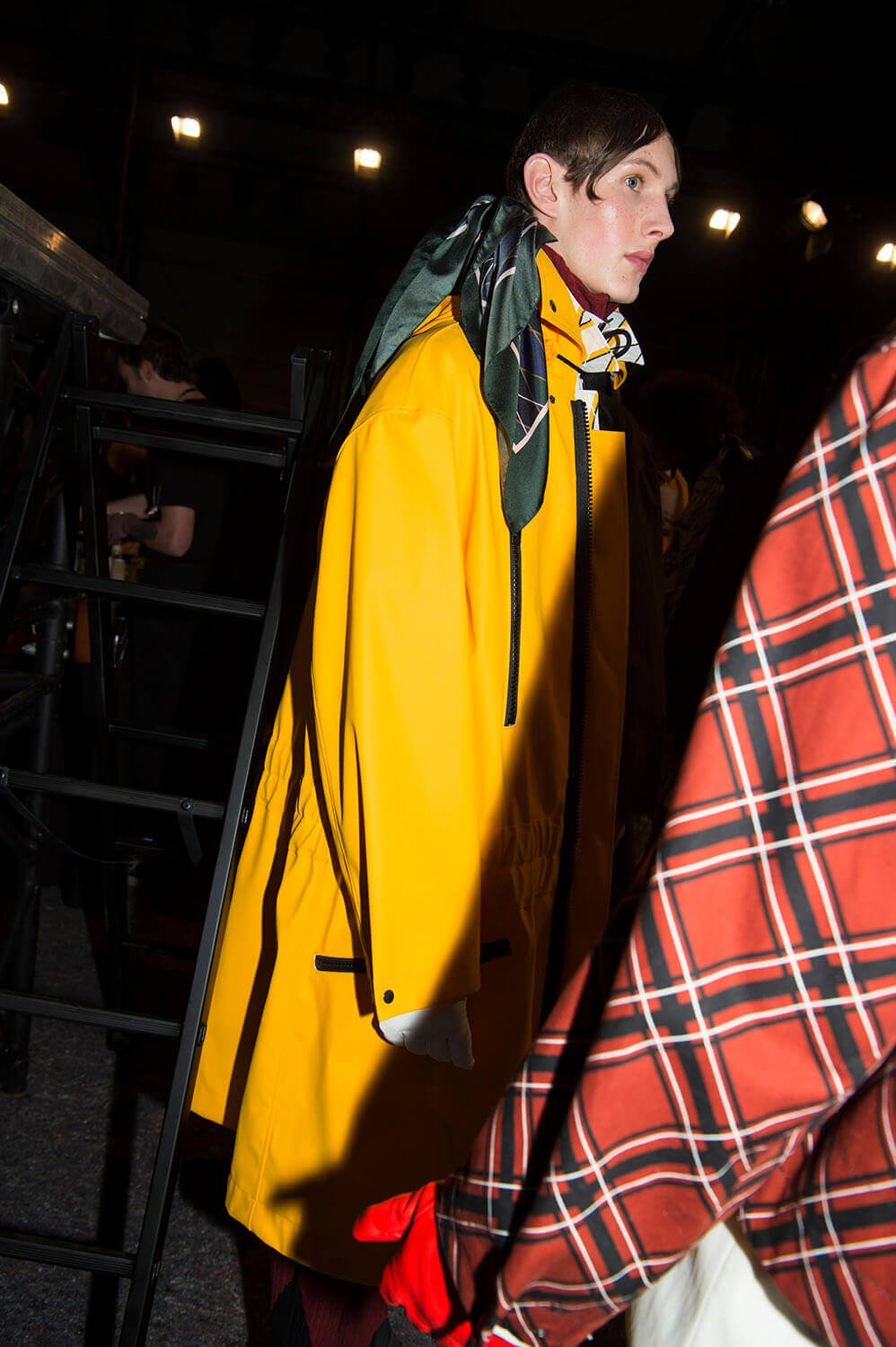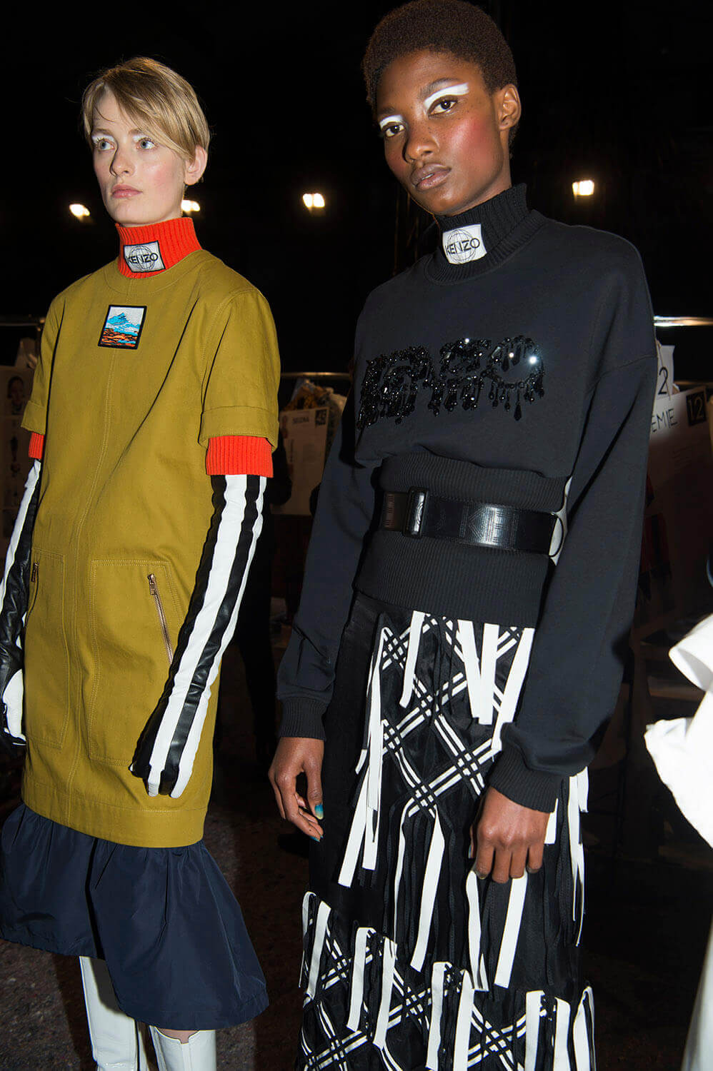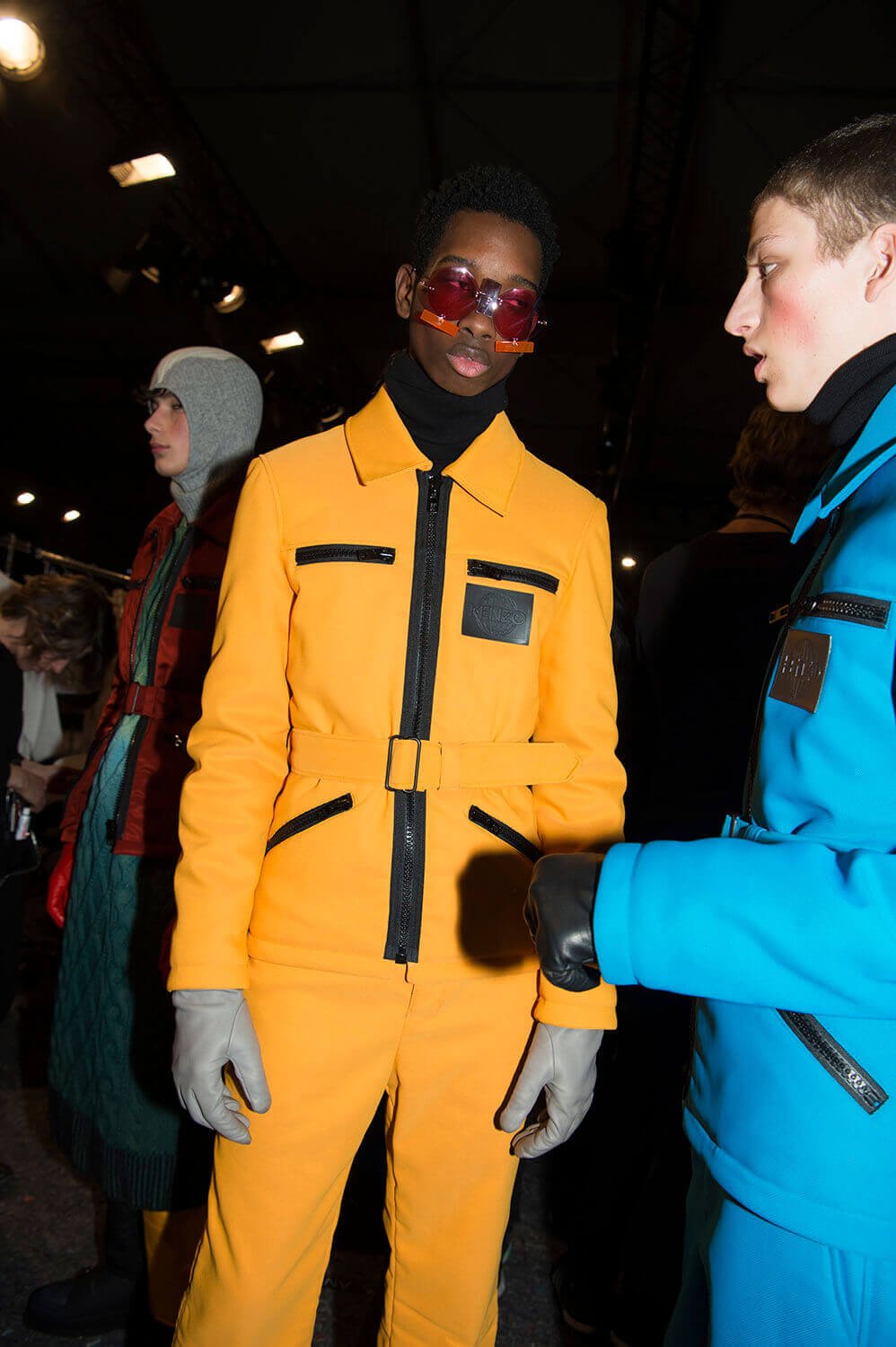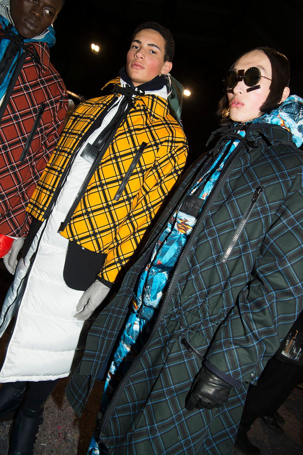 Correct me if I’m wrong, but to (possibly incorrectly) utilise a term learnt in GCSE English, is this not what one would call the breaking down of the fourth wall? The drawing back of the curtain? Because this evening, for Kenzo’s AW17 show (their first combined mens and womenswear outing) the backstage became front of stage. Line-up, hair and make-up, backstage photogs. All on show. A meta-moment. Which was a choice, apparently, made for sustainability purposes in association with charity Ideas For Us. Makes sense – who needs a fuck off fashion show when you have some really great clothes? And really great clothes Humberto and Carol gave us, inspired by, as the notes told us, a subculture of Arctic surfers. Which, from what we can gather, are like the normal type of surfers, but a bit colder. Point Break on ice. And a necessity, one would presume, for such cold weather based pursuits is warmth. Protection against the elements. So that became the kind of raison d’être of the collection – technical outerwear, from puffas to cinched ski jackets, anoraks (one, two, three’s a trend) and heavy snowboard-style boots. Knitwear that extended over the head, balaclava style. But all enlivened with that sort of haze of hippie day-glo surfer – long degrade jumpers, floral Hawaiian prints, harlequin diamonds. A zingy colour palette of orange, lemon yellow and glacier blue. It was rad. And, with that, our adventures in the land of menswear end come to an end for another season. It’s been a blast. Over and out…