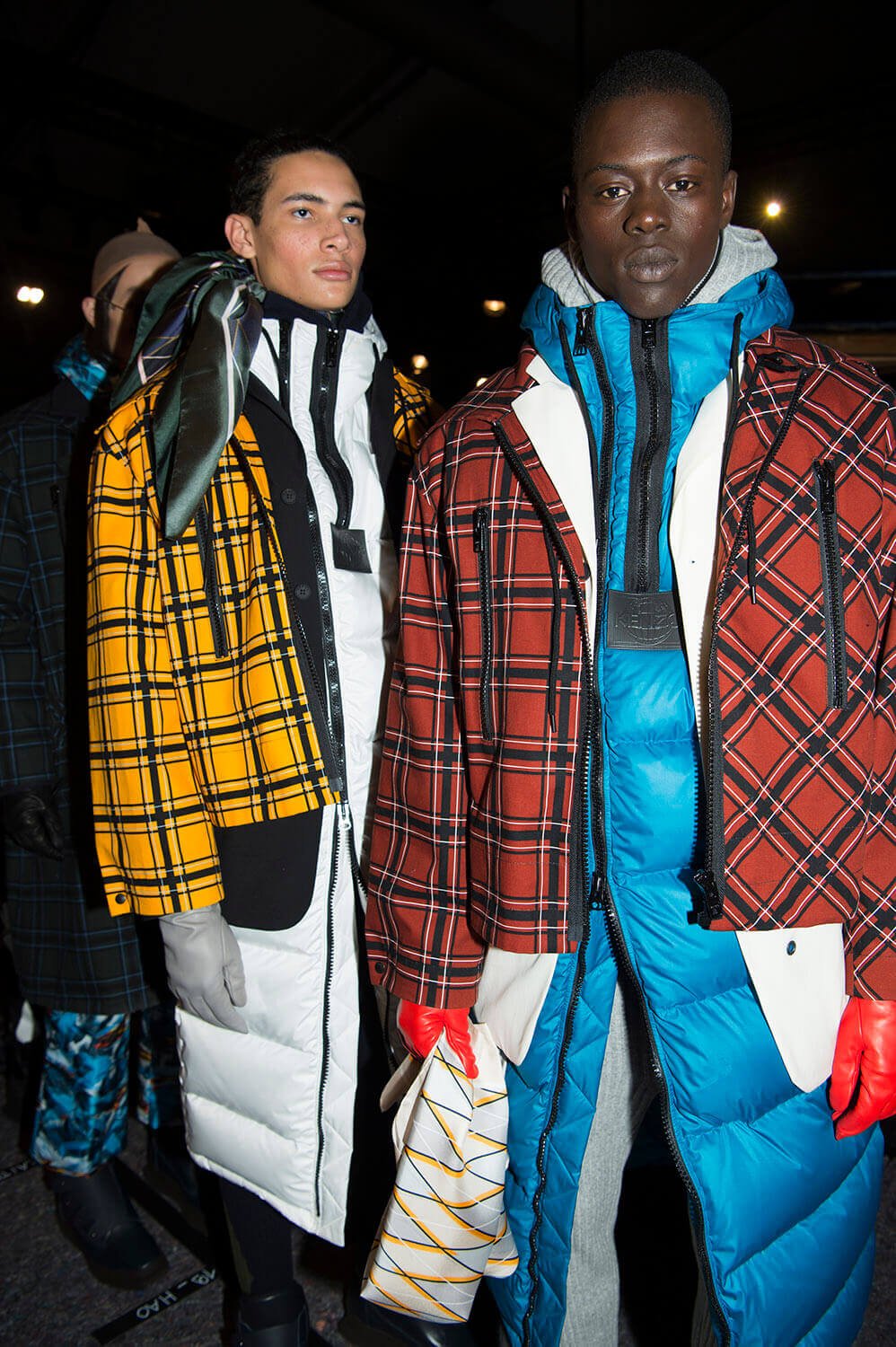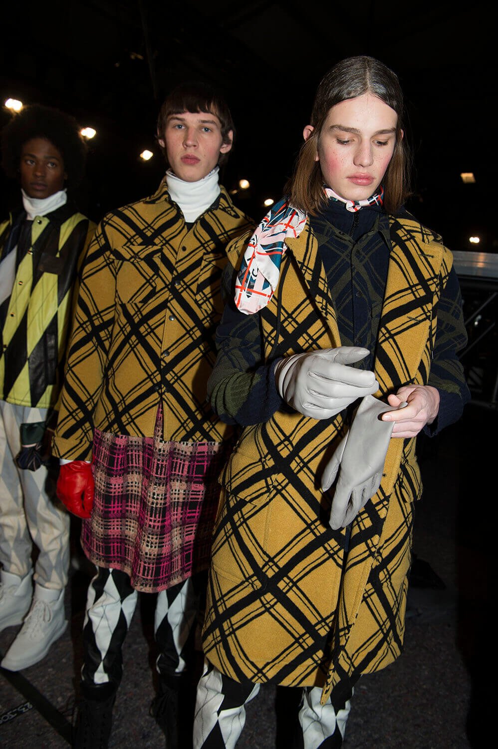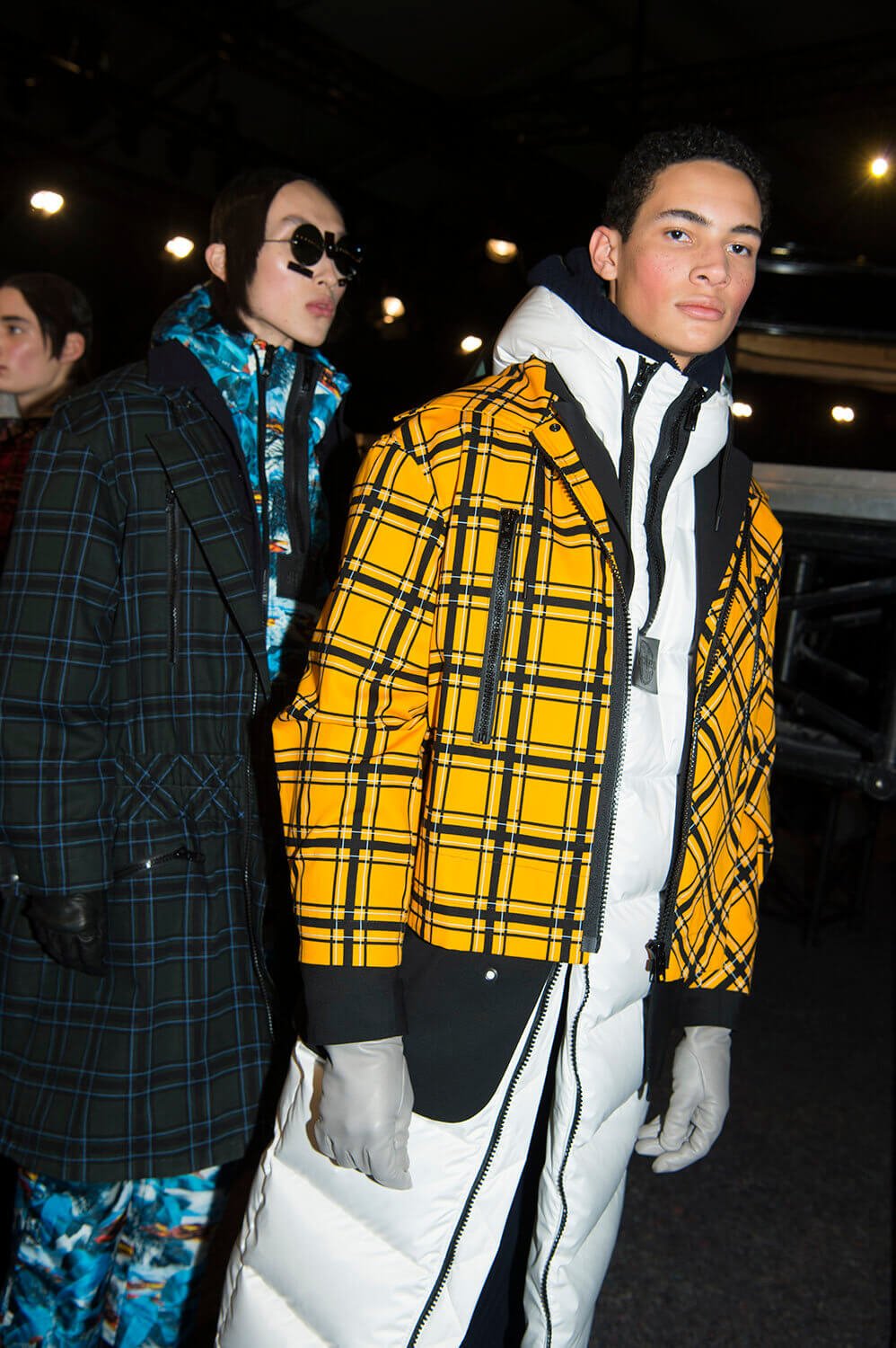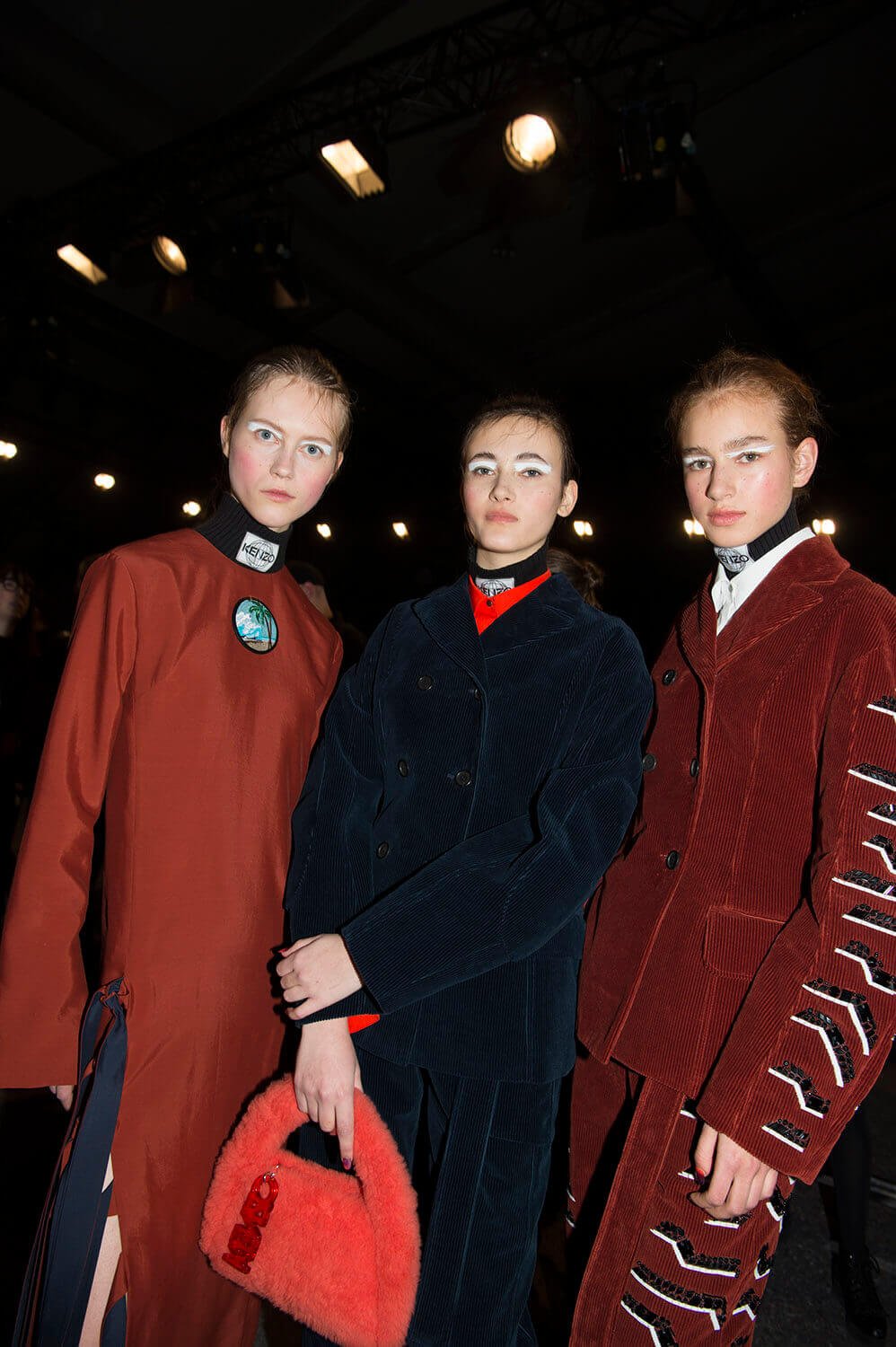 Correct me if I’m wrong, but to (possibly incorrectly) utilise a term learnt in GCSE English, is this not what one would call the breaking down of the fourth wall? The drawing back of the curtain? Because this evening, for Kenzo’s AW17 show (their first combined mens and womenswear outing) the backstage became front of stage. Line-up, hair and make-up, backstage photogs. All on show. A meta-moment. Which was a choice, apparently, made for sustainability purposes in association with charity Ideas For Us. Makes sense – who needs a fuck off fashion show when you have some really great clothes? And really great clothes Humberto and Carol gave us, inspired by, as the notes told us, a subculture of Arctic surfers. Which, from what we can gather, are like the normal type of surfers, but a bit colder. Point Break on ice. And a necessity, one would presume, for such cold weather based pursuits is warmth. Protection against the elements. So that became the kind of raison d’être of the collection – technical outerwear, from puffas to cinched ski jackets, anoraks (one, two, three’s a trend) and heavy snowboard-style boots. Knitwear that extended over the head, balaclava style. But all enlivened with that sort of haze of hippie day-glo surfer – long degrade jumpers, floral Hawaiian prints, harlequin diamonds. A zingy colour palette of orange, lemon yellow and glacier blue. It was rad. And, with that, our adventures in the land of menswear end come to an end for another season. It’s been a blast. Over and out…