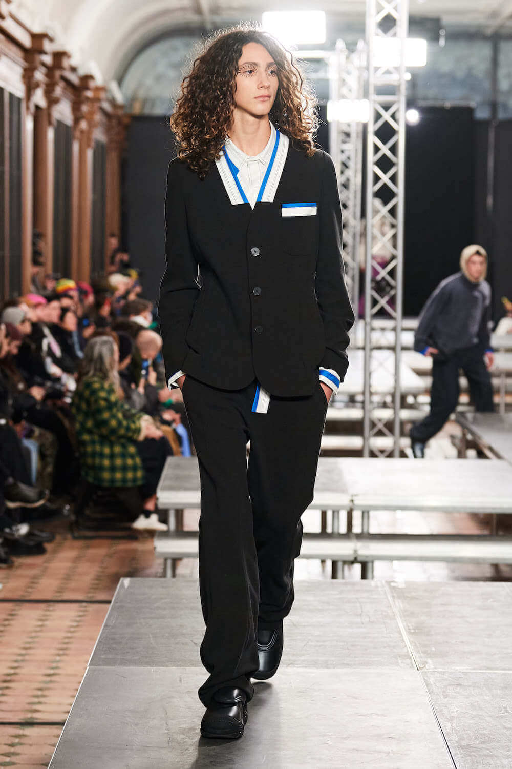 Kiko Kostadinov strived to make something new this season. Something that could simultaneously be turbulent, unsettled and vying for release, whilst also thriving inside the restrictive citadel of “menswear”. Chiselling away at its edges, Kostadinov applied a revisionist slant to four forgotten figures of the avant-garde Italian womenswear design canon. The unsung influences of French-born designer Anne-Marie Beretta (who designed Max Mara’s distinctive 101801 camel coat), Milanese titan (by the late Mariuccia Mandelli), the American costume designer Irene Lentz and the Roman couturier sisters Sorelle Fontana, mingled with gestures from the graduate collection of Laura and Deanna Fanning – Kostadinov’s closest collaborators – who design the brand’s womenswear line.