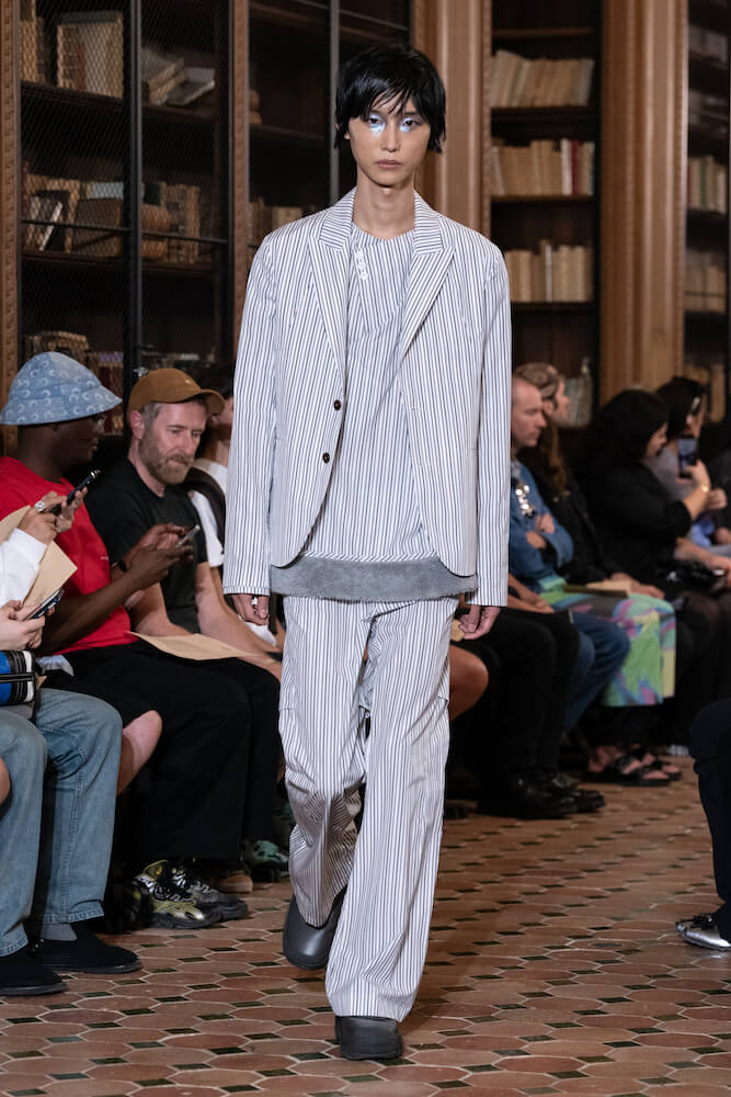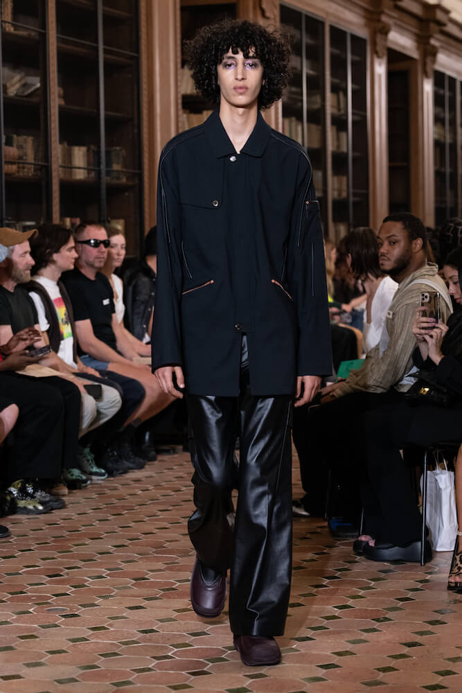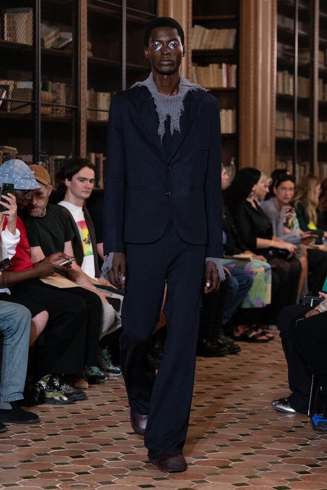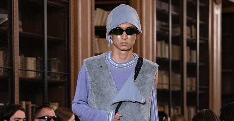 Confined behind metal grates within the Lycée Henry VI, dusty bookshelves weighted by historic volumes surrounded the Kiko Kostadinov catwalk. The occasion was the London-based eponymous label’s first-ever showing on Paresian soil and headed by Kostadinov himself, effortlessly blended sportswear with workwear and masterful tailoring for a perfectly pragmatic menswear offering. With an undeniable knack for interlocking references to historical movements and the literature of centuries come and gone, the spring/summer 2023 collection enters a bid to rewrite history.