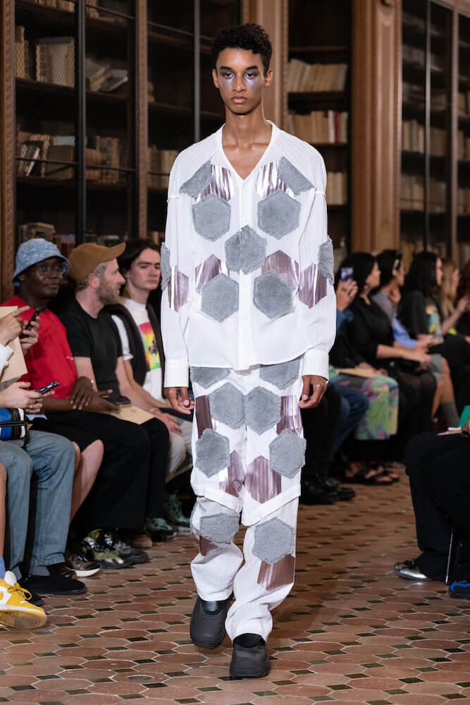 As the promenade came to an end, Vietnamese artist Dahn Võ’s criticism of America and his reappropriation of Vietnamese history, in a sculpture called We The People, laid the groundwork for the foiled hexagonal ornamentation that infiltrated subversive suiting. Put plainly, if there was any lingering doubt that Kostadinov is a menswear maven of the highest regard, this summer edit surely puts it to rest.