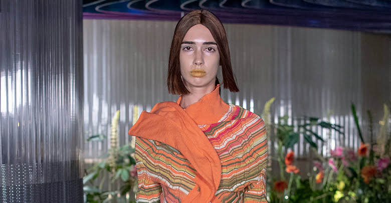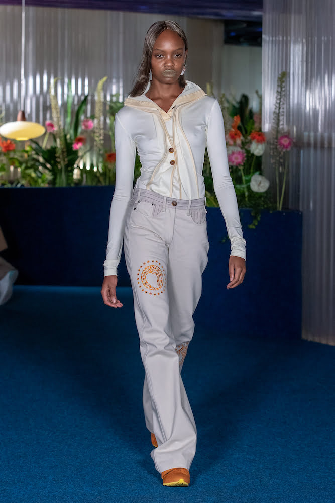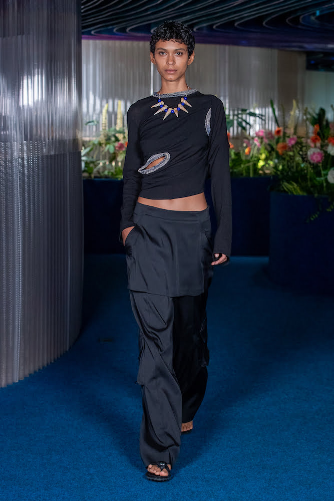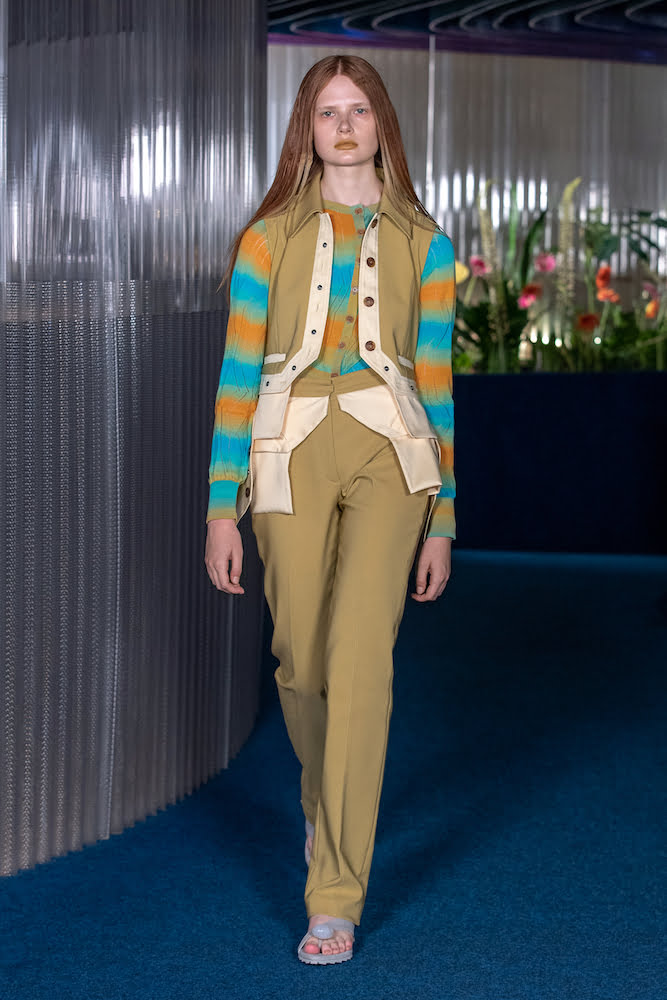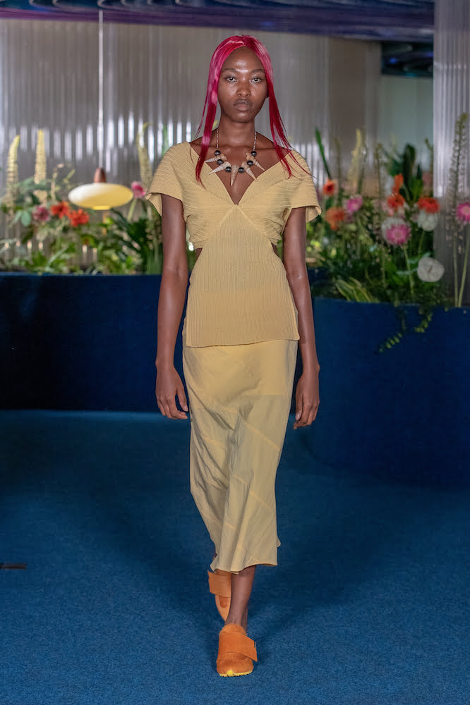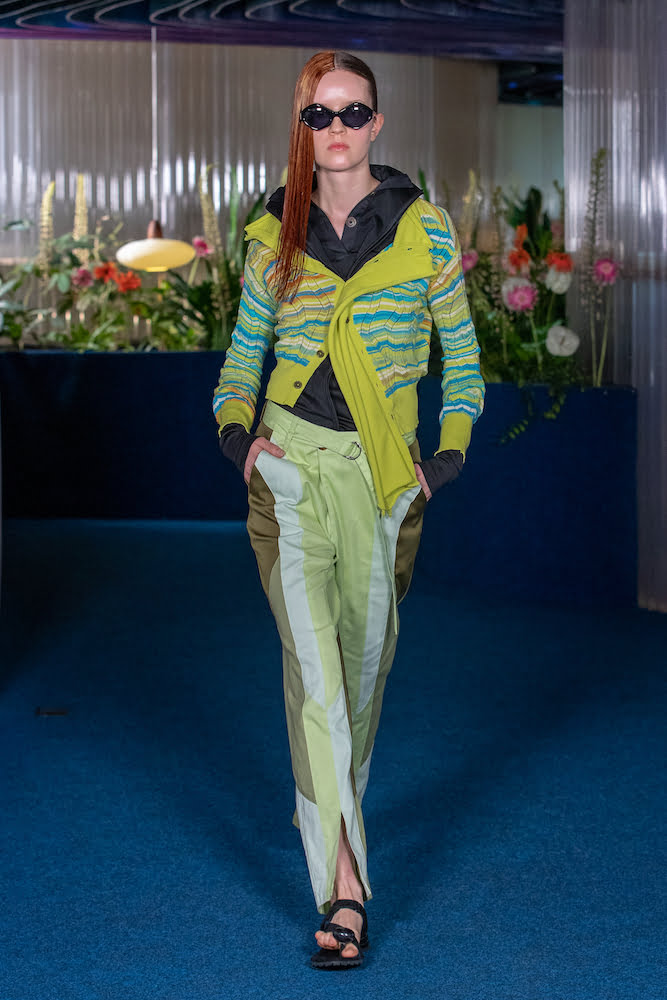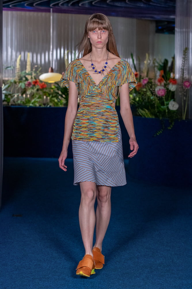 Thinking of salty skin, aloe vera-ed tan lines and toes coated in sand, the pair’s retrofuturistic womenswear – synonymous with geometric shapes and spiral pattern cutting – felt loose and free. Sunset hues glazed space-dyed ribbed cardigans, which came asymmetric, turned upside down and held in rippled formations like a crisp towel on damp skin – worn over satin slip dresses with knitted cut-outs that looked coral-like. Elsewhere, figure-hugging “bootleg” jeans and chiffon twinsets printed with Australian daisies felt made for places like Barcelona, where you can emerge from the beach and head straight into the bustling inner-city.