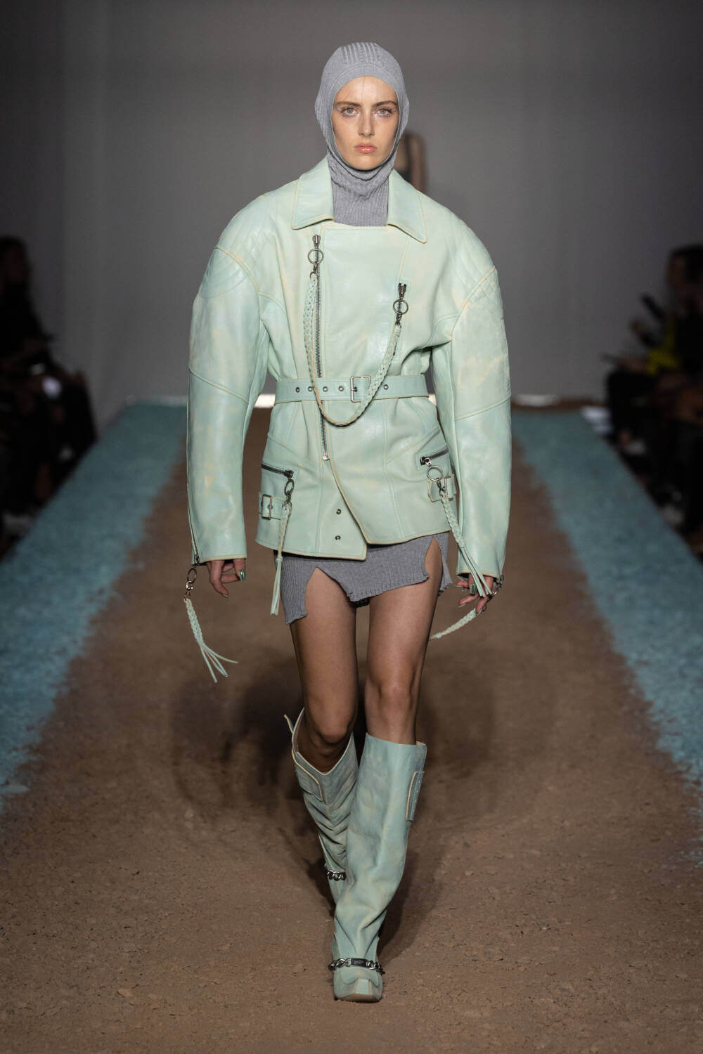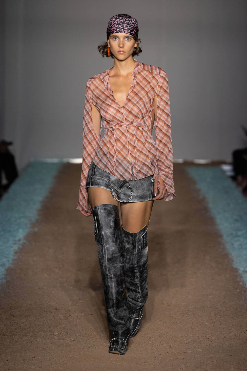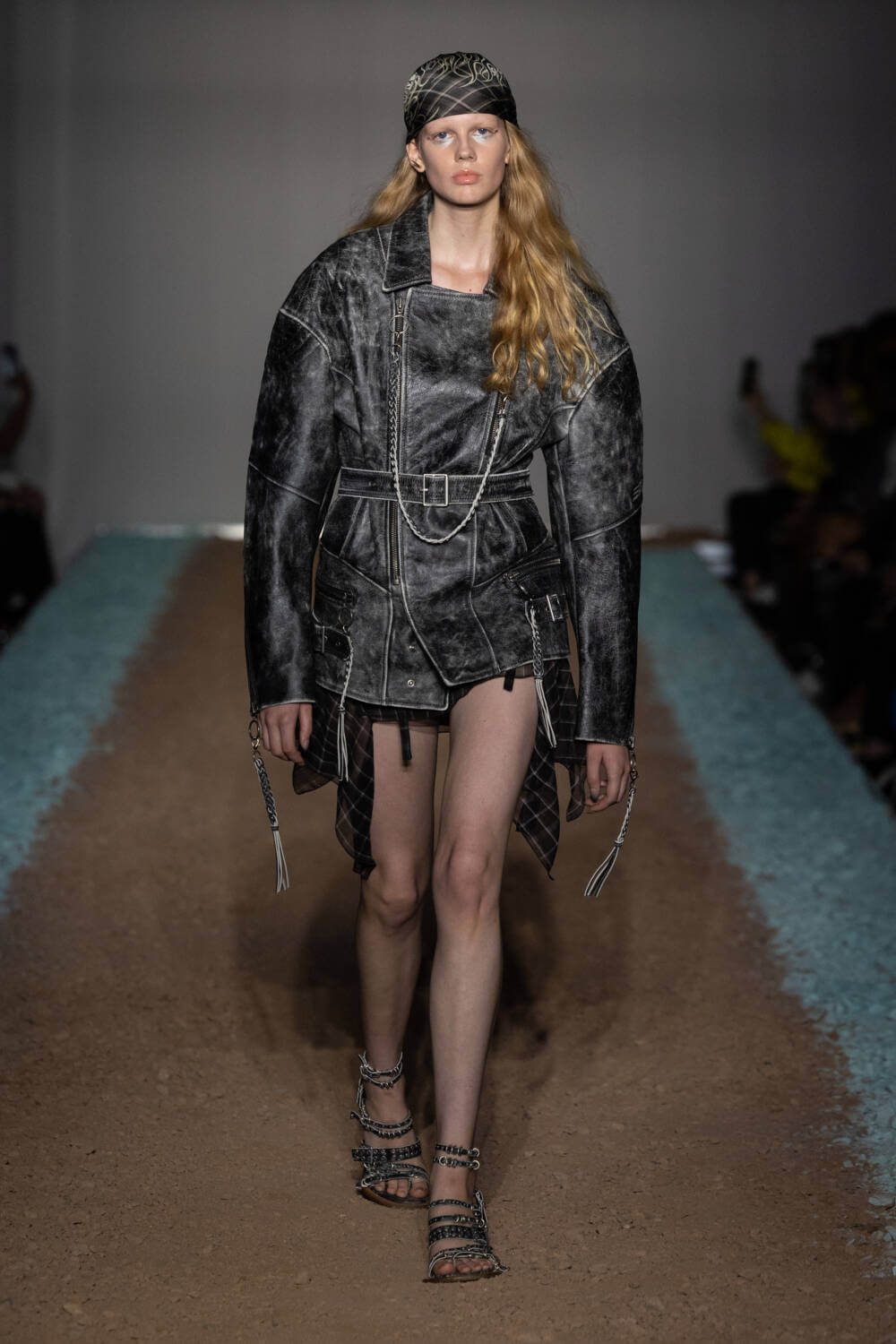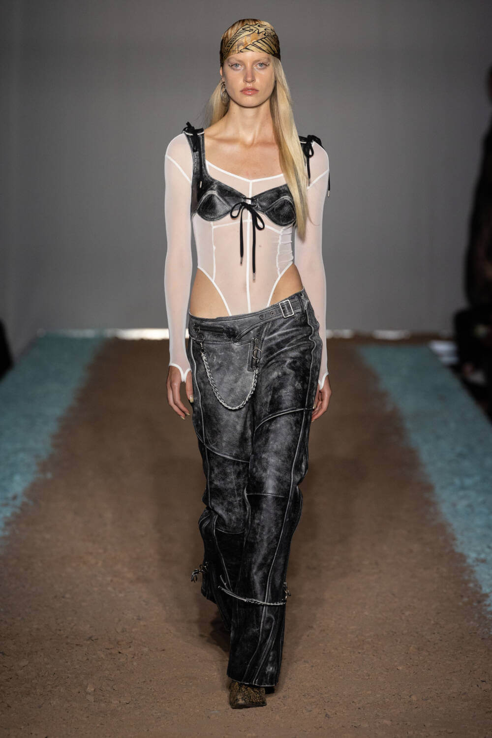 KNWLS designers Charlotte Knowles and Alexandre Arsenault are cruising firmly in the fast lane. Freshly following their stellar team-up with Jean Paul Gaultier, the design duo were back on the London Fashion Week schedule after a season away from the catwalk. This time, the KWNLS girl didn’t just have a need for speed; she was a full-blown petrol head. She came clad in the brand’s armour-like corsets, rustic-hued bodysuits and tye-dye T-shirts and skin-tight trousers that looked like they’d been baked under the intense sun. The brand has a fierce, global following, who will undoubtedly be won over with this season’s cracked leather jackets with “quarter-back shoulders”, as well as the brand’s Fang and Razr bags. It wasn’t all pedal to the metal, though. A black wrap-around evening dress, worn by Mia Khalifa, proved the brand’s prowess for high-octane fashion can be met with more traditionally glamorous wears, too. The KNWLS universe continues to expand.