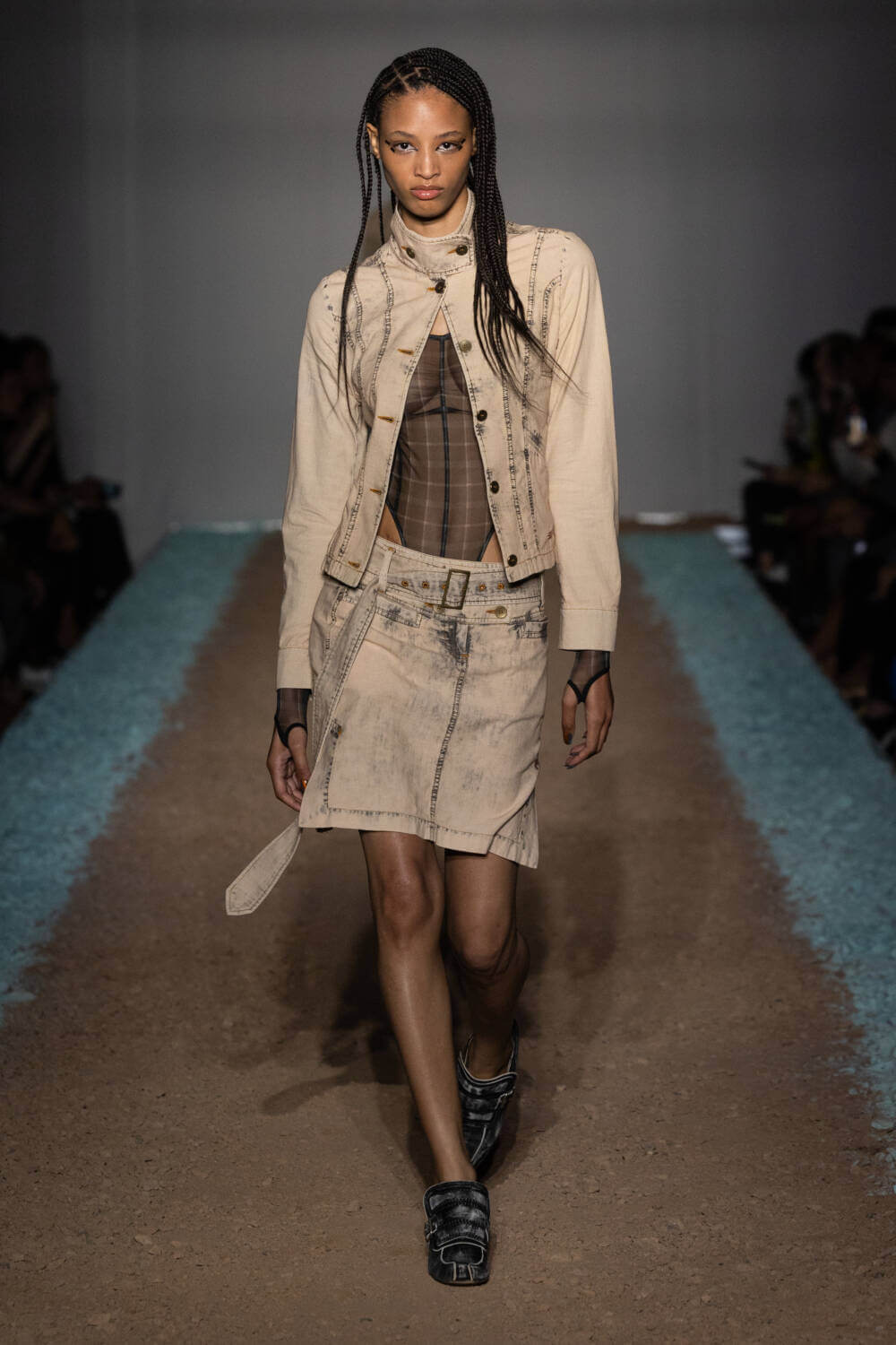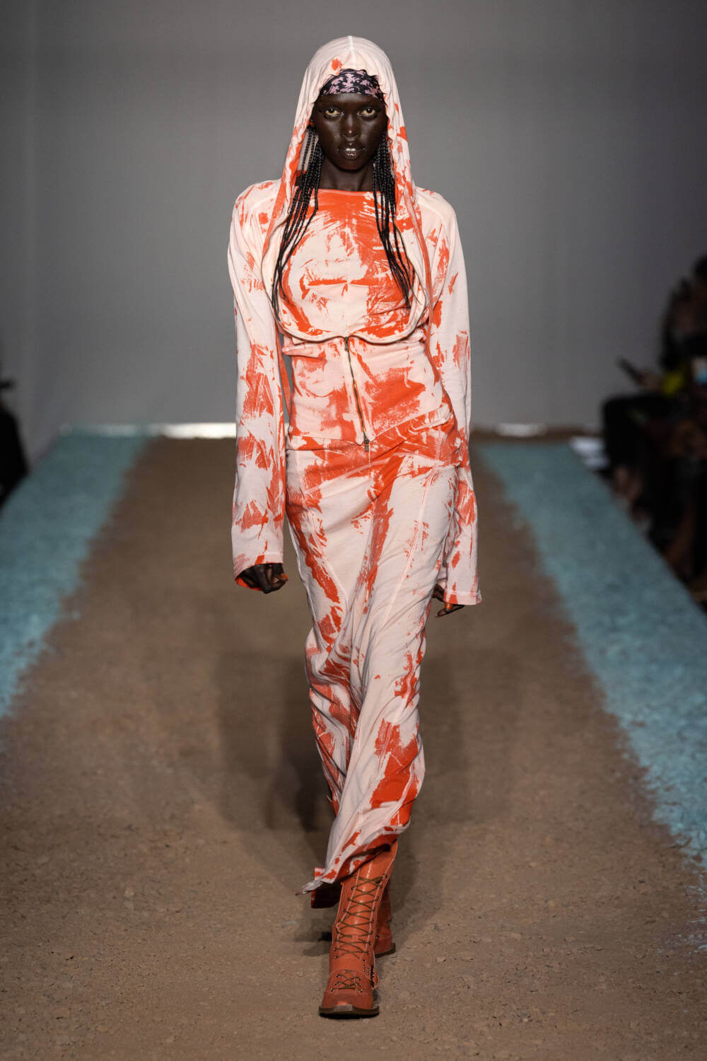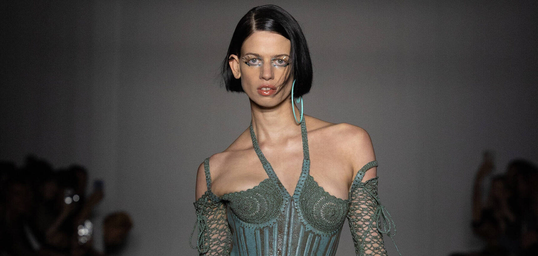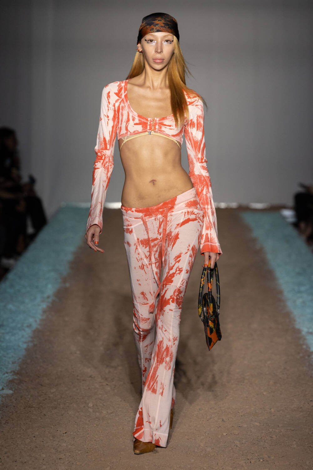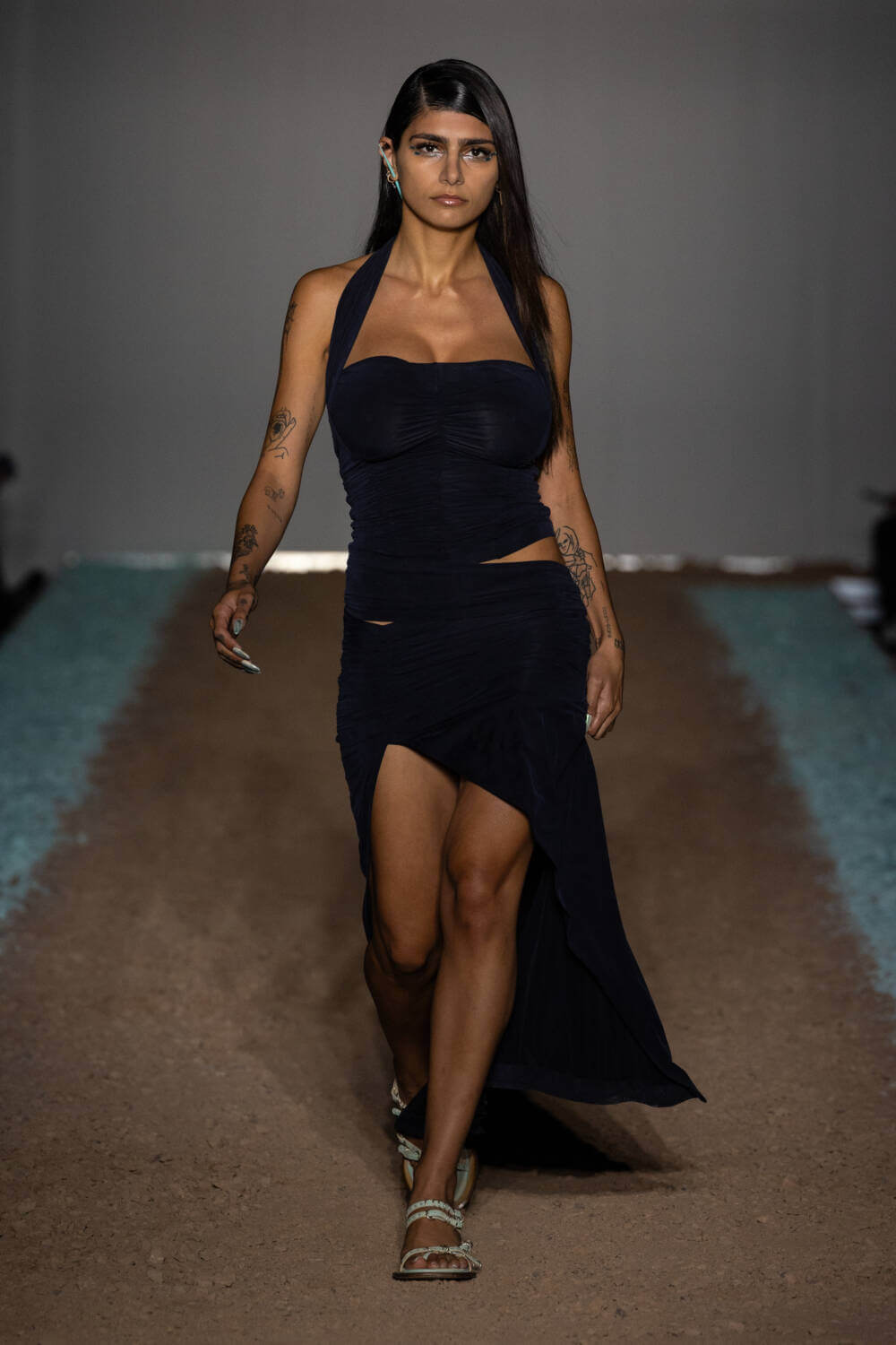 KNWLS designers Charlotte Knowles and Alexandre Arsenault are cruising firmly in the fast lane. Freshly following their stellar team-up with Jean Paul Gaultier, the design duo were back on the London Fashion Week schedule after a season away from the catwalk. This time, the KWNLS girl didn’t just have a need for speed; she was a full-blown petrol head. She came clad in the brand’s armour-like corsets, rustic-hued bodysuits and tye-dye T-shirts and skin-tight trousers that looked like they’d been baked under the intense sun. The brand has a fierce, global following, who will undoubtedly be won over with this season’s cracked leather jackets with “quarter-back shoulders”, as well as the brand’s Fang and Razr bags. It wasn’t all pedal to the metal, though. A black wrap-around evening dress, worn by Mia Khalifa, proved the brand’s prowess for high-octane fashion can be met with more traditionally glamorous wears, too. The KNWLS universe continues to expand.
