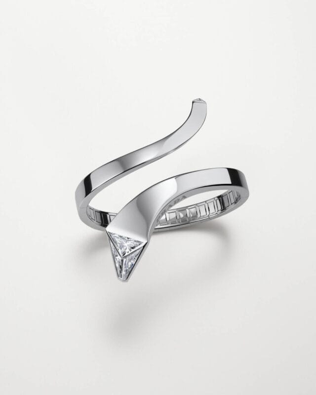 Unlike other brands that have embraced lab grown diamonds as an eco-friendly alternative or less-expensive competitor to natural ones, Prada has all but bypassed “emotional” connections and gone straight for the technical jugular. Cue the debut of the “Prada cut”, a lab grown faceted triangular diamond – the house logo reflected in a whole new light.
