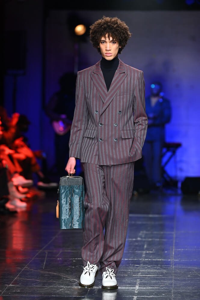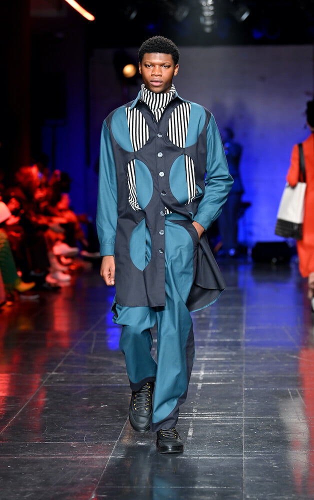 Last season, it was the music that carried Labrum London’s collection through fashion week, but this time it rallied around a borderless verb, an instinctual art, a form of expression: movement. Exploring real-time examples of migration and diaspora, creative director Foday Dumbuya, with Dazed editor-in-chief Ibrahim Kamara, established a narrative using motifs and colours representative of West African lifestyle. Dumbuya was also inspired by museum archives at the V&A and artist Jacob Lawrence’s synthetic cubism ablaze with colour in The Migration Series. Looking at the essence of human survival, the collection was given the name, Poetics of Movement.