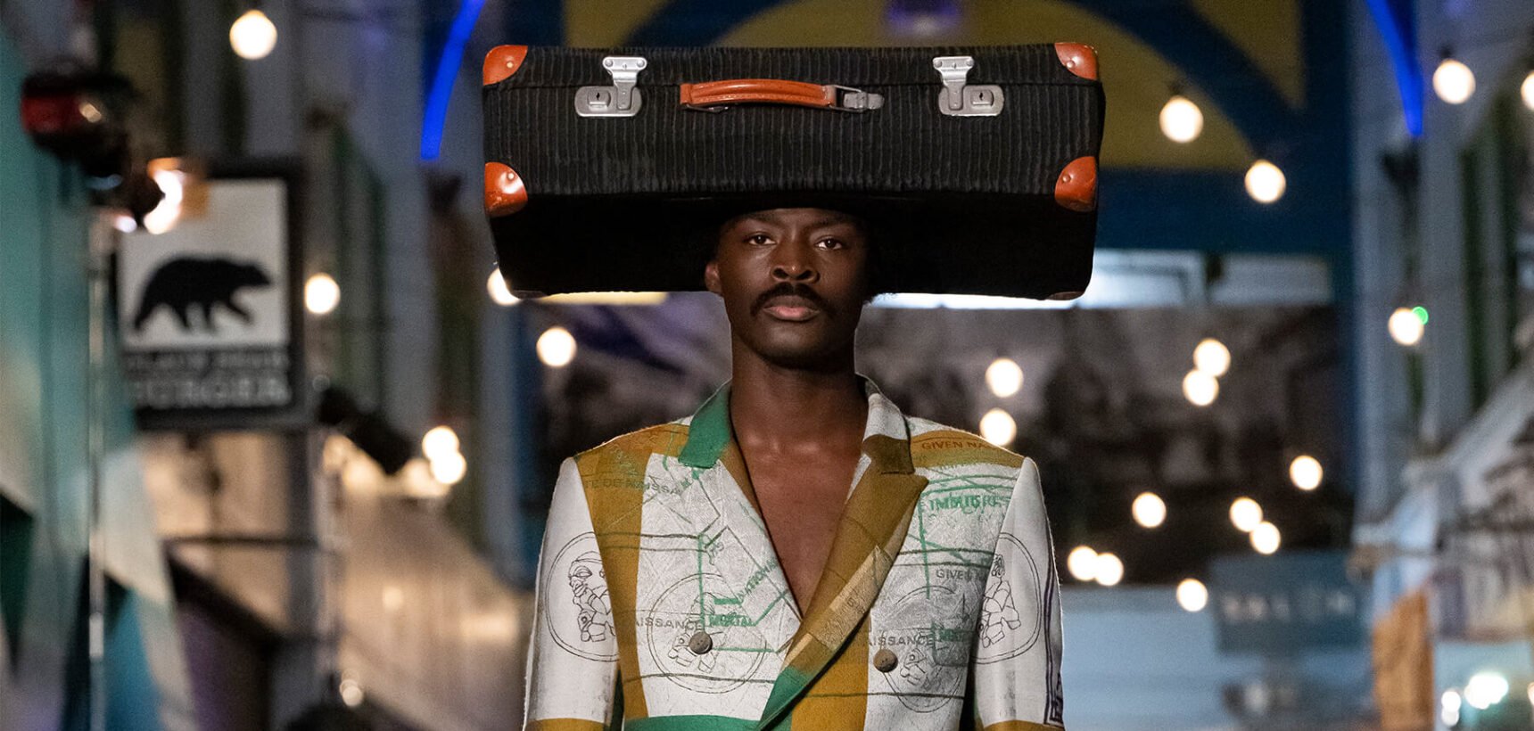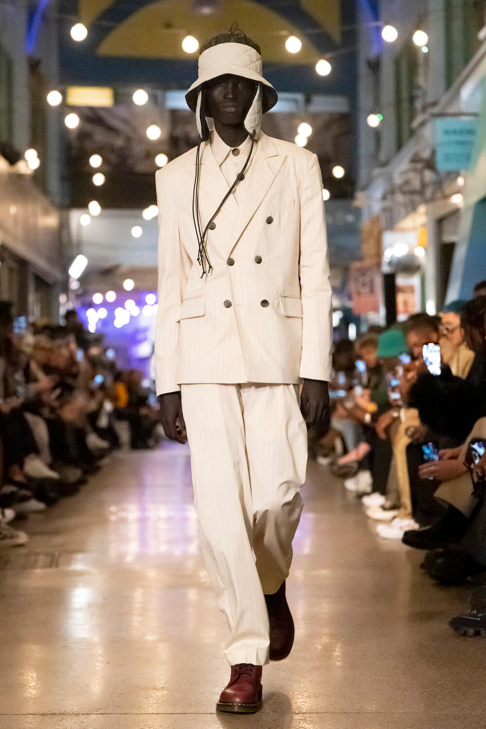 So, from the beautiful cultural tapestry of Brixton Village emerged bomber jackets, baggy trousers and a Maya Angelou-inspired trench coat. Taking cues from previous seasons, Dumbuya’s penchant for a well-made suit remained central to his design language, but the palette was much more muted. Custom fabrics were painted olive, brown, grape and navy, and elevated by lilac, mustard and ivory accents. Elsewhere jacquard suits were splattered with stamps; a badged varsity jacket with removable appliqués was anchored by the label’s signature Nomoli totem; raffia hats by Lucy Barlow doubled as drawstring bags; and one-of-a-kind quilted overcoats by Masha Guyard were part of a community project called Each One, Stitch One. Labrum’s ongoing exploration of migration was poignantly symbolised through the use of true travel documents – his mother and father’s old passports specifically – celebrating the countless forms of communication we have at hand to keep in touch with the ones we love. For Labrum, communication really is key.