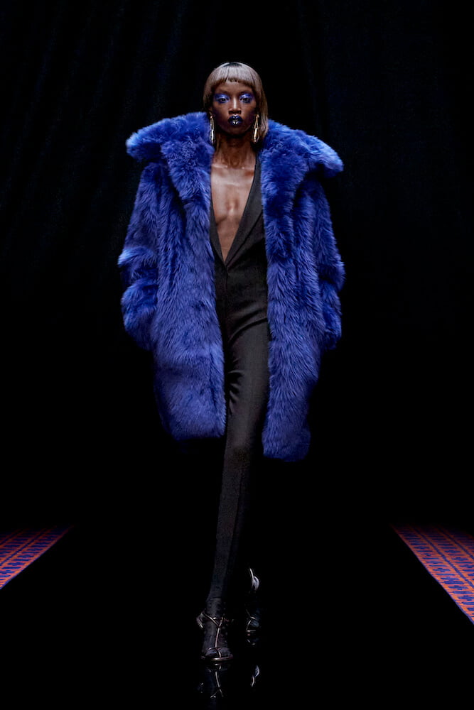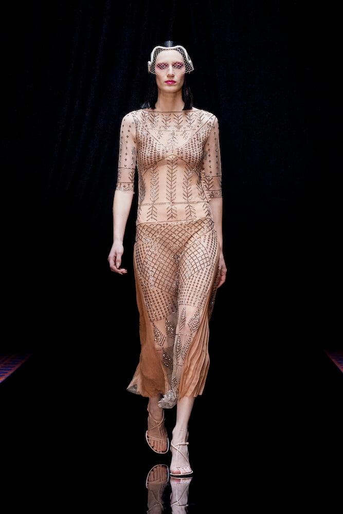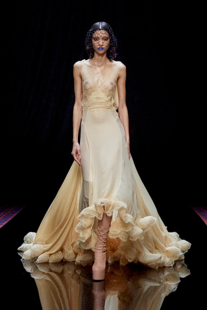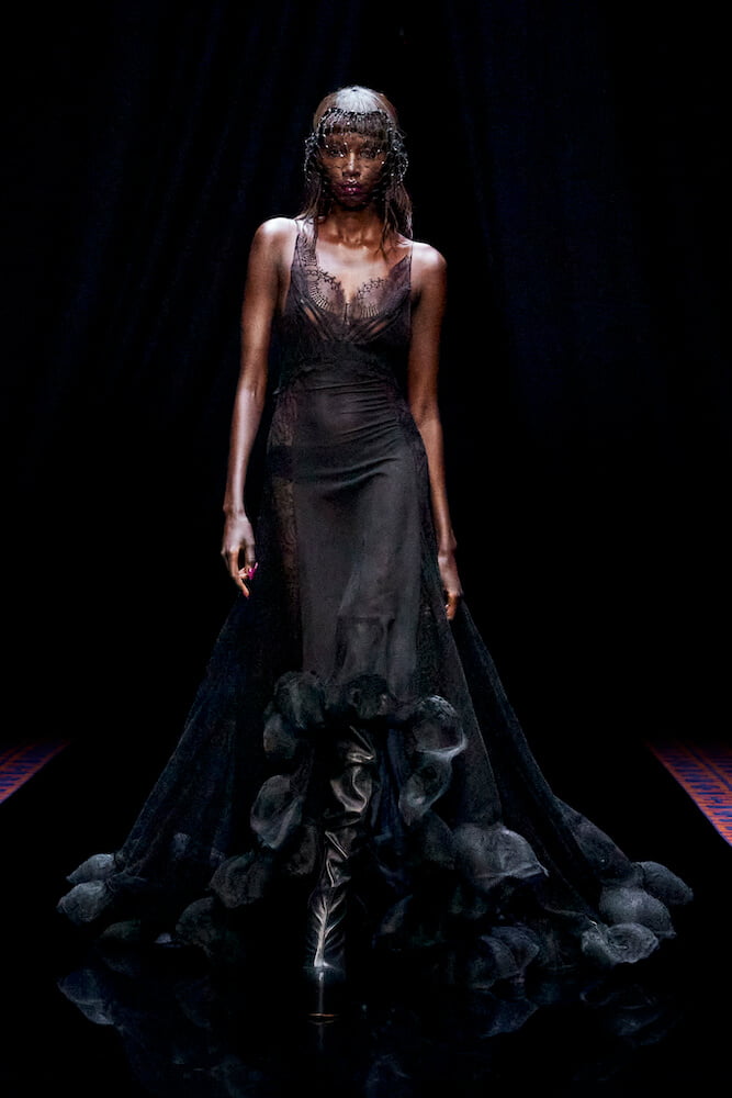 While a cat’s head was translated to the top-handle of the Smile bag and gold jewellery felt archaic, high-octane old Hollywood glamour appeared in fragile, silk and lace dresses, voluminous tulle skirting and sleek tuxedos. Consulting the archives of Jeanne Lanvin, creative director Bruno Sialelli played with the paradox of contradicting textures, transparencies and eras. Asymmetric cocktail dresses were sharply tailored or extravagantly embroidered and bedazzled. Elsewhere, cashmere knits melted into heavy-weight silk panné velvet that was bonded to jersey, smooth like buttermilk.