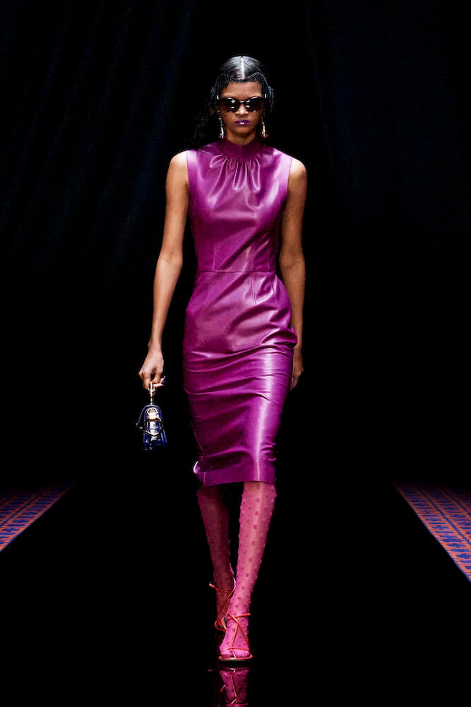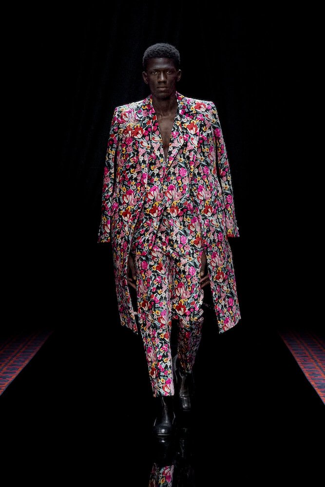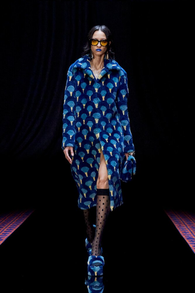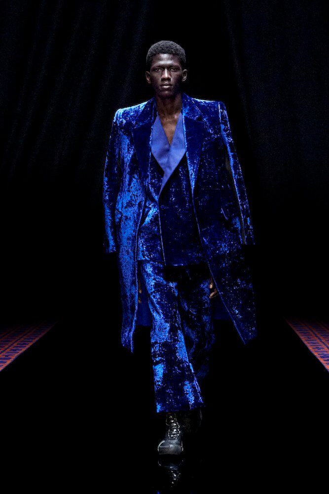 From start to finish, vibrant aquamarine and fuchsia mingled with bejewelled tulip blooms in crimson and cobalt that were created with Judith Leiber as part of an ongoing collaboration. Covered in crushed velvet and donning polka dot stockings that came paired with platform Mary Janes, models starred in a six minute short film, rather than a classic catwalk, and it felt utterly referent to Film Noir. The smoke and mirrors illusion of the cinema, especially during the interwar period of the early 20th century, served as another source of inspiration this season. But in truth, it felt evocative of the conflicted, post-pandemic world we live in today.