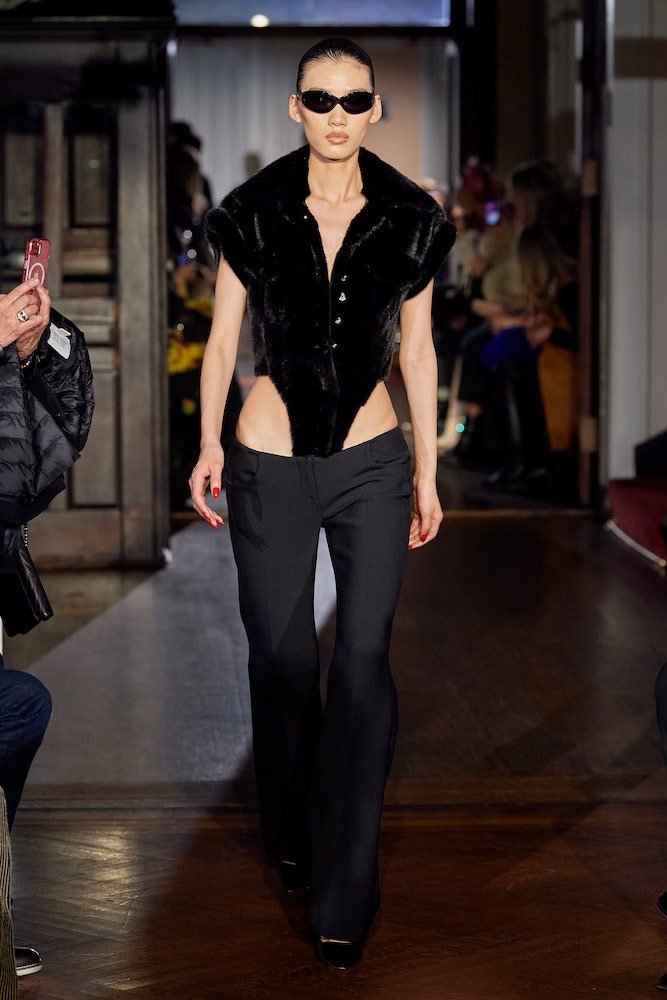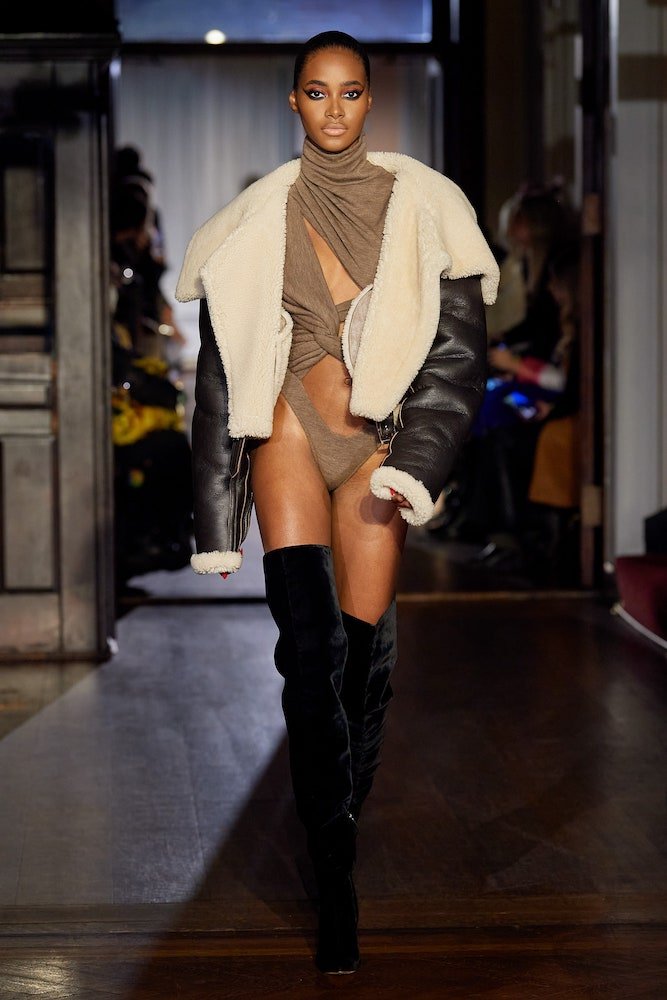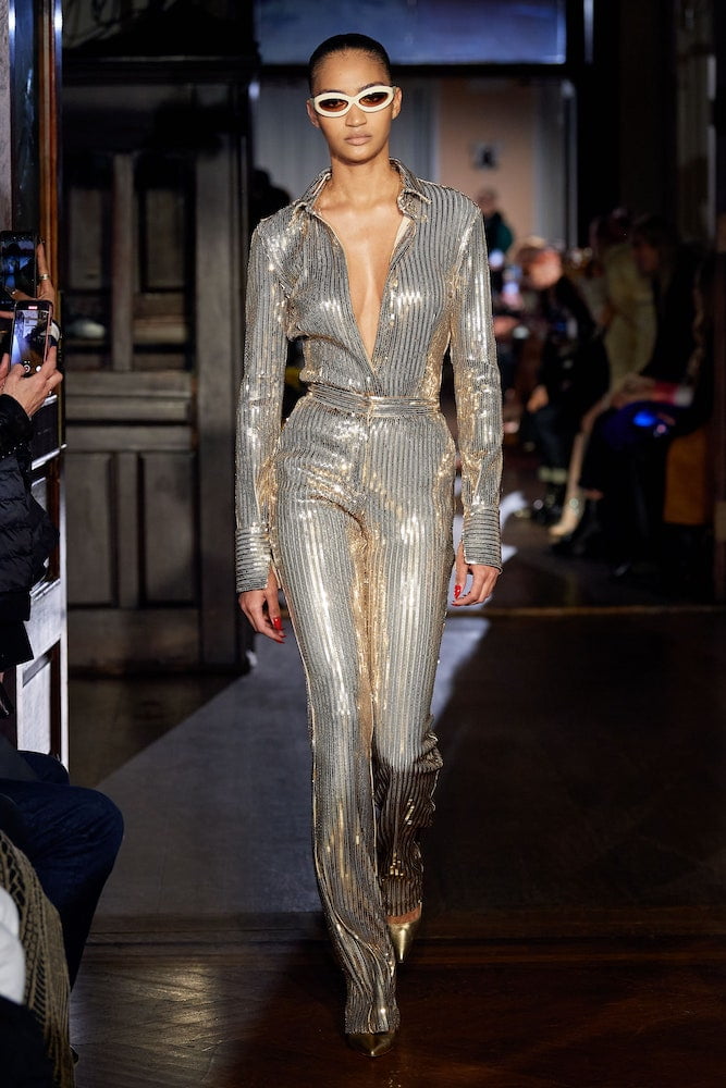 As saucy as ever, scantily dressed girls followed suit in a range of daring ‘fits. Think micro-mini skirts that barely covered the bum, naughty corsetry, low-slung, expertly-tailored suit trousers, catsuits, bodysuits and boiler suits covered in glitter and crafted from lace, mesh and fishnet. 55 looks strong, the vampy collection adopted blood red and scarlet hues to keep it raunchy while burnt orange and golden browns brought the heat. Laced with steaming libido, the erogenous zones on display were the bread and butter of Smith’s sensual show – it was exposed hip-bones that brought the va-va-voom.
