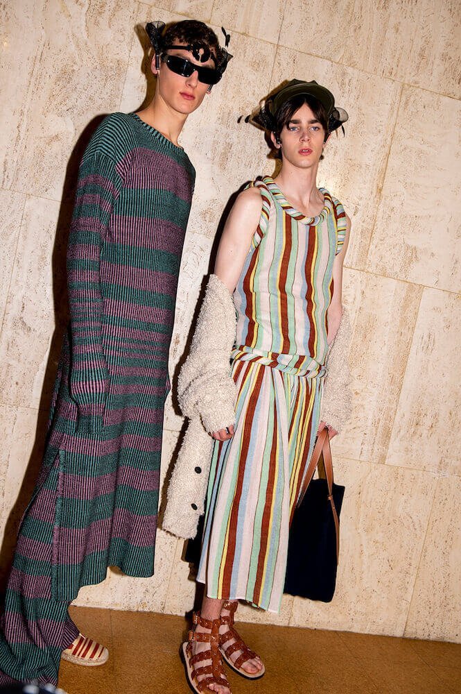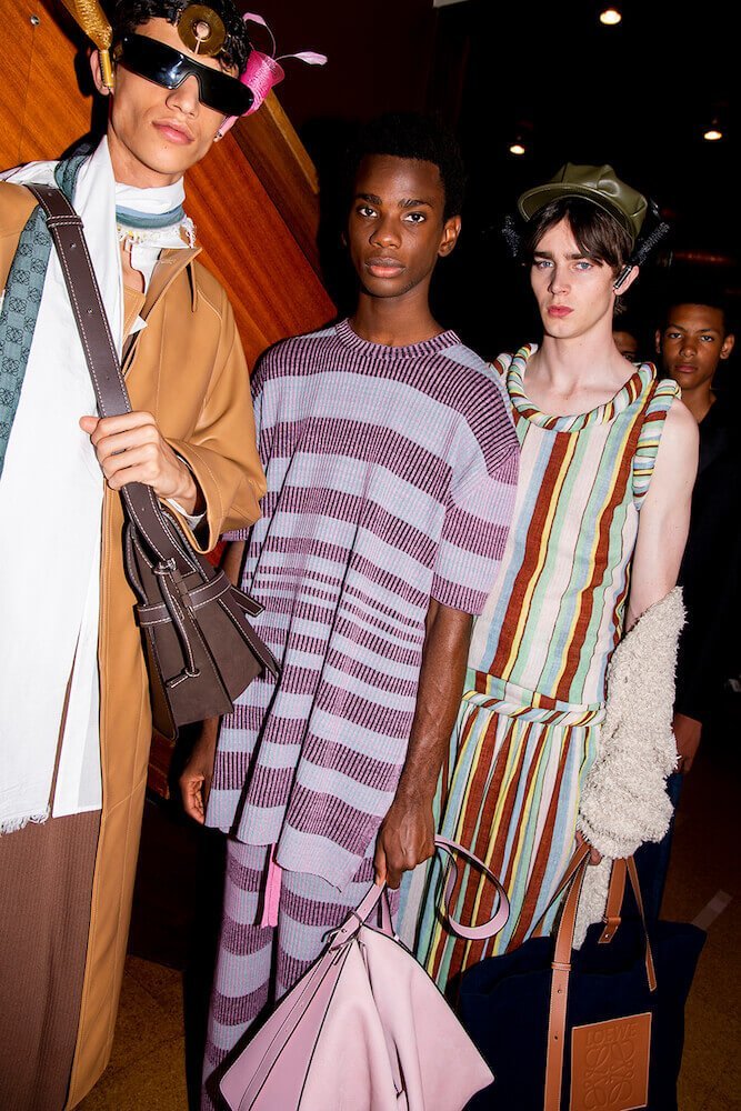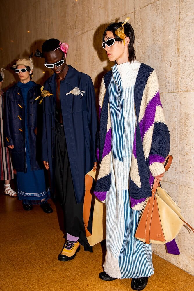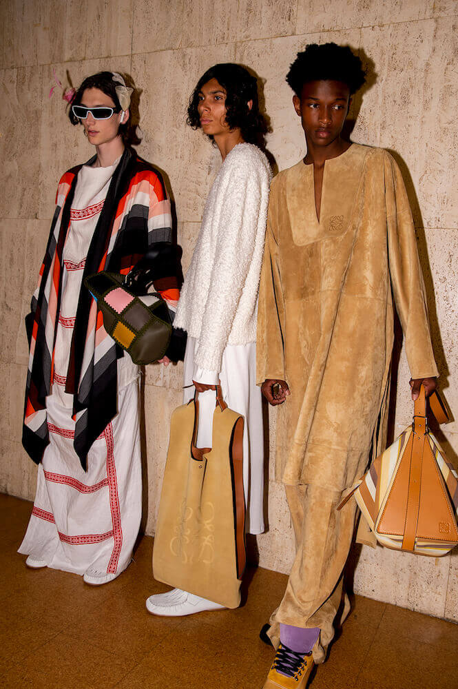 The knits were intermingled throughout. Blanket-like throws were worn over the shoulders; djellabas – one in navy cotton – will be a high summer hit for Loewe’s fans come August 2020. The bib-and brace of the artist’s studio came rendered in navy cotton with baggy patch-pockets and worn with a black shirt. This was, well, just completely, absolutely beautiful. To bags: a whole of host of great shapes – it’s Loewe – but the Puzzle bag in stripes, the same stripes on the long ribbed knits, was yet another winner.
