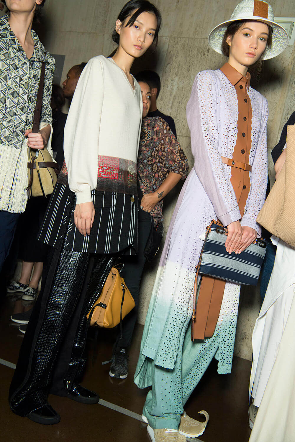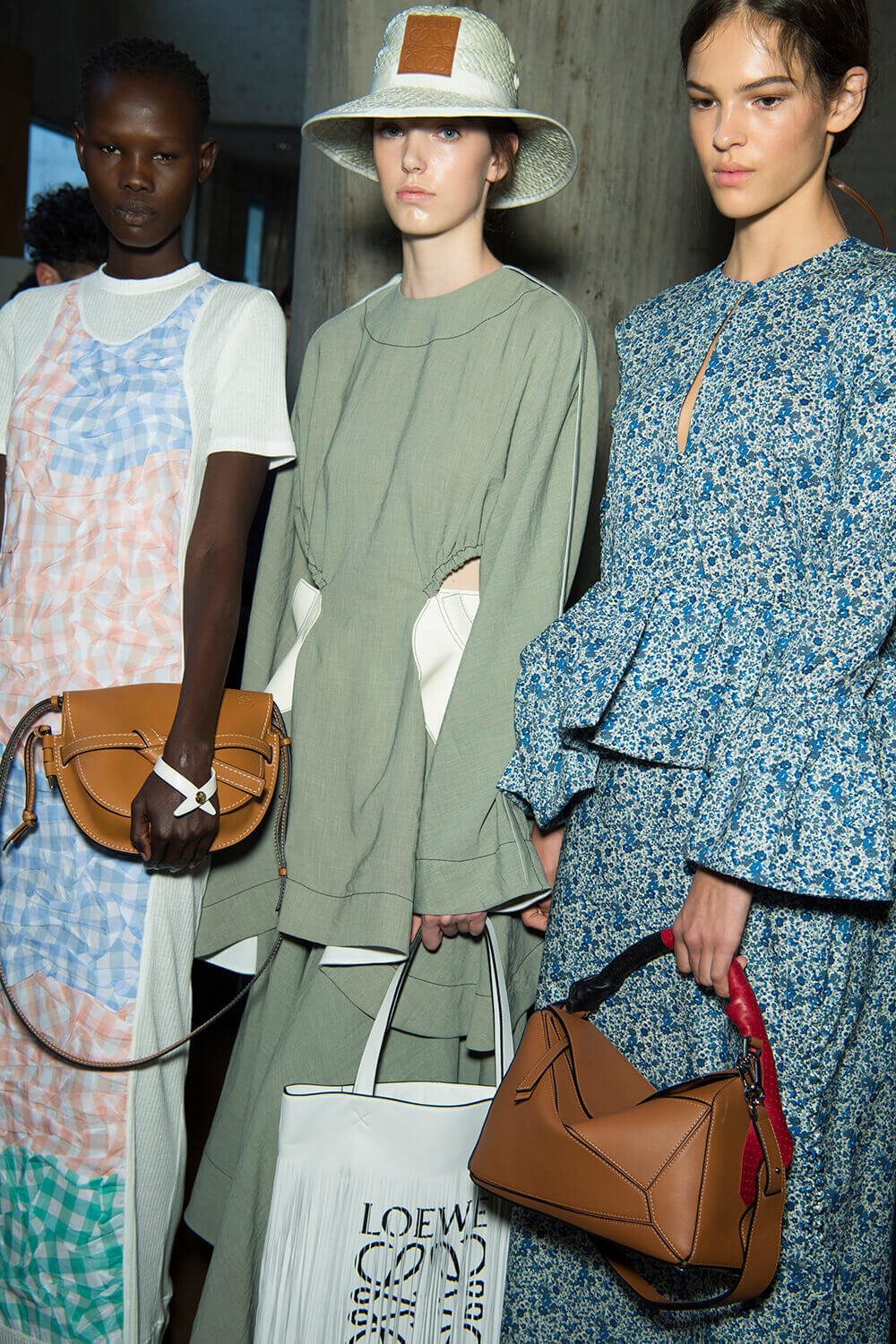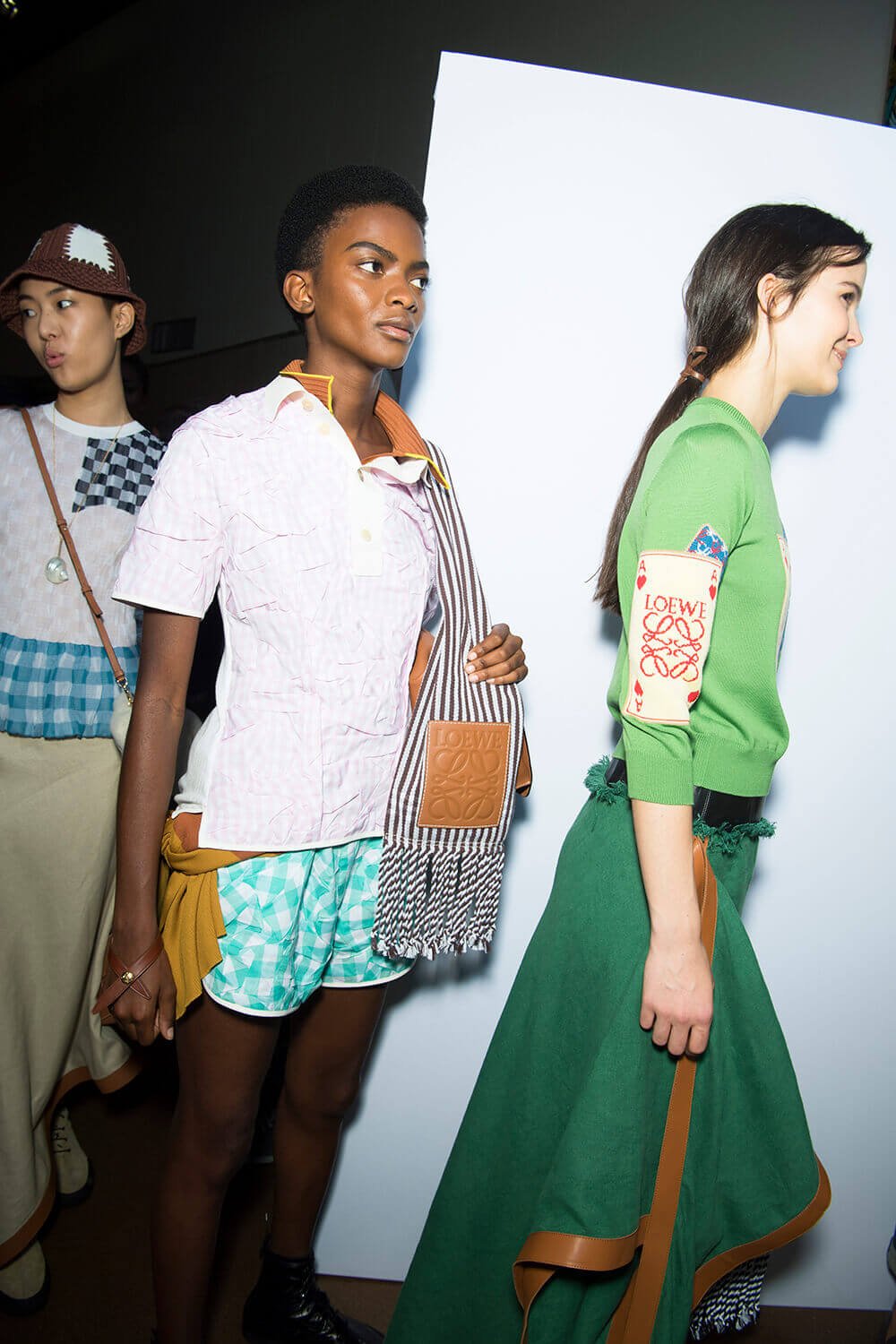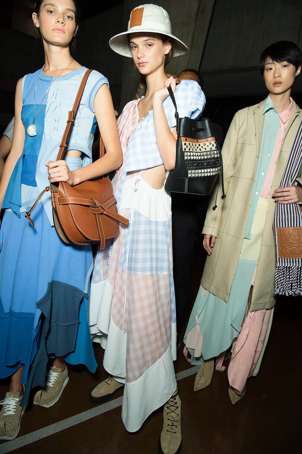 From the first dress out – a long white tee-dress with a superimposed crinkly and pastel patchwork pattern from a seemingly different dress – things got better and better. Intermixed were masculine and wider trouser looks, worn with roomy and or nipped jackets. One pair of trousers was patchwork quilt and a new take on Loewe’s commercially successful ‘Fisherman’ jeans.