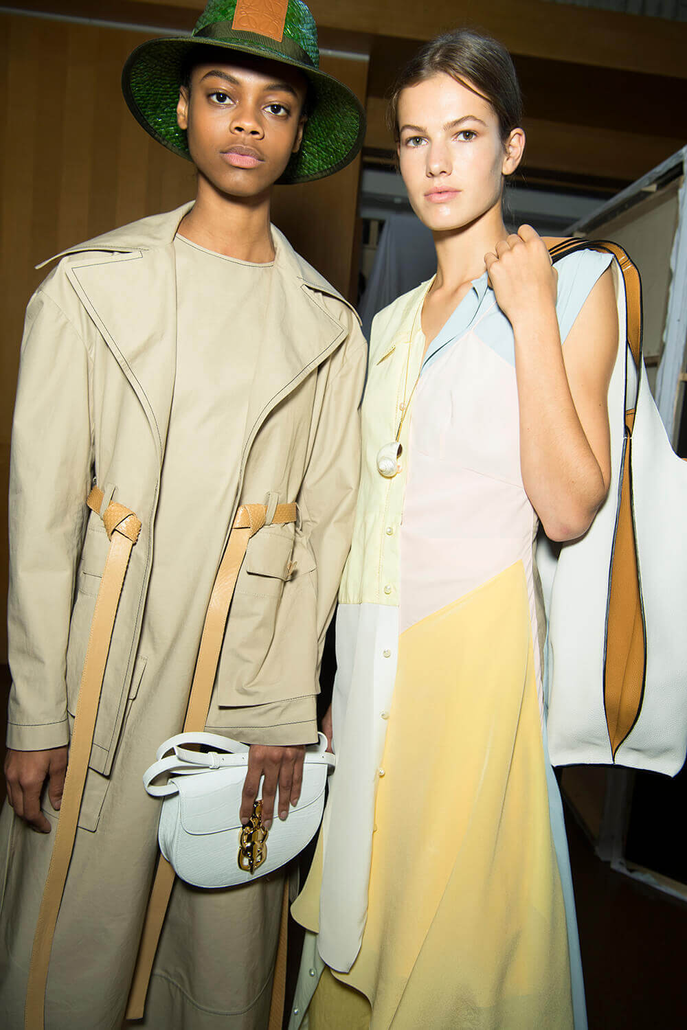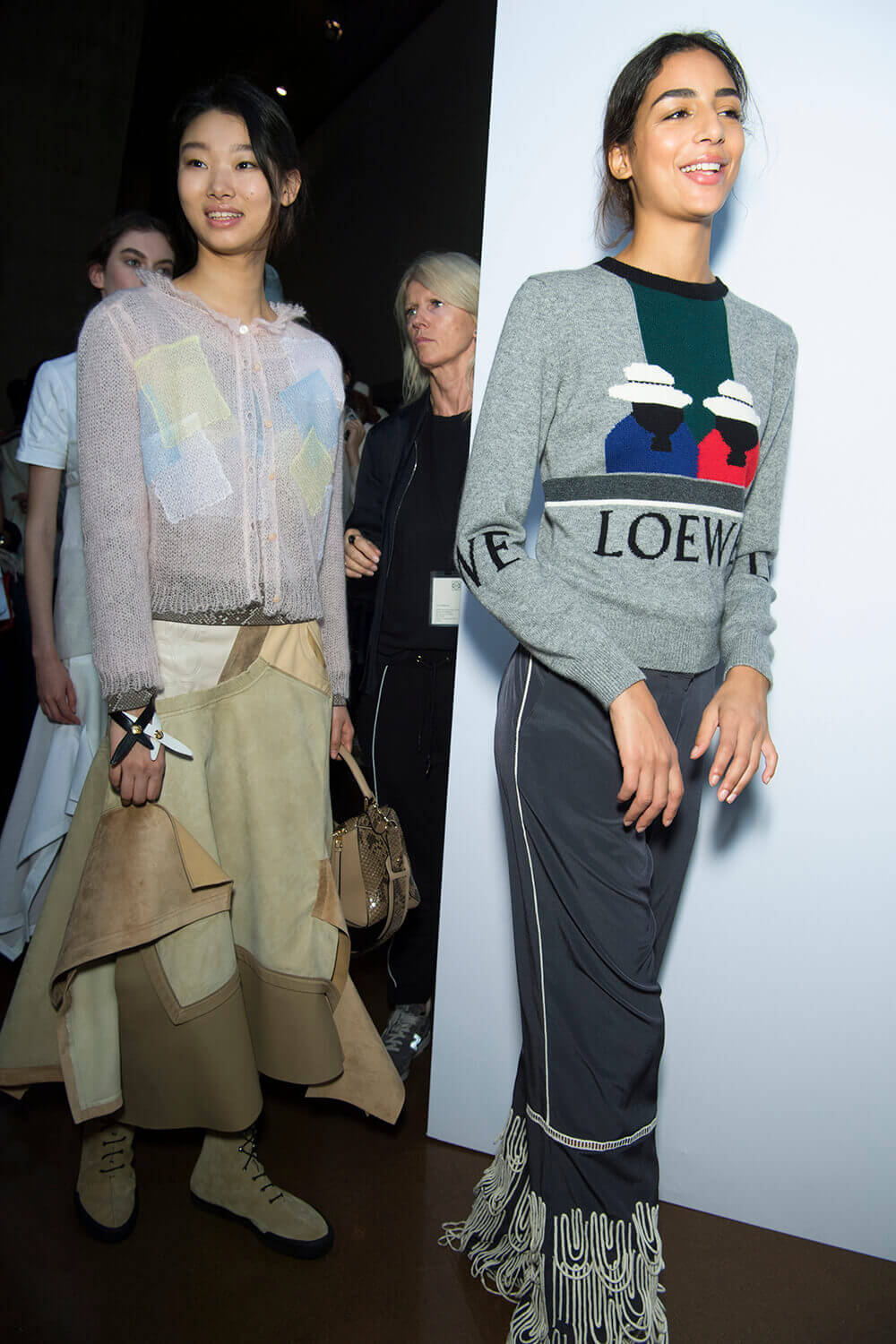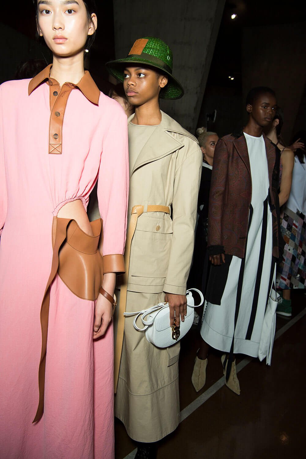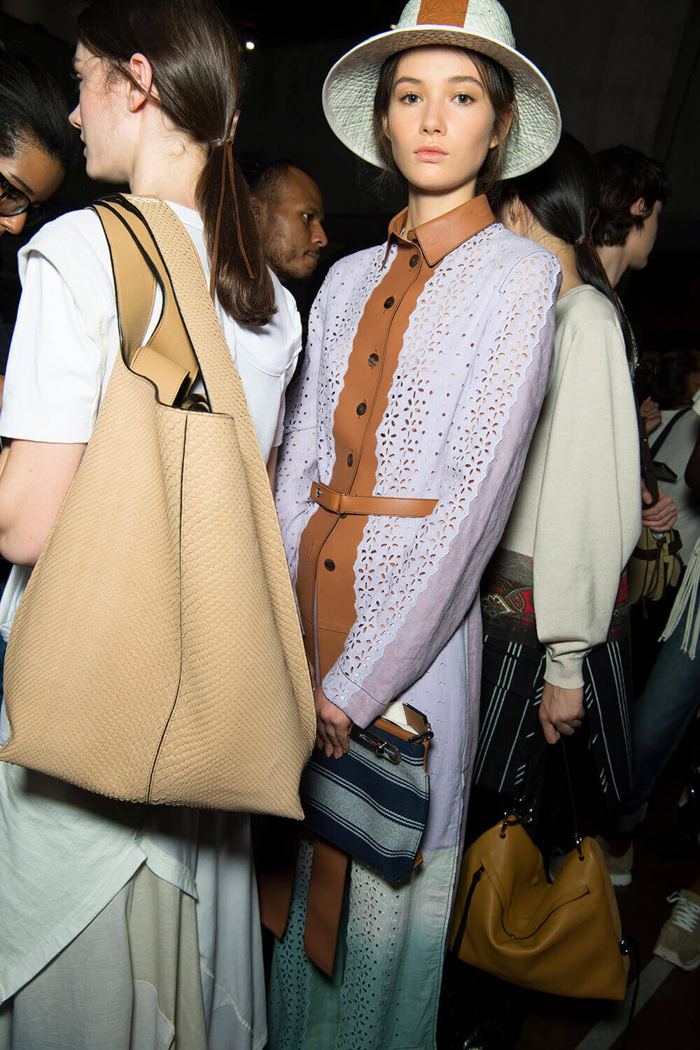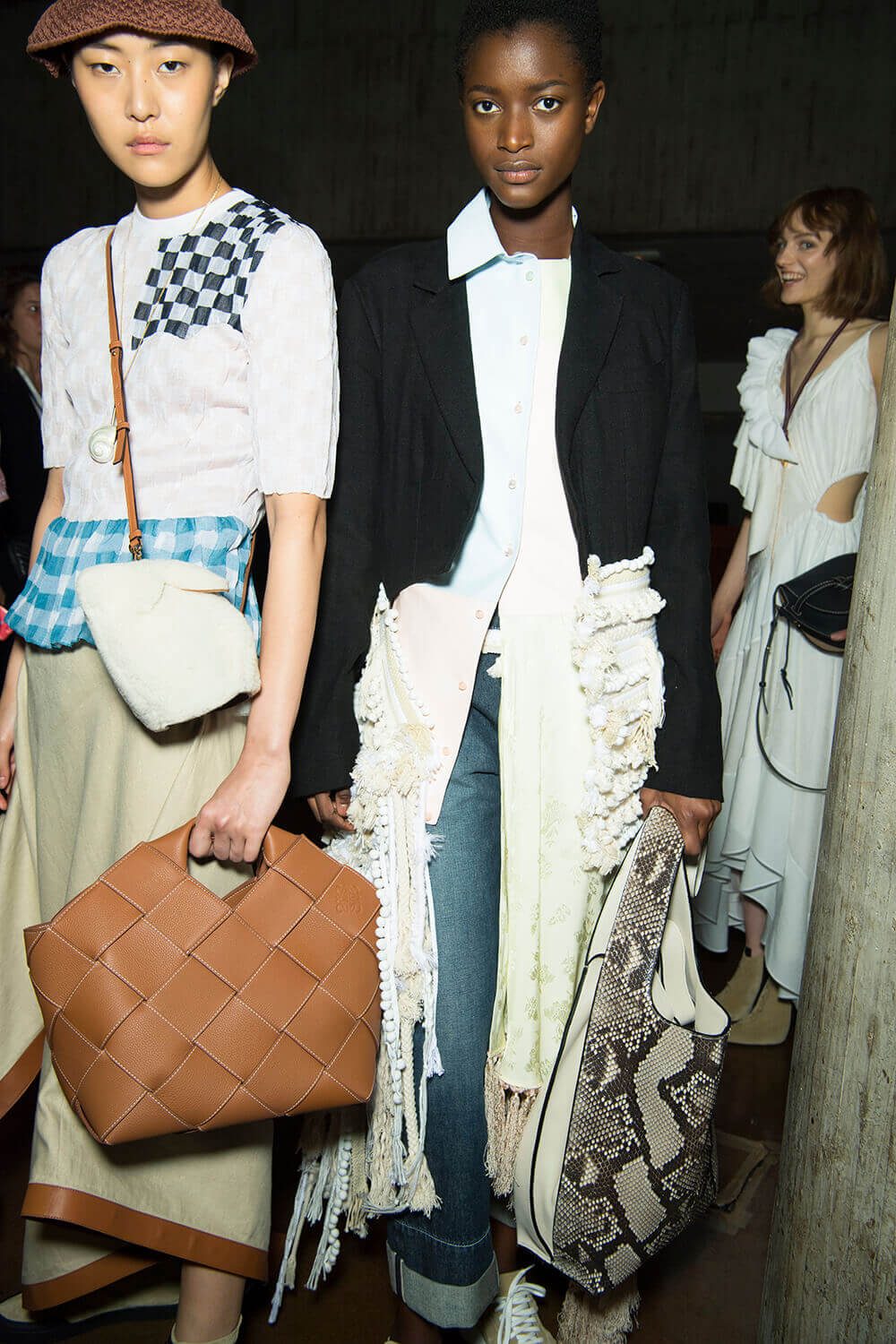 From the first dress out – a long white tee-dress with a superimposed crinkly and pastel patchwork pattern from a seemingly different dress – things got better and better. Intermixed were masculine and wider trouser looks, worn with roomy and or nipped jackets. One pair of trousers was patchwork quilt and a new take on Loewe’s commercially successful ‘Fisherman’ jeans.